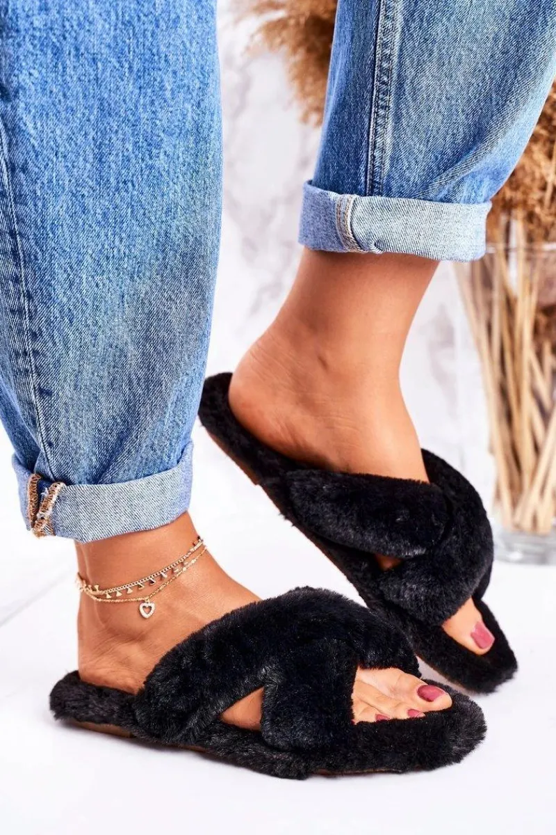 Kapcie Klasyczne>Boto Damskie Klapki Papcie Futrzane Czarne Cozy Time