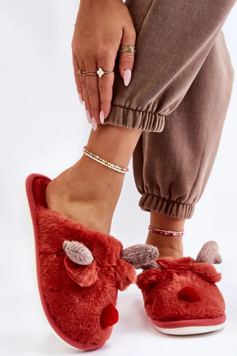 Piękny model papci damskich powinien zagościć w Twoim domu! Wykonane z miękkiego, futrzanego materiału. Ozdobione z przodu porożem, uszkami oraz noskiem z materiału. Klasyczny, wsuwany model został wewnątrz ocieplony futerkiem. Papcie osadzono na gumowej platformie. Świetny model na mroźne dni! Przy wyborze rozmiaru prosimy sugerować się tabelą rozmiarów.