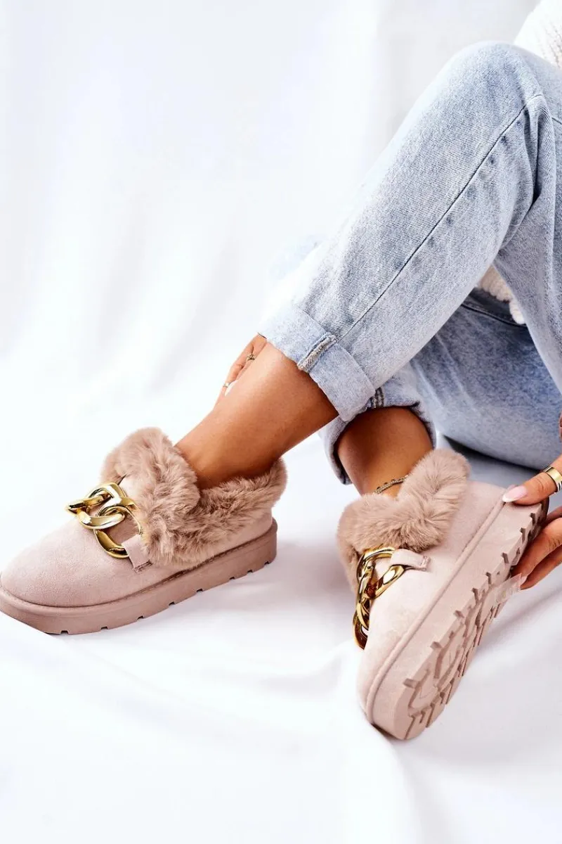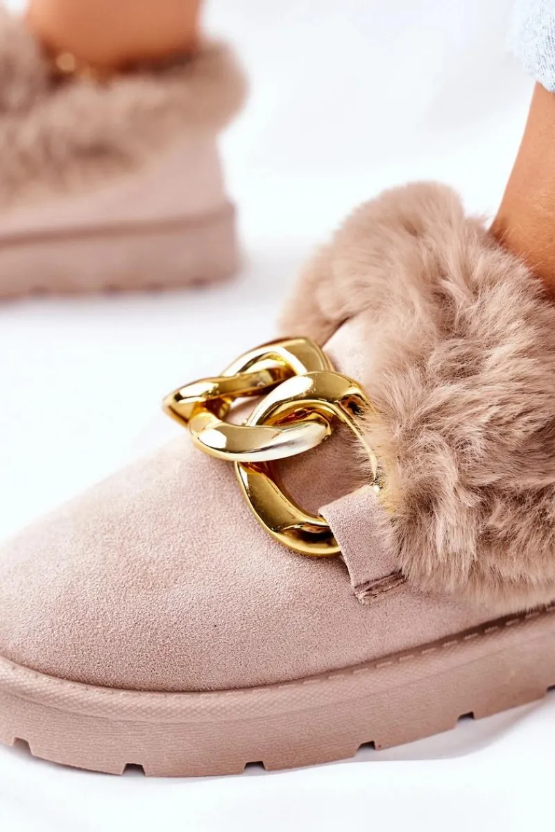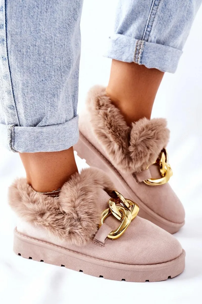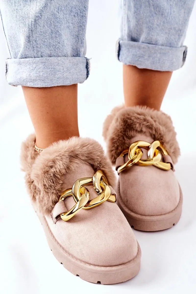 Tym razem coś dla domatorów, śledzących aktualne trendy mody i ceniących sobie komfort. Te wspaniałe papcie koniecznie muszą zagościć w Twojej kolekcji. Dzięki zdobieniu złotym łańcuchem wyglądają wprost cudownie. Klapki wykonane z miłego w dotyku syntetycznego futerka. Przy wyborze rozmiaru prosimy sugerować się tabelą rozmiarów.