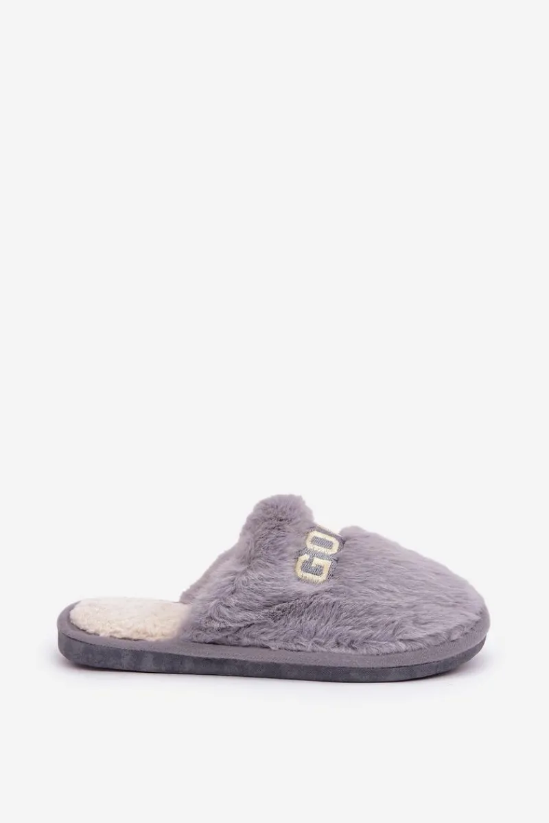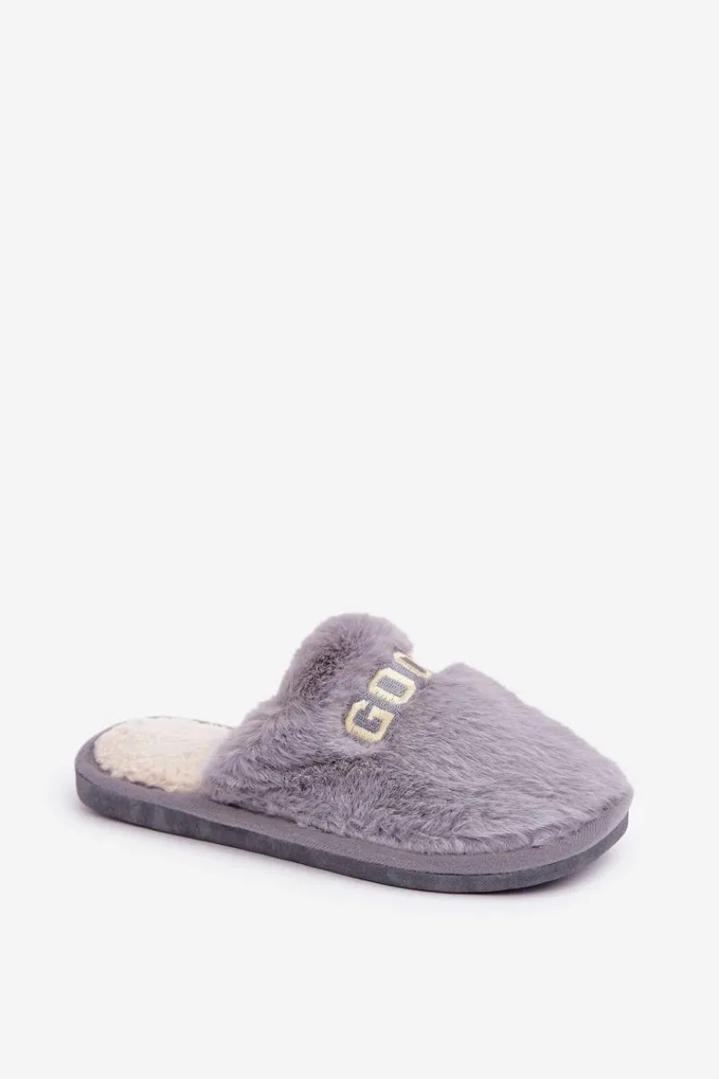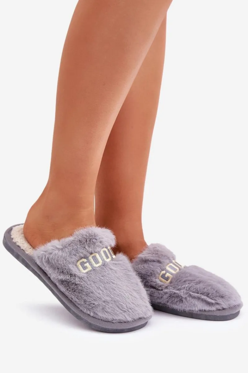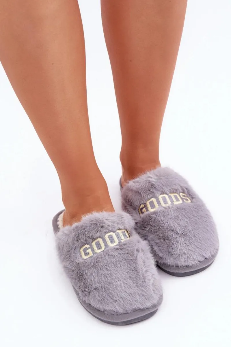 Kapcie damskie wykonane z miękkiego futerka, które zapewnia wyjątkowy komfort i ciepło. Model ozdobiony stylowym napisem, który dodaje nowoczesnego charakteru. Idealne na chłodne dni, doskonale sprawdzą się jako wygodne obuwie domowe, łącząc funkcjonalność z modnym wyglądem. Przy wyborze rozmiaru prosimy kierować tabelą rozmiarów.