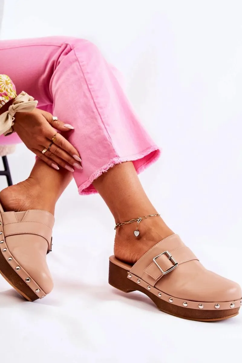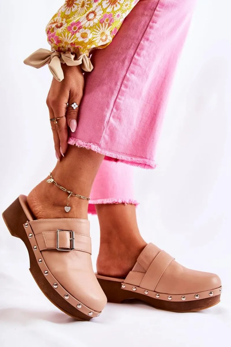 Klasyczny model damskich chodaków osadzony na obcasie i platformie. Model wsuwany. Przyozdobione na przodzie paskiem ze sprzączką. Dodatkowo wokół podeszwy znajdują się ozdobne ćwieki. Podeszwa wykonana z gumowego tworzywa, antypoślizgowa. Model ten dodatkowo posiada gumkę, dzięki której but będzie odpowiednio dopasowany do tęgości nogi. Wkładka wykonana z eko skóry. Model ten świetnie sprawdzi się na co dzień. Nosek zakryty, zaokrąglony. Przy wyborze rozmiaru prosimy sugerować się tabelą rozmiarów.