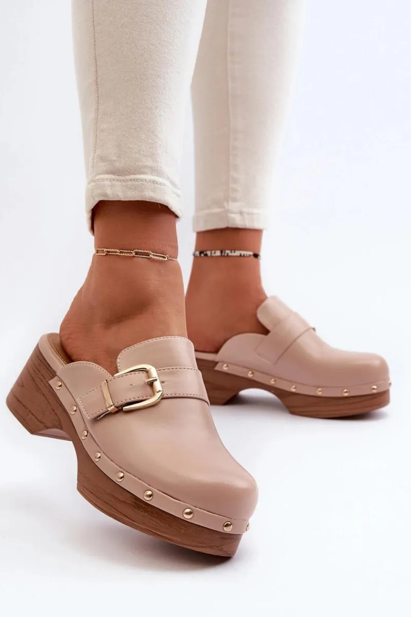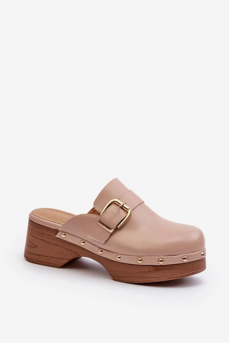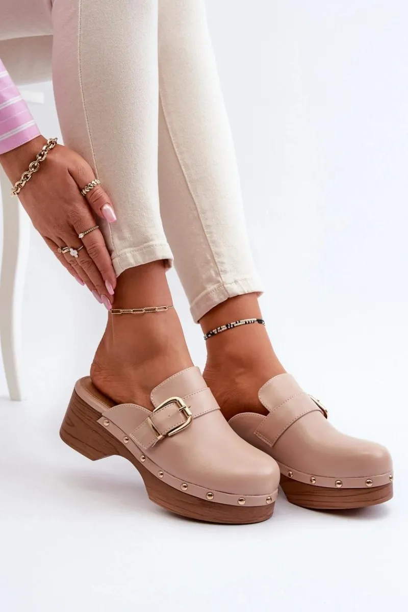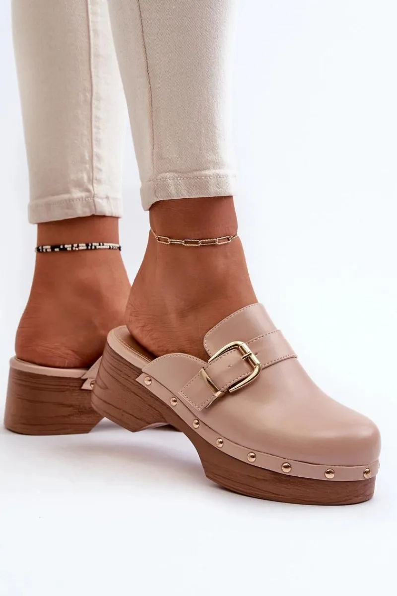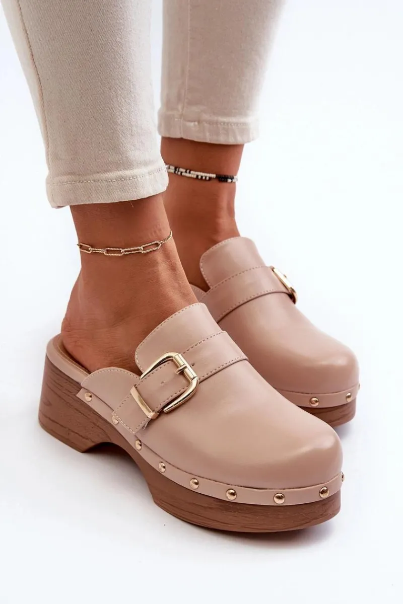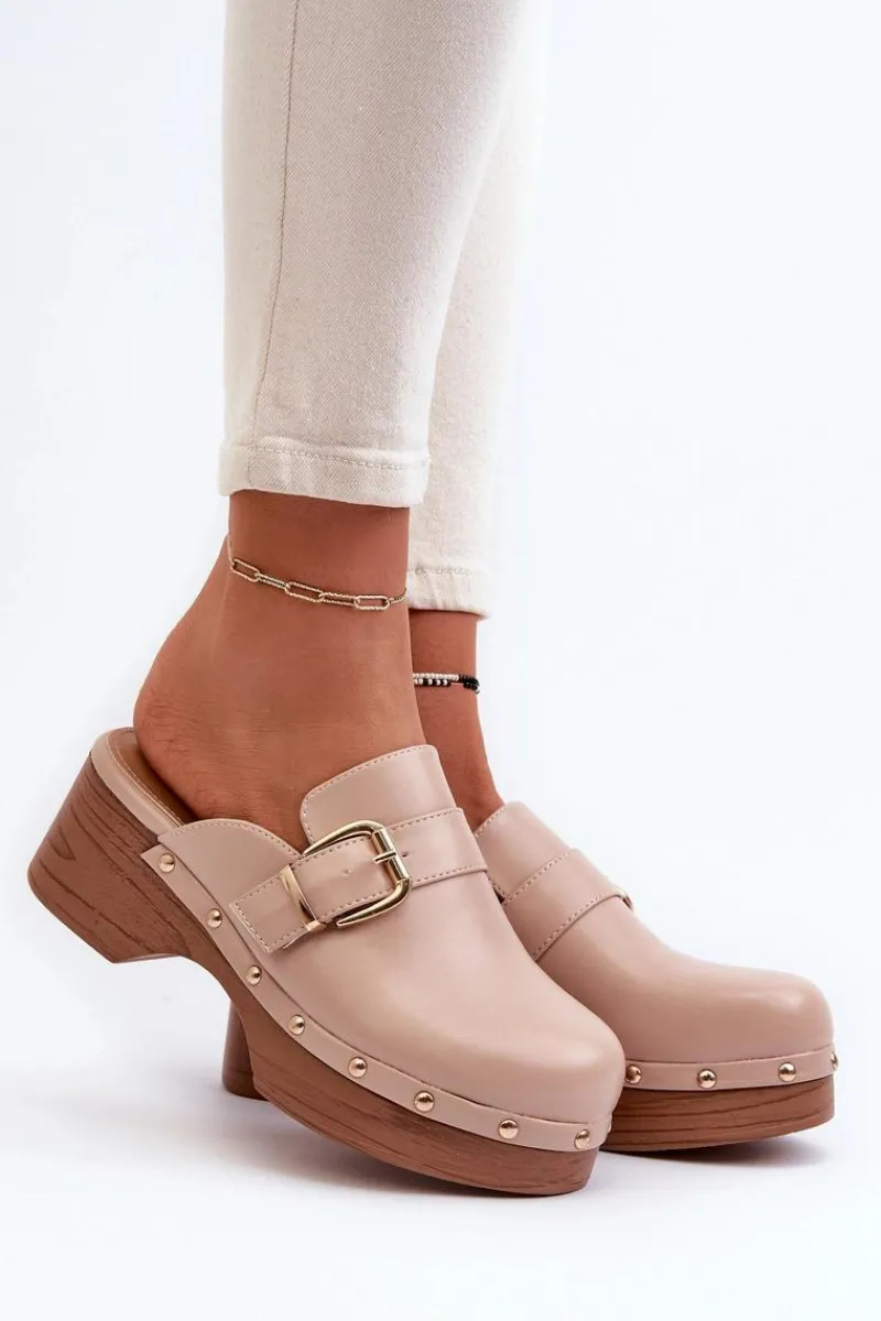 Lekkie klapki osadzone na obcasie i platformie, co nadaje im subtelny wyraz. Na cholewce pasek z klamrą oraz ozdobne ćwieki wokół podeszwy. Wykonane z eko skóry, zarówno cholewka, jak i wkładka gwarantują trwałość i komfort noszenia. Ten model świetnie komponuje się z codziennymi stylizacjami, dodając im nuty szyku i wyrafinowania. Przy wyborze rozmiaru prosimy sugerować się tabelą rozmiarów.