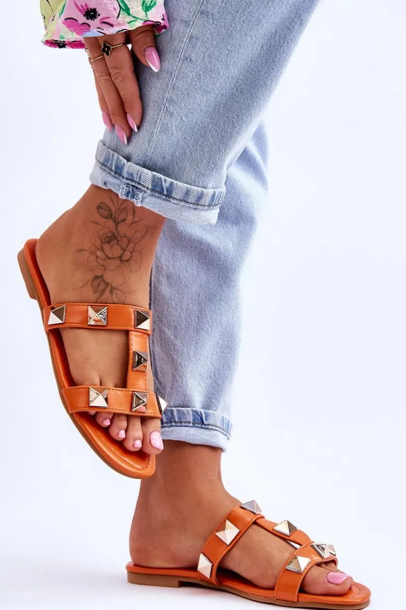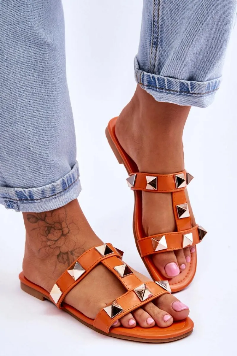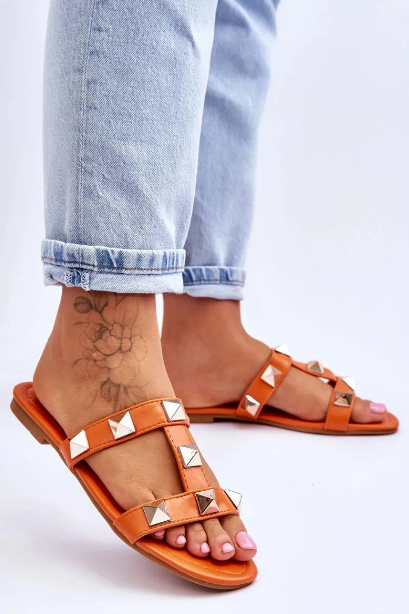 Damskie, klasyczne klapki zostały wykonane z eko skóry. Posiadają modne wycięcia na bokach. Dodatkowo zostały ozdobione dużymi ćwiekami. Klapki osadzono na płaskim obcasie z gumową, antypoślizgową podeszwą. Model ten z pewnością przypadnie do gustu każdej kobiecie podczas upalnych dni. Miękka, eko skórzana wkładka pozwoli na komfortowe użytkowanie obuwia nawet przez cały dzień. Przy wyborze rozmiaru prosimy sugerować się tabelą rozmiarów.