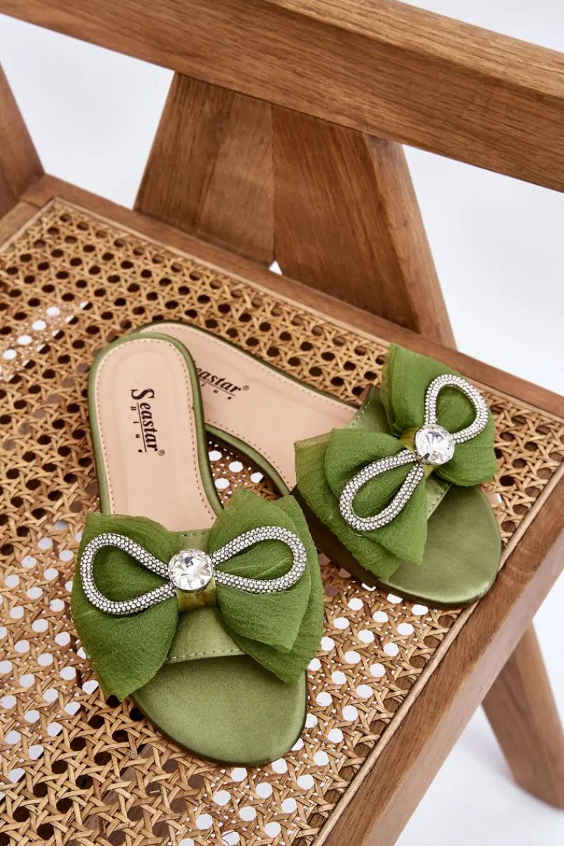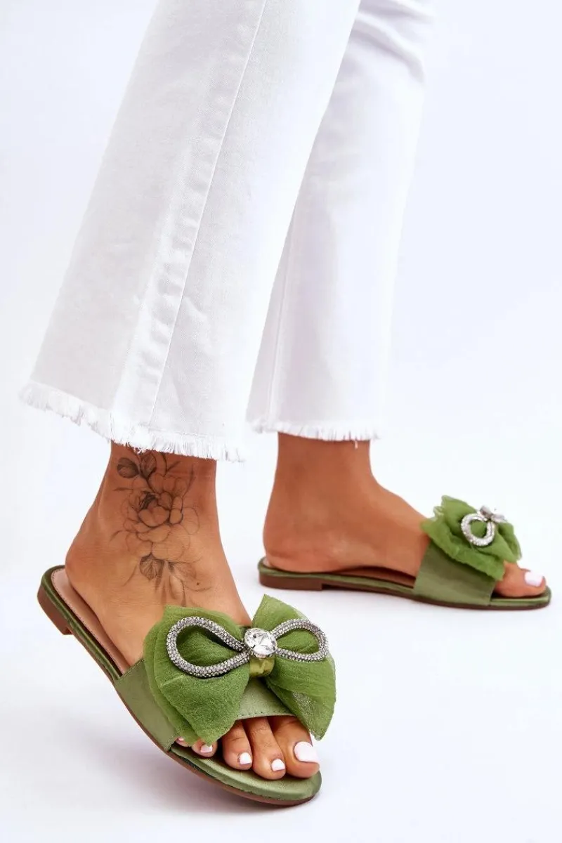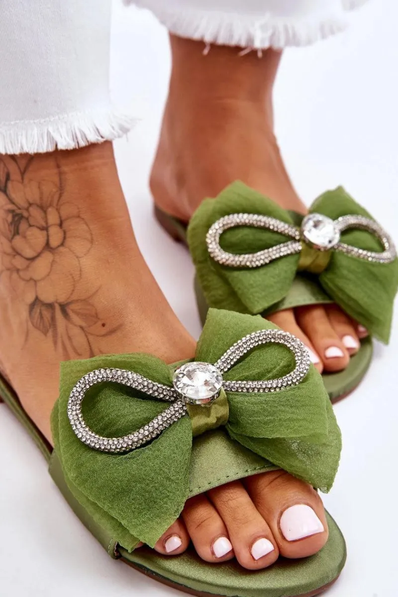 Wygodne klapki wykonane z materiału tekstylnego. Posiadają z przodu piękną kokardę z dodatkami w postaci dżetów imitujących cyrkonie. Miękka wkładka została wykonana z eko skóry. Buty te osadzono na płaskim obcasie. Model idealny na co dzień. Świetnie podkreśli wiele Twoich letnich stylizacji! Przy wyborze rozmiaru prosimy sugerować się tabelą rozmiarów.