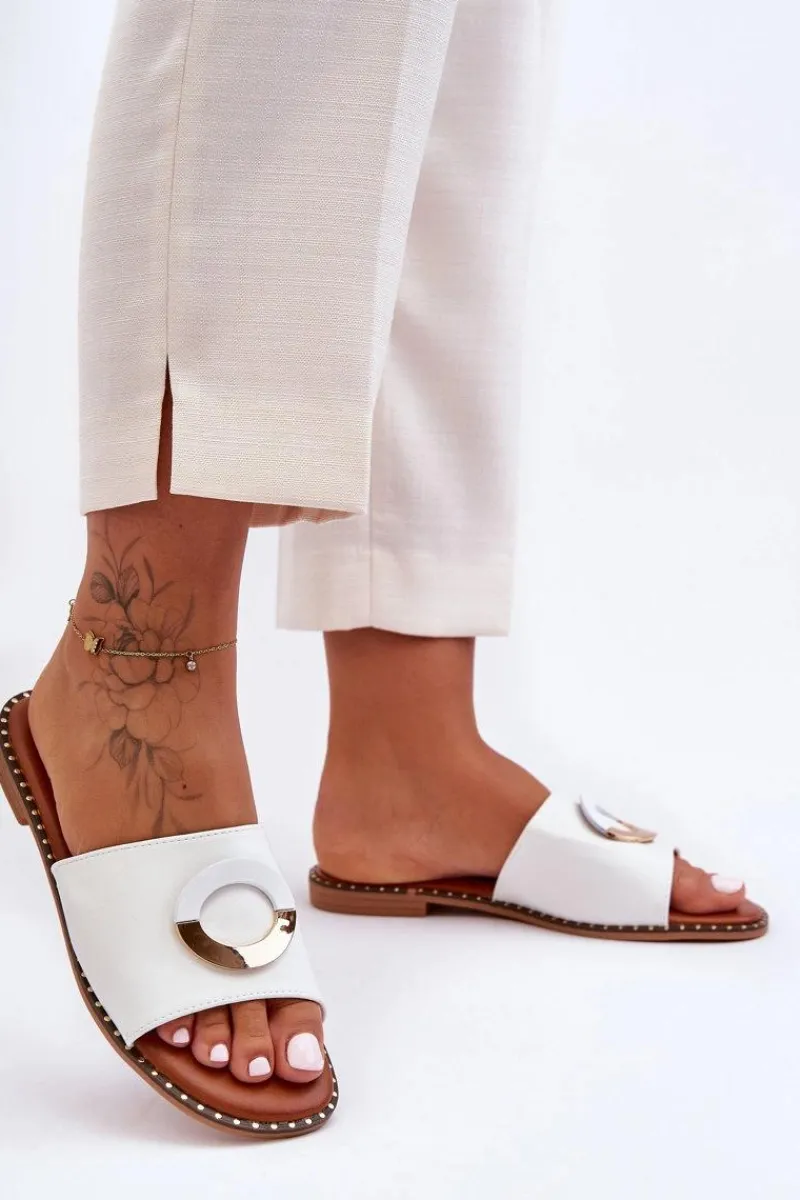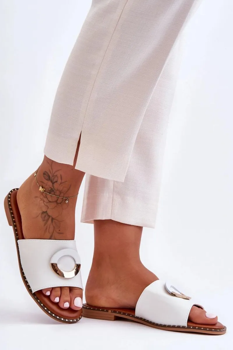 Damskie klapki zostały wykonane z eko skóry. Posiadają na przodzie ozdobę w postaci koła. Klapki osadzono na płaskim obcasie i antypoślizgowej, gumowej podeszwie. Wkładka jest niezwykle miękka i wygodna w użytkowaniu, co zwiększa komfort użytkowania. Nosek w tych klapkach jest odkryty i lekko zaokrąglony. Dodatkowo przy podeszwie znajdują się ozdobne ćwieki. Przy wyborze rozmiaru prosimy sugerować się tabelą rozmiarów.