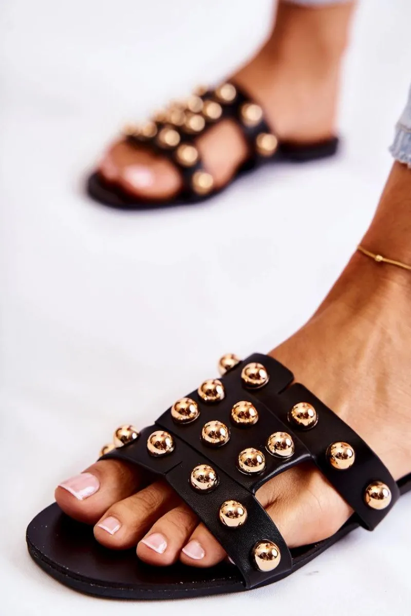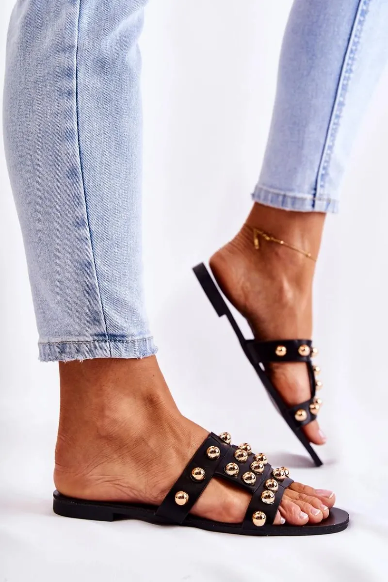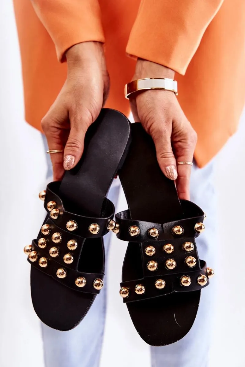 Klasyczne klapki damskie wykonane z eko skóry posiadają delikatne nacięcia na paskach. Zostały ozdobione lustrzanymi elementami w postaci półkul. Miękka wkładka wykonana z eko skóry. Buty zostały osadzone na płaskim obcasie. Podeszwa wykonana z gumowego tworzywa, która jest dodatkowo antypoślizgowa. Świetny model, który sprawdzi się podczas upalnych dni! Przy wyborze rozmiaru prosimy sugerować się tabelą rozmiarów.