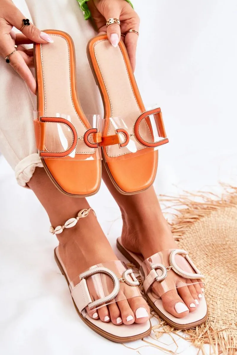 Modne klapki na lato dla kobiet ceniących sobie elegancję oraz wygodę! Wyjątkowe klapki zostały wykonane z wierzchu z transparentnego tworzywa sztucznego oraz eko skóry. Dodatkowo na przodzie znajduje się ozdobny element z tworzywa sztucznego. Klapki osadzone na płaskim obcasie oraz antypoślizgowej podeszwie. Wkładka wykonana z eko skóry zapewni komfort podczas użytkowania. Nosek odkryty, kwadratowy. Koniecznie powinnaś mieć ten model w swojej garderobie! Przy wyborze rozmiaru prosimy sugerować się tabelą rozmiarów.