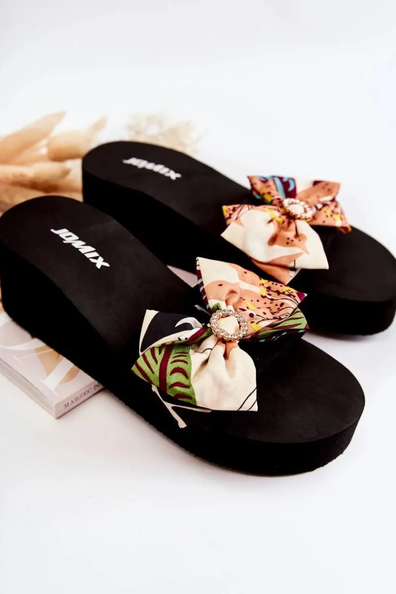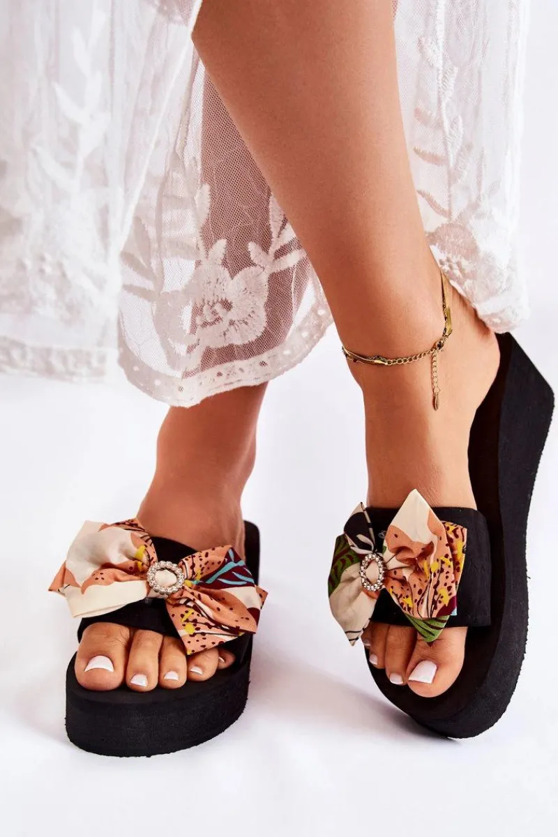 Klasyczne klapki damskie osadzone na koturnie oraz platformie. Pasek wraz z kokardą wykonane z materiału tekstylnego. Podeszwa wraz z koturnem zostały wykonane z piankowego tworzywa. Fason, który na pewno spodoba się niejednej miłośniczce modowych inspiracji! Kokarda została przyozdobiona elementem z tworzywa sztucznego z dżetami imitującymi cyrkonie. Przy wyborze rozmiaru prosimy sugerować się tabelą rozmiarów.
