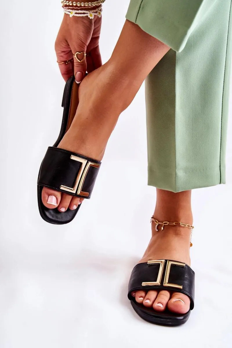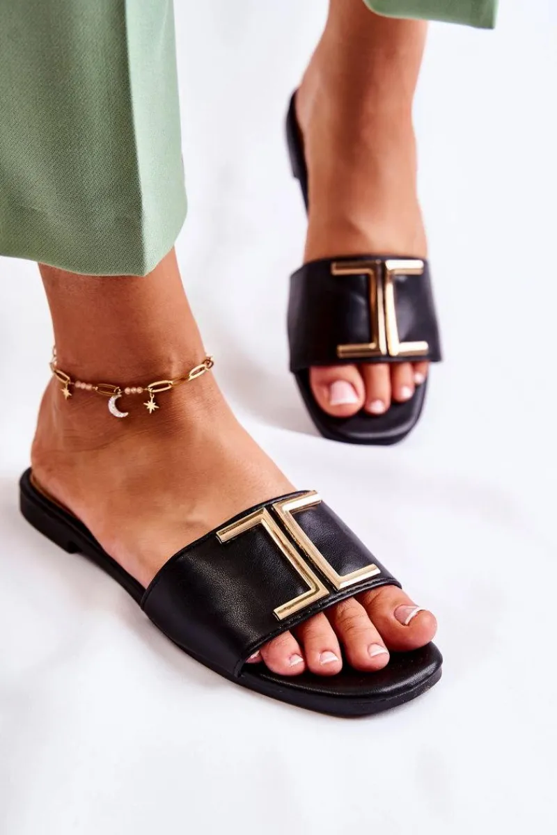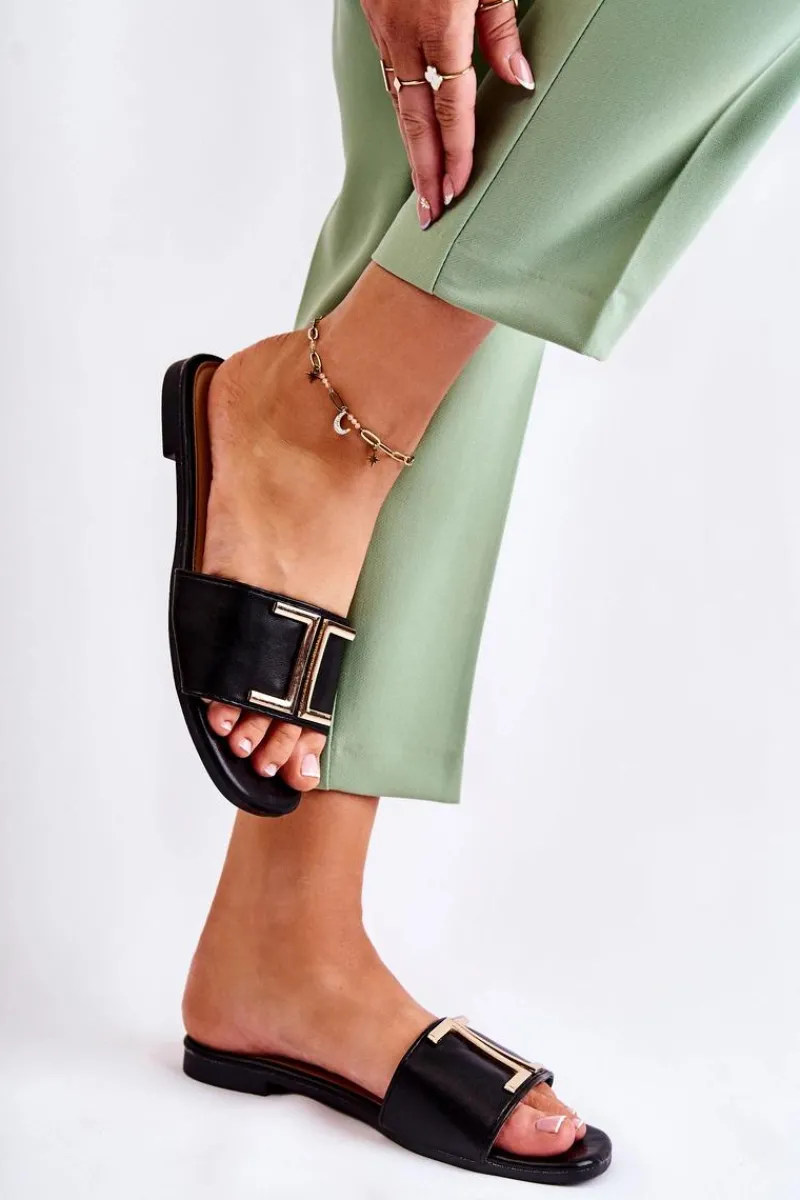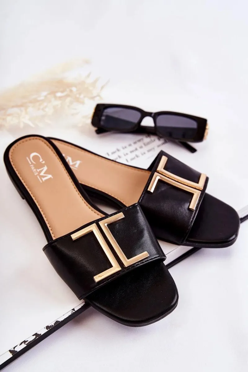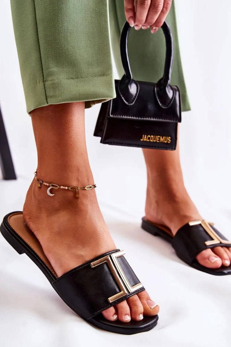 Klasyczne damskie klapki na płaskim obcasie to idealny model na co dzień! Wykonane z eko skóry. Model wsuwany, z odkrytym noskiem. Z przodu znajduje się ozdobny emblemat. Podeszwa wykonana z gumowego tworzywa, która jest antypoślizgowa. Wkładka wykonana z eko skóry zapewnia komfort podczas użytkowania. Świetny model, idealny do wielu stylizacji! Koniecznie powinnaś je mieć! Przy wyborze rozmiaru prosimy sugerować się tabelą rozmiarów.