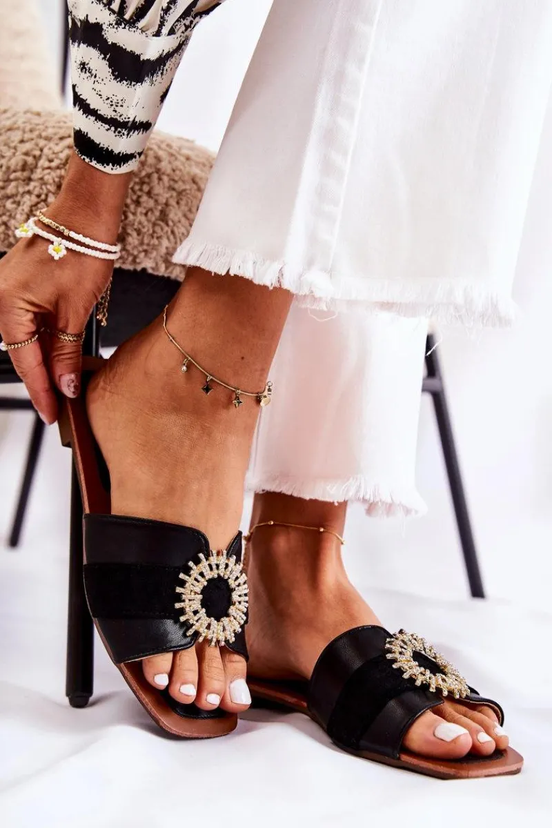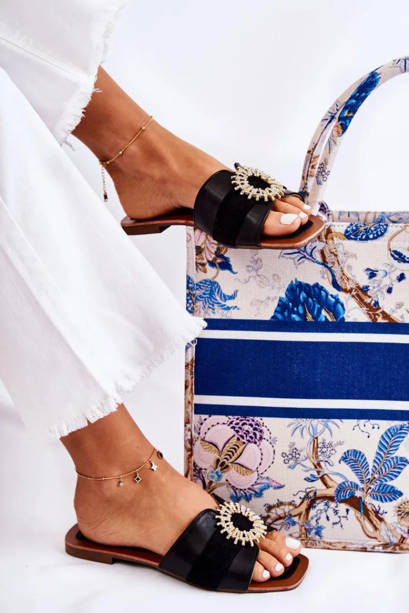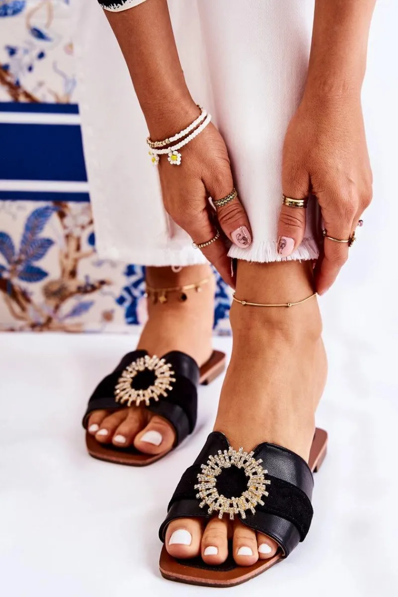 Damskie klapki o nowoczesnym fasonie. Wykonane z materiału tekstylnego oraz eko zamszu. Pleciony przód dodatkowo posiada ozdobny element w postaci koła z dżetami imitującymi cyrkonie. Wkładka jest wygodna i miękka, wykonana z połączenia eko skóry i tworzywa sztucznego. Nosek odkryty, kwadratowy. Klapki osadzone na płaskim obcasie, z podeszwą antypoślizgową. Modne i komfortowe w użytkowaniu – po prostu musisz mieć te klapki! Przy wyborze rozmiaru prosimy sugerować się tabelą rozmiarów.