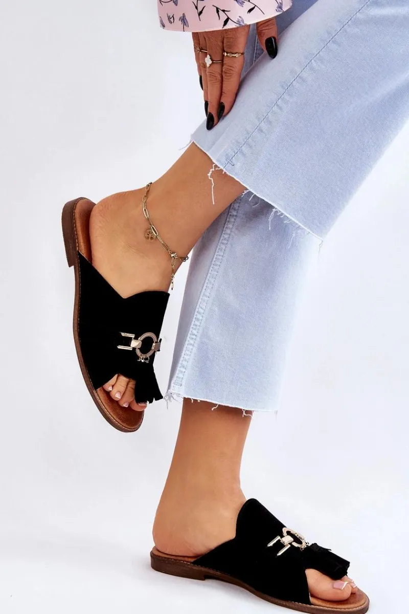Wyjątkowe, damskie klapki od polskiej firmy Lewski Shoes. Zostały wykonane z wysokiej jakości skór naturalnych. Posiadają na przodzie ozdobę z tworzywa sztucznego oraz frędzelki. Miękka wkładka jest niezwykle komfortowa podczas użytkowania. Klapki osadzono na płaskim obcasie. Ten model powinien być Twój! Przy wyborze rozmiaru prosimy sugerować się tabelą rozmiarów.