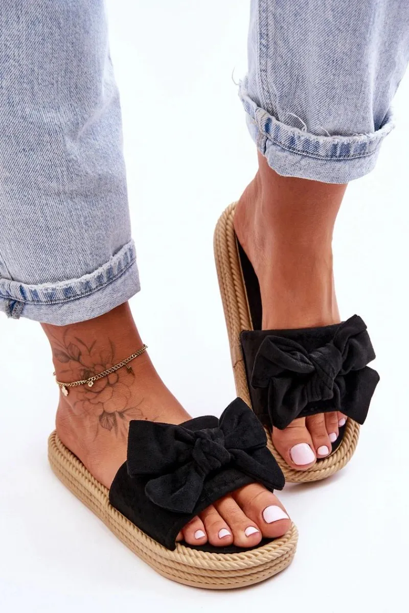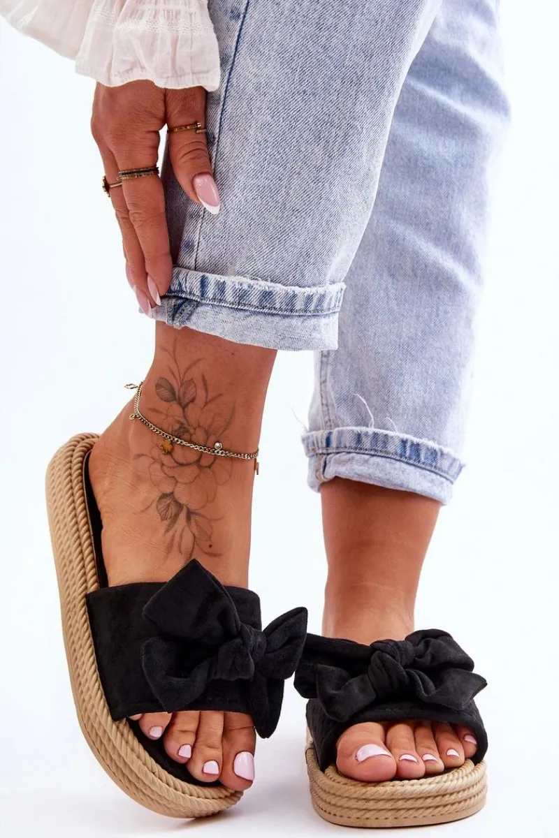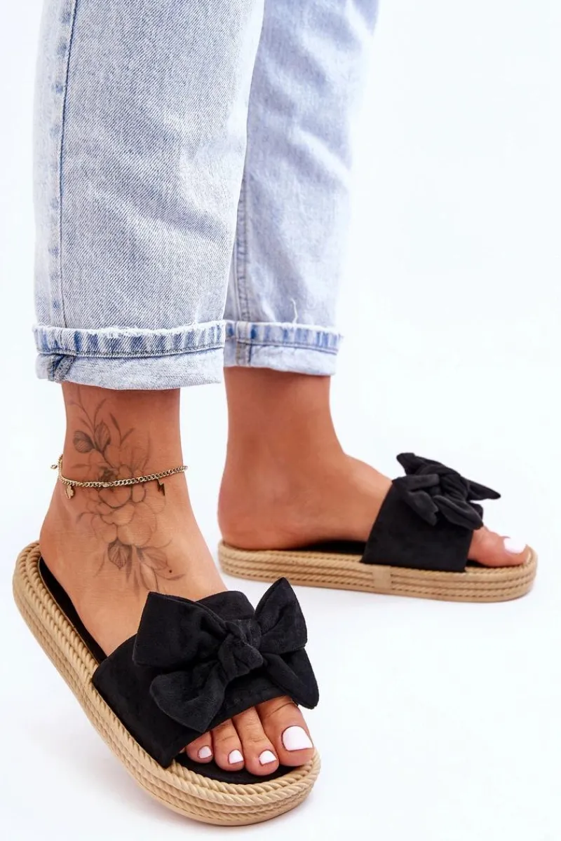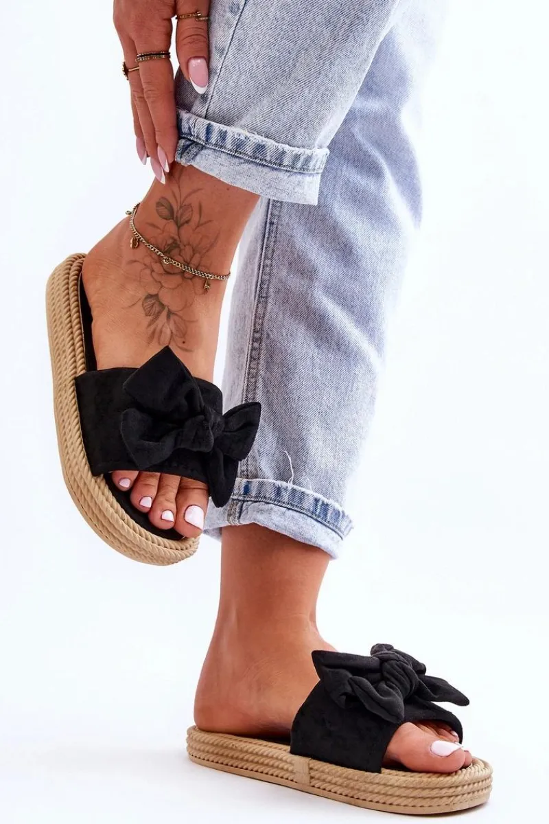 Damskie klapki zostały wykonane z eko zamszu. Model ten posiada uroczą kokardę na przodzie. Klapki osadzono na masywnej platformie. Model ten idealnie sprawdzi się na cieplejsze dni! Wkładka w tym obuwiu także jest wykonana z eko zamszu. Nie czekaj dłużej i kup już dziś! Przy wyborze rozmiaru prosimy sugerować się tabelą rozmiarów.