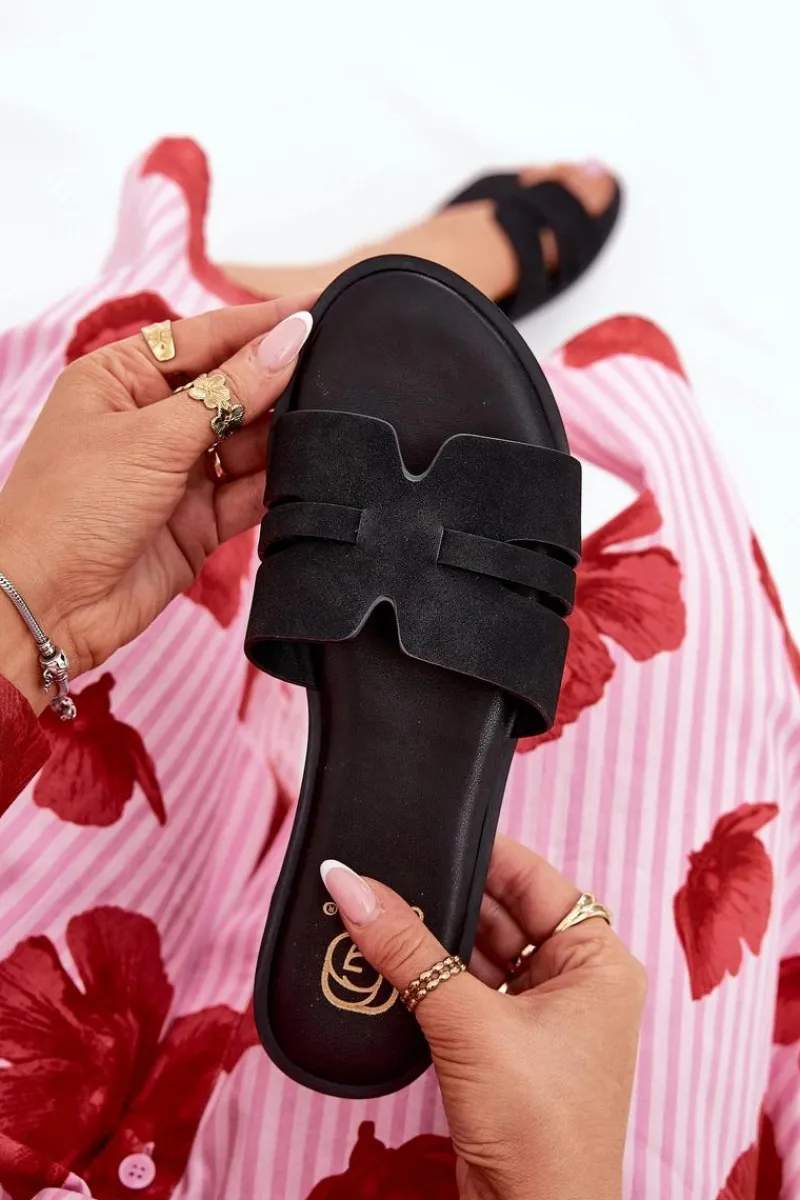Klasyczne klapki damskie wykonane z eko zamszu, osadzone na płaskim obcasie, które łączą elegancję z wygodą. Wycięcia i subtelny paseczek nadają im lekkości i nowoczesnego charakteru. Idealne na co dzień, te klapki będą doskonałym wyborem na ciepłe dni, świetnie komponując się z sukienkami, spódnicami czy spodniami, łącząc prostotę z funkcjonalnością. Przy wyborze rozmiaru prosimy sugerować się tabelą rozmiarów.