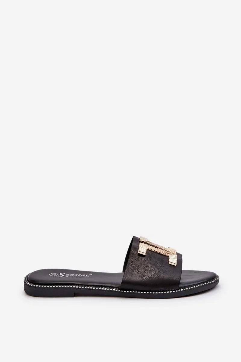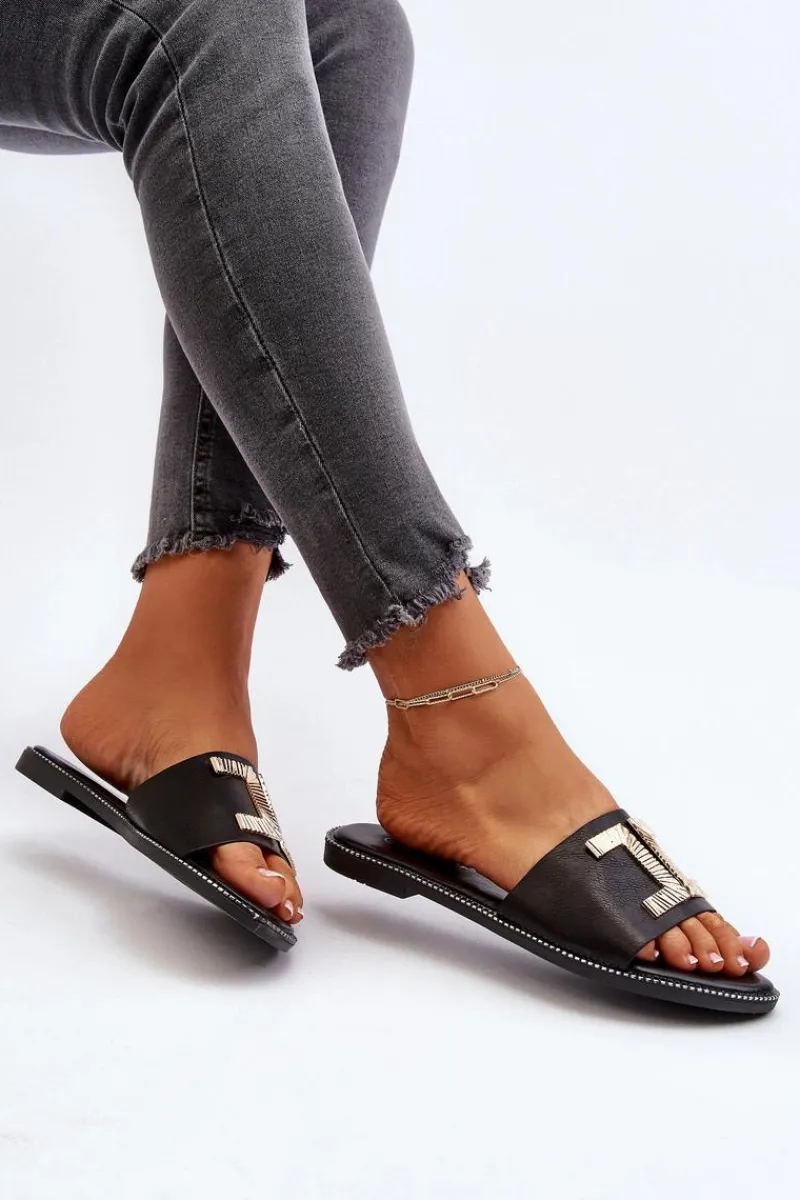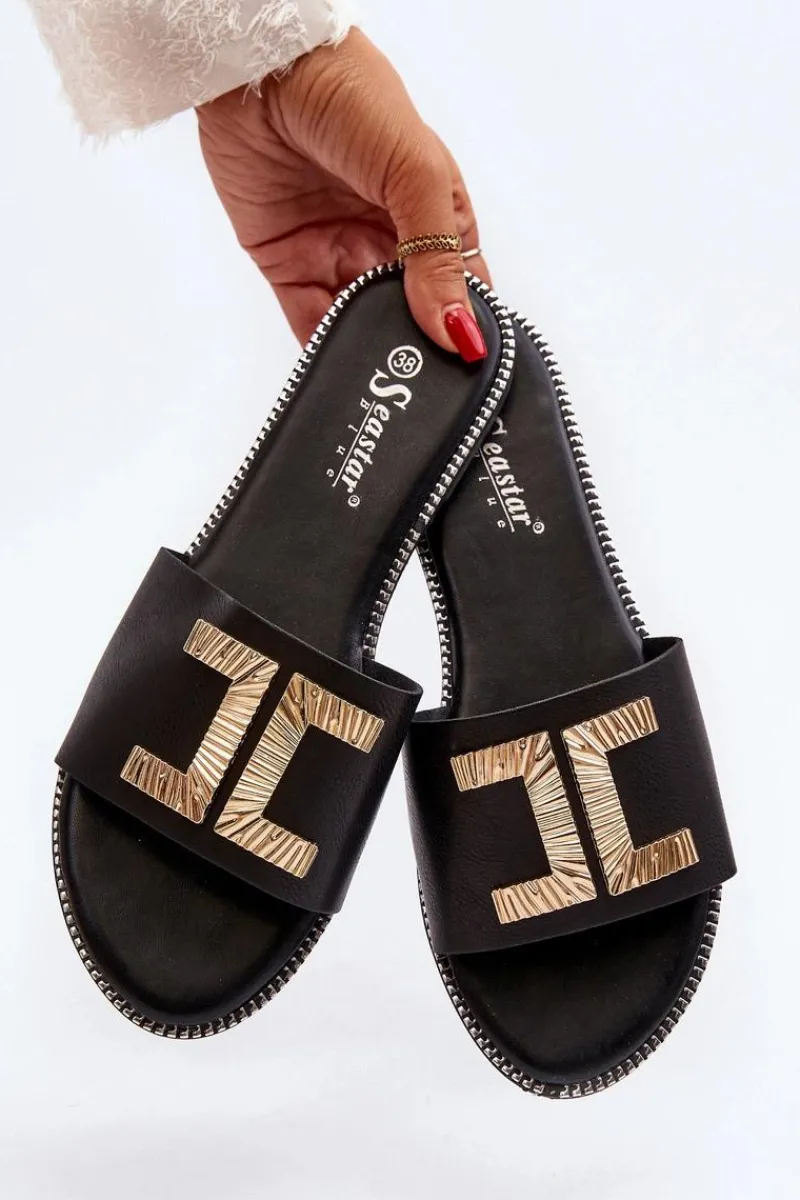 Klapki damskie na płaski obcasie, który gwarantuje stabilność i wygodę podczas noszenia. Na przodzie złota ozdoba, która dodaje im elegancji i subtelności. Model ten doskonale uzupełni letnie stylizacje! Przy wyborze rozmiaru prosimy sugerować się tabelą rozmiarów.