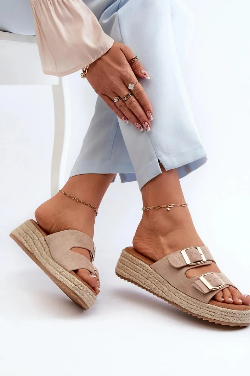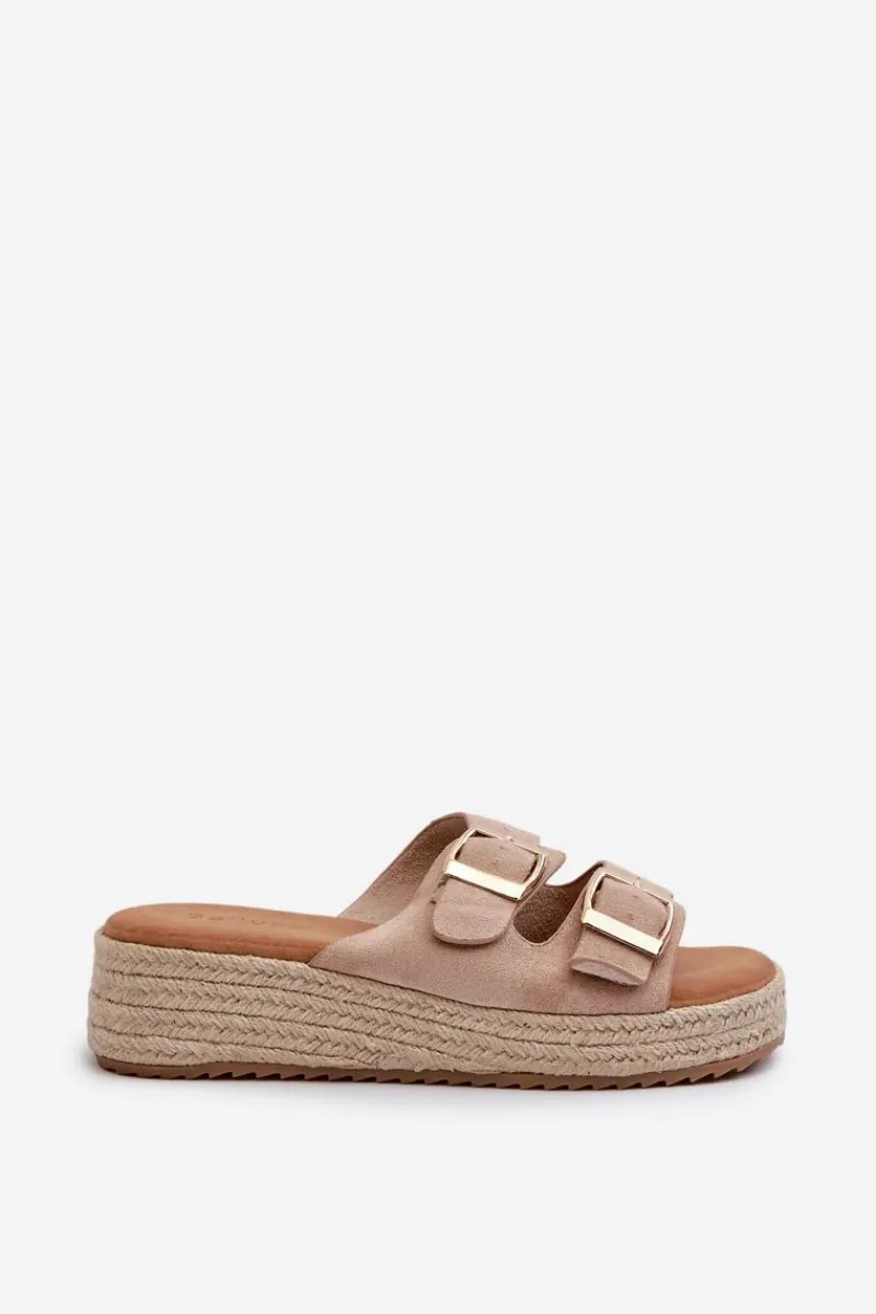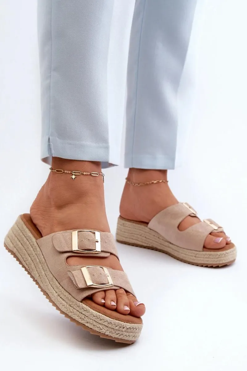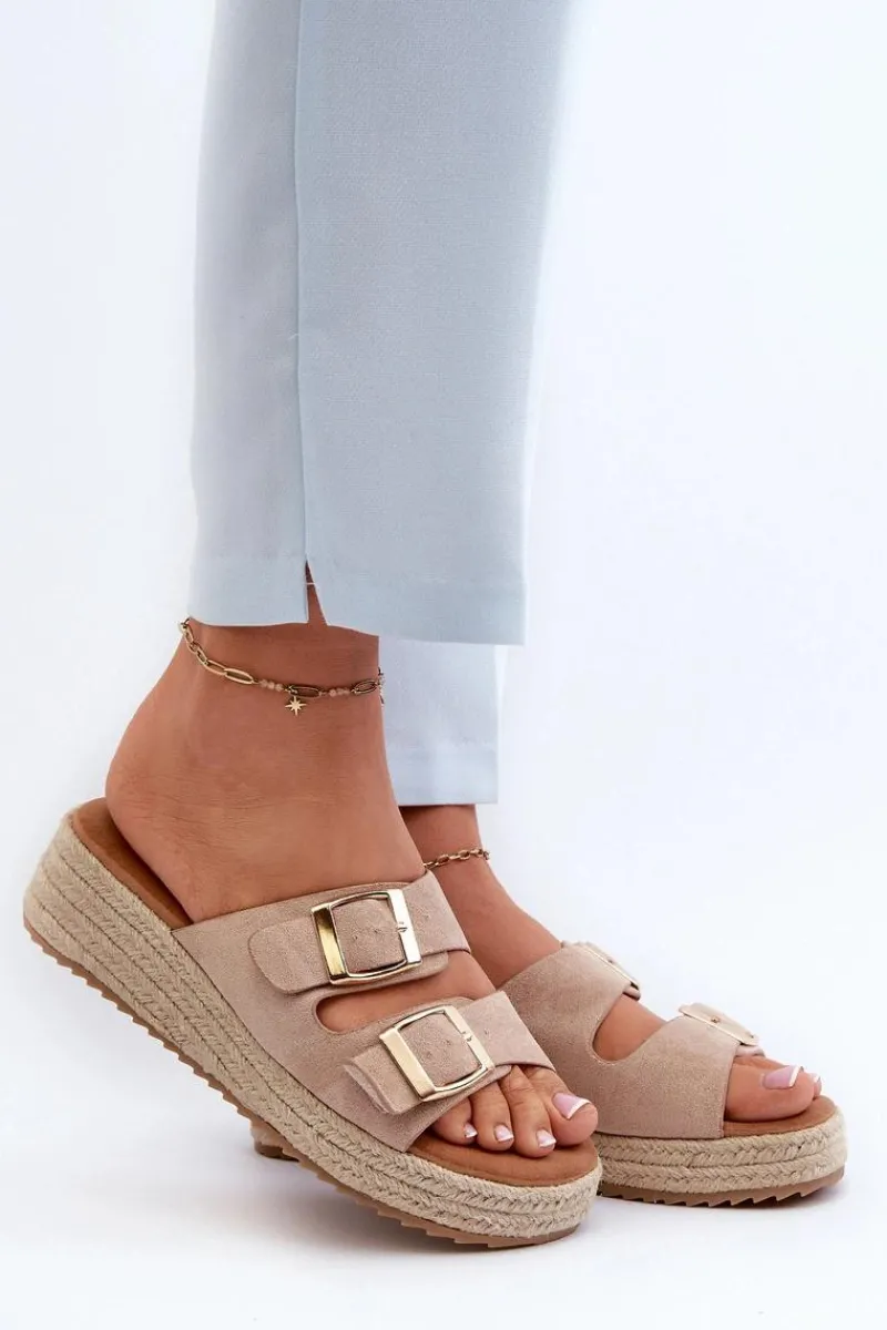 Damskie klapki wykonane z eko zamszu. Osadzone na platformie i lekkim koturnie. Z przodu dwa regulowane paski z klamrami, które zapewniają idealne dopasowanie. Model ten nie tylko prezentuje się świetnie, ale także zapewnia komfort noszenia na co dzień. Przy wyborze rozmiaru prosimy sugerować się tabelą rozmiarów.