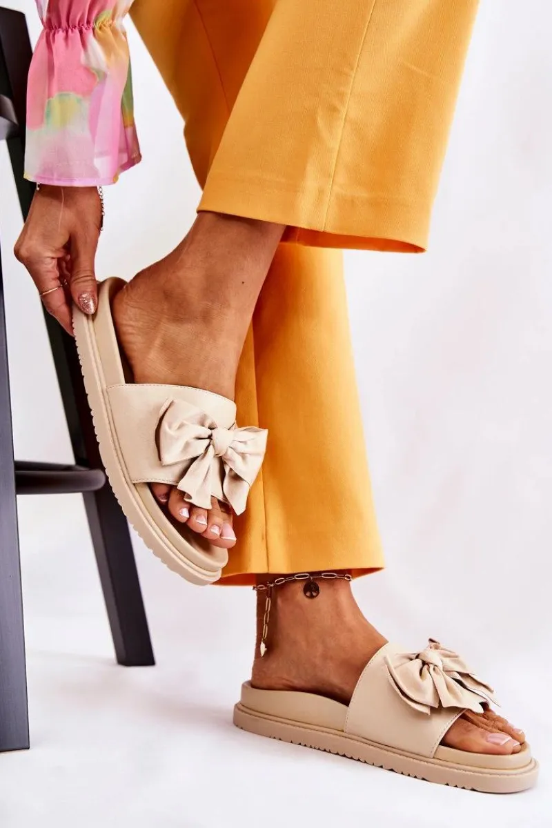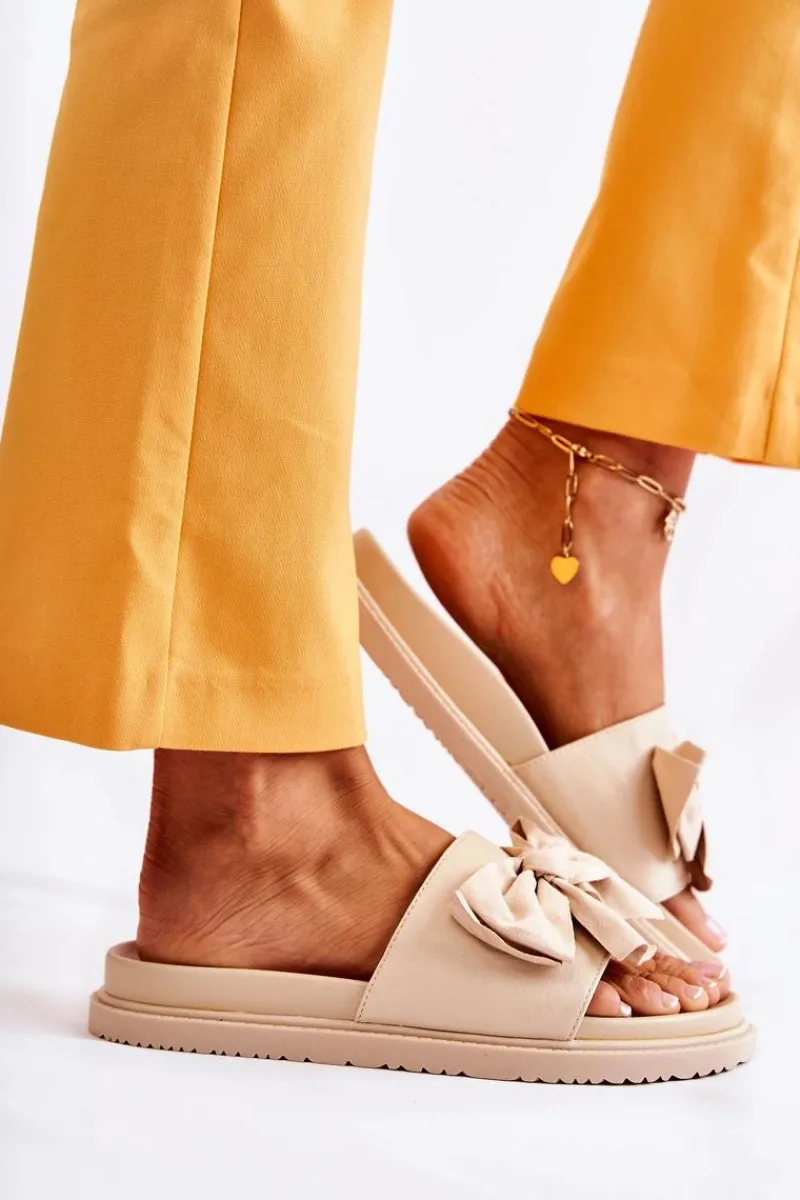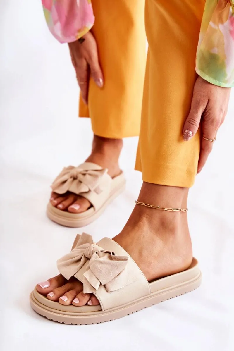 Modne klapki świetnie sprawdzą się podczas upalnych dni! Klasyczny, wsuwany model został wykonany z eko skóry. Eko zamszowa kokarda na przodzie dodaje tym butom elegancji. Klapki osadzone na delikatnej platformie wykonanej z tworzywa sztucznego. Wkładka jest profilowana, wykonana z tworzywa gumowego. Model ten posiada odkryty, zaokrąglony nosek. Podczas wyboru rozmiaru prosimy sugerować się tabelą rozmiarów.