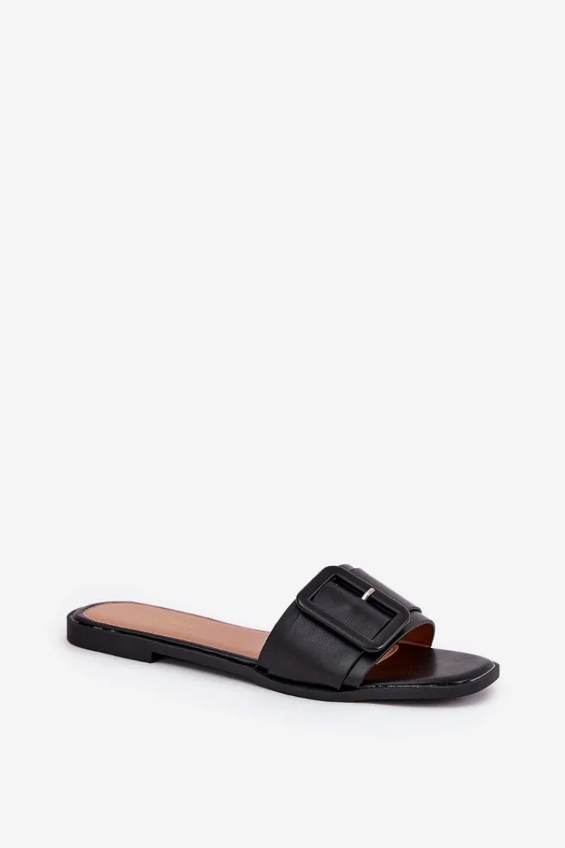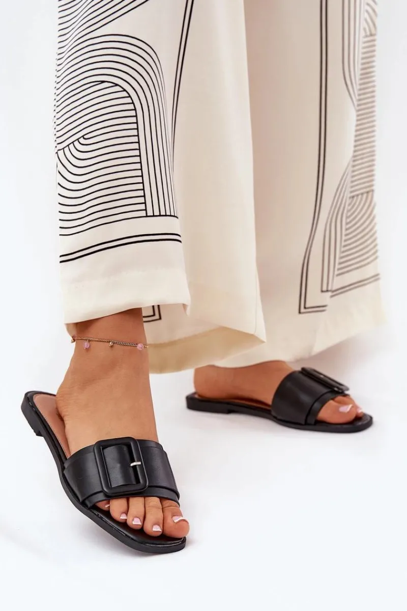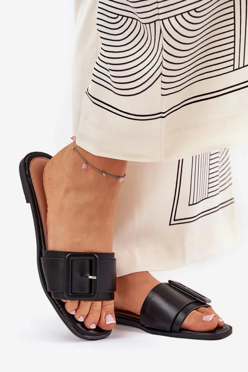 Klasyczne klapki damskie z eko skóry, osadzone na płaskim obcasie, które łączą wygodę z eleganckim wyglądem. Duża klamra na pasku dodaje im subtelnego charakteru. Idealne na co dzień, te klapki doskonale komponują się z letnimi stylizacjami, zapewniając komfort i prostą elegancję przez cały dzień. Przy wyborze rozmiaru prosimy sugerować się tabelą rozmiarów.