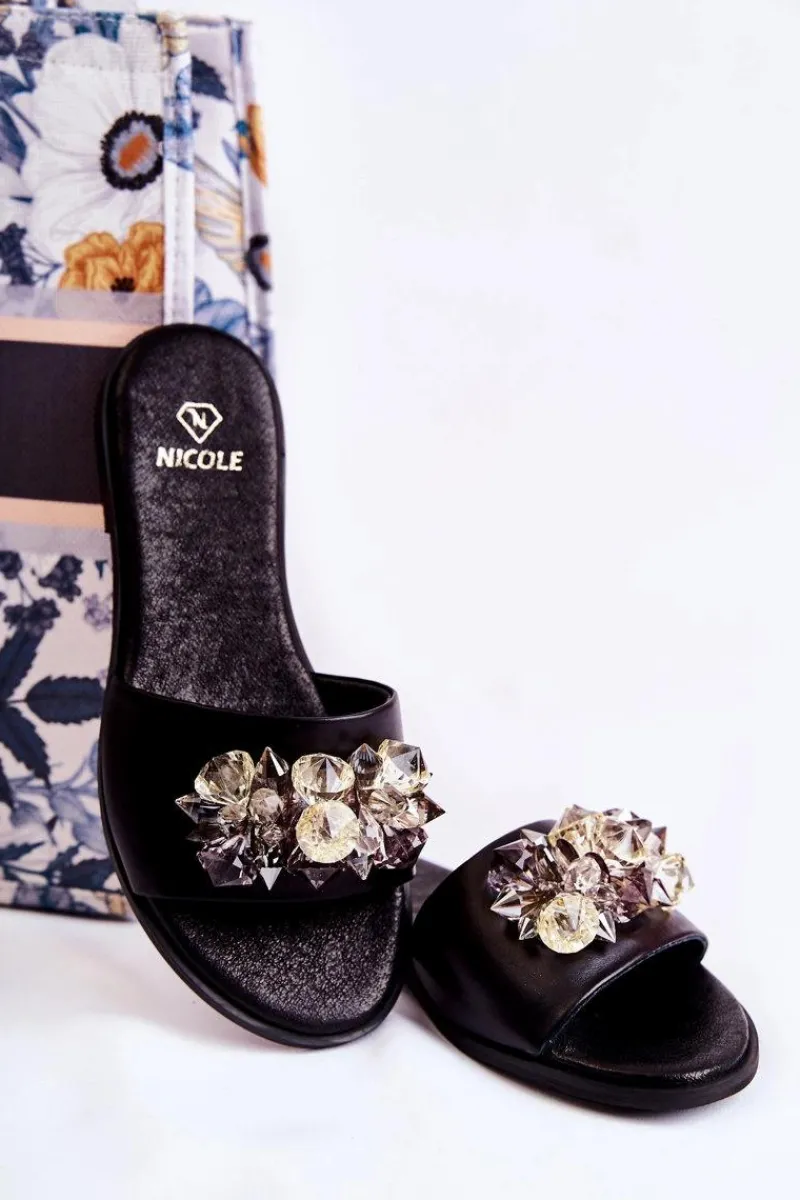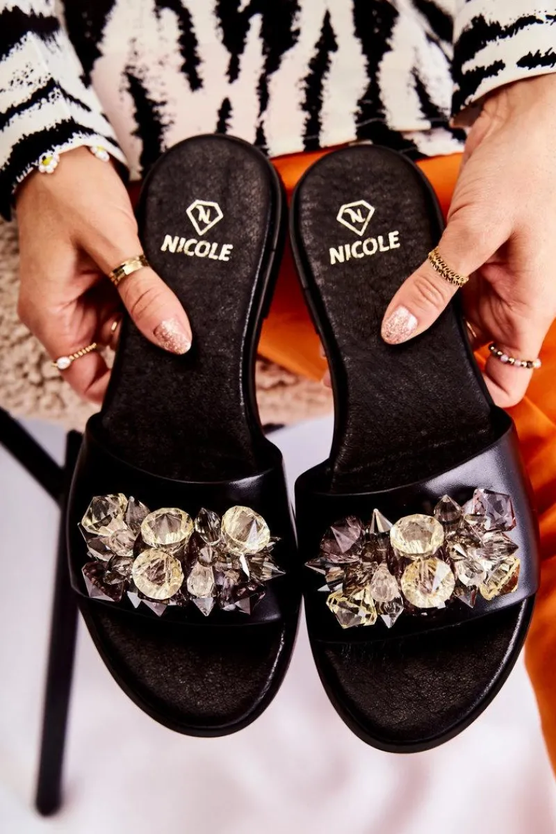 Klasyczne, wsuwane klapki marki Nicole. Buty wykonane są w całości ze skóry naturalnej z dbałością o szczegóły. Posiadają ozdobę na przodzie w postaci kolorowych kryształków. Miękka wkładka także została wykonana z naturalnej skóry, dzięki której komfort użytkowania jest jeszcze większy. Buty osadzone na płaskim obcasie. Koniecznie sprawdź całą naszą kolekcję butów marki Nicole. Przy wyborze rozmiaru prosimy sugerować się tabelą rozmiarów.