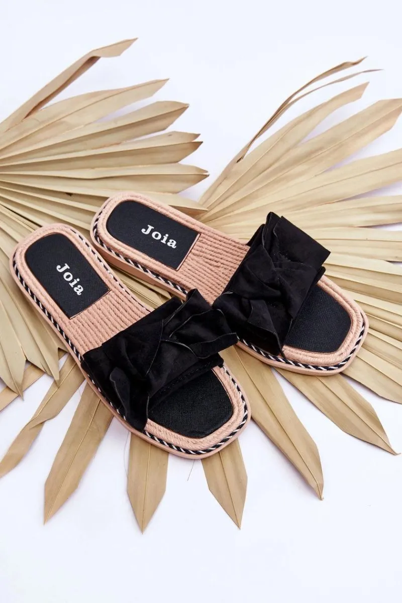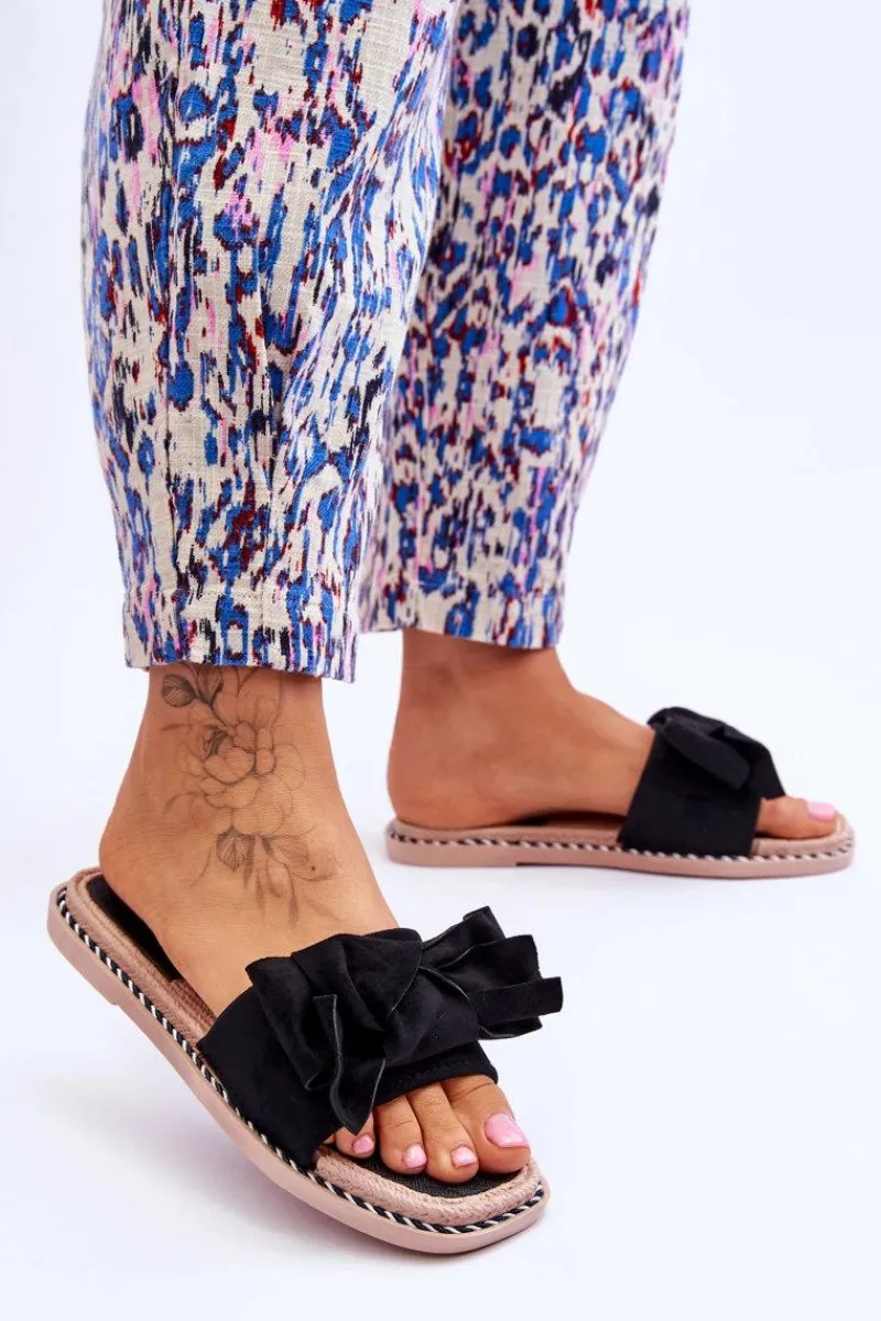 Klasyczne, wsuwane klapki damskie zostały wykonane z wierzchu z eko zamszu. Dodatkowo z przodu posiadają kokardę. Wkładka oraz podeszwa zostały wykonane z gumowego tworzywa. Klapki są wygodne w użytkowaniu oraz elastyczne. Podeszwa jest także antypoślizgowa. Wokół podeszwy znajduje się ozdobny sznurek. Klapki osadzono na płaskim obcasie. Przy wyborze rozmiaru prosimy sugerować się tabelą rozmiarów.