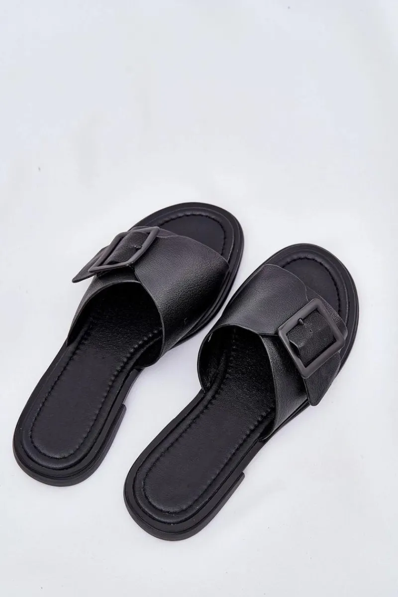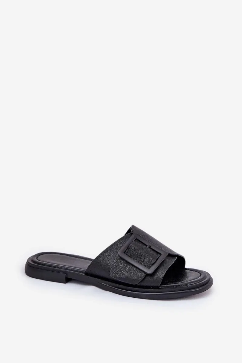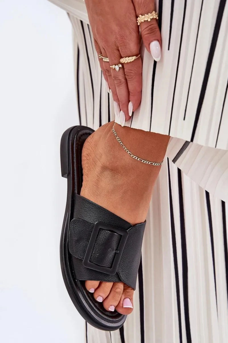 Eleganckie klapki damskie z naturalnej skóry, osadzone na płaskim obcasie, które łączą komfort z prostym stylem. Z przodu duża klamra, która dodaje im wyjątkowego charakteru. Skórzana wkładka zapewnia wygodę przez cały dzień, dbając o odpowiednią amortyzację. Doskonałe na letnie dni, te klapki będą idealnym wyborem do codziennych stylizacji, wprowadzając do nich lekkość i elegancję. Przy wyborze rozmiaru prosimy sugerować się tabelą rozmiarów.