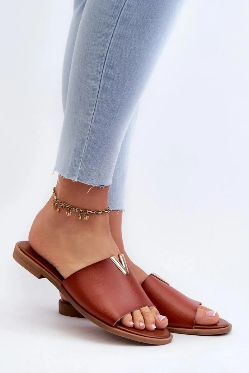 Klapki damskie wykonane ze skóry ekologicznej. Złoty element doda blasku Twojej letniej stylizacji. Osadzone na płaskim obcasie. Model ten będzie idealnym wyborem na wiele okazji! Przy wyborze rozmiaru prosimy sugerować się tabelą rozmiarów.