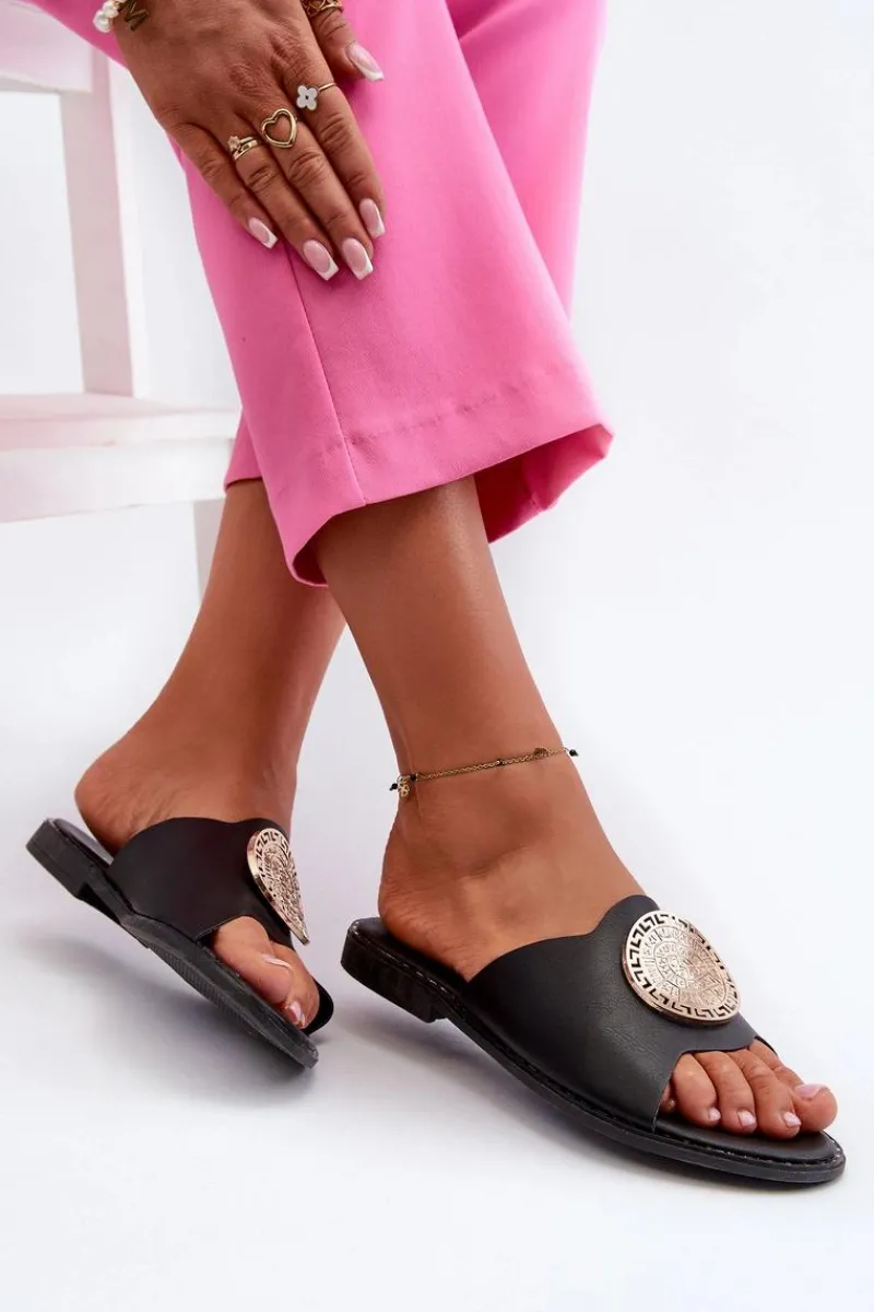 Eleganckie damskie klapki wykonane z eko skóry. Osadzone na płaskim obcasie, zapewniają wygodę i stabilność. Uroku dodaje ozdoba, która sprawia, że klapki są idealnym wyborem na letnie dni, zarówno na co dzień, jak i na bardziej formalne okazje. Przy wyborze rozmiaru prosimy sugerować się tabelą rozmiarów.