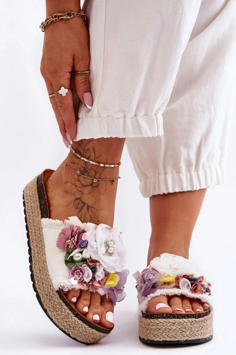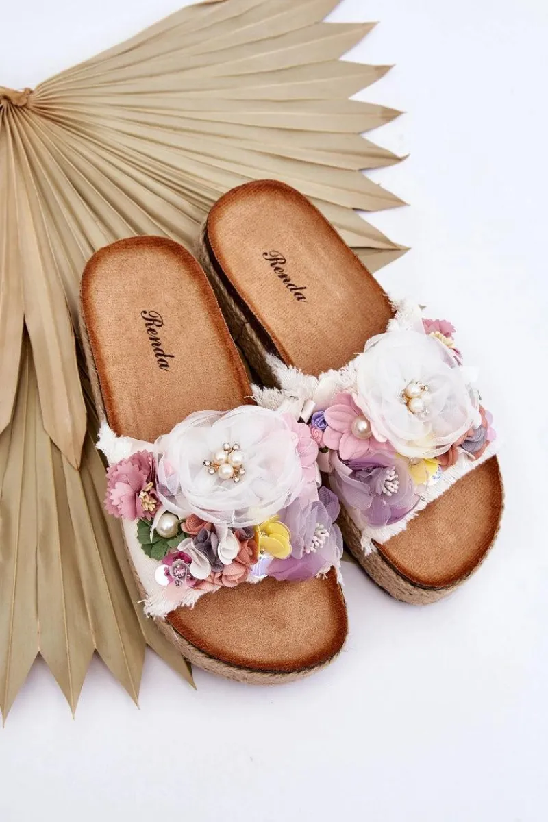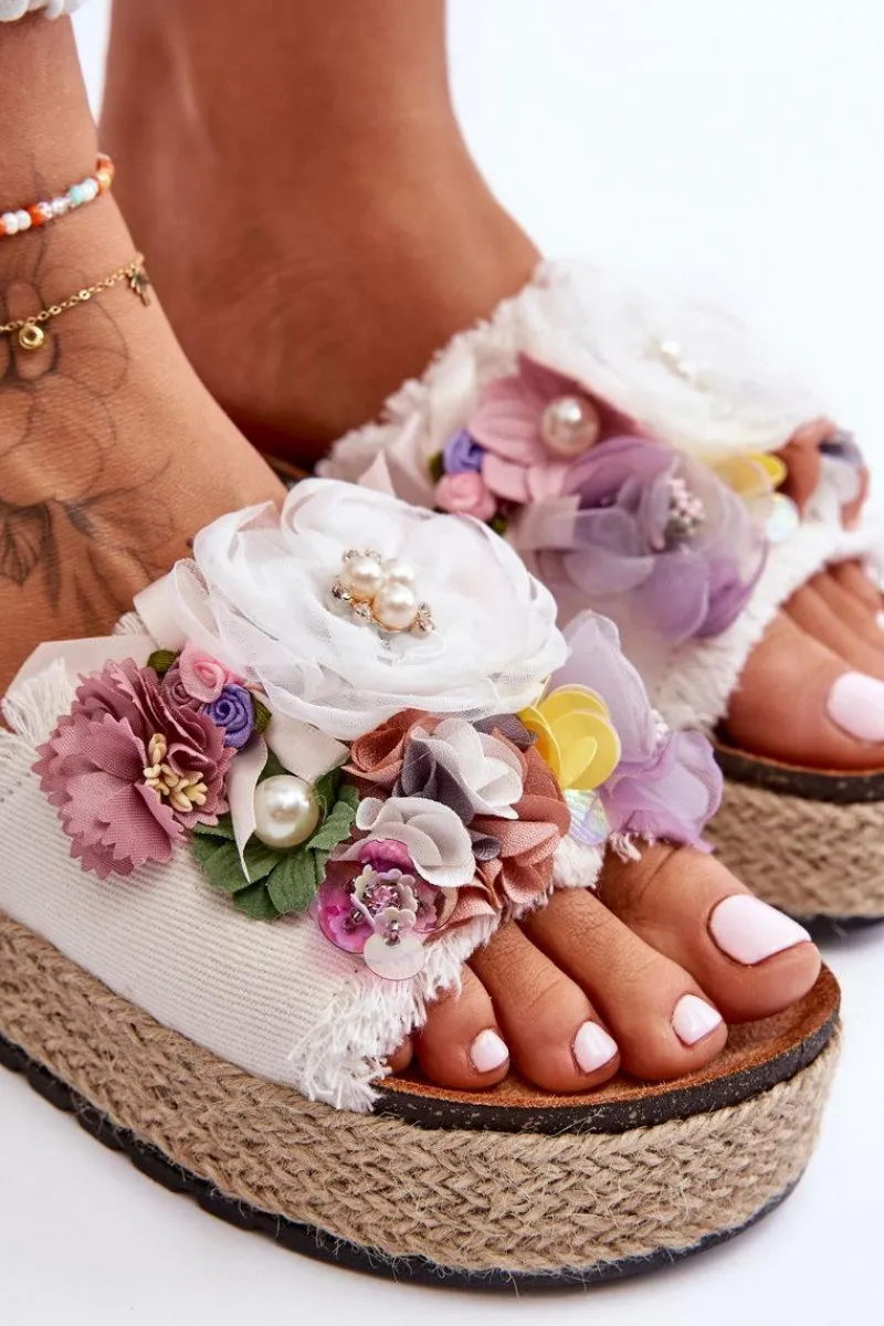 Niepowtarzalne, damskie klapki z cudnymi ozdobami w postaci materiałowych kwiatów i perełek. Osadzone na masywnej platformie ozdobionej jutową plecionką. Klapki posiadają profilowaną, eko zamszową wkładkę. Ten model z pewnością wyróżni Cię z tłumu! Przy wyborze rozmiaru prosimy sugerować się tabelą rozmiarów.