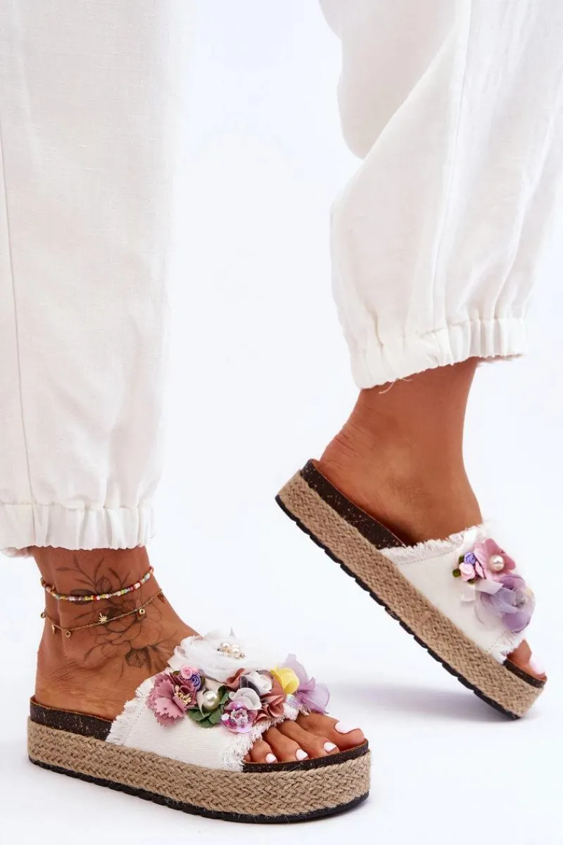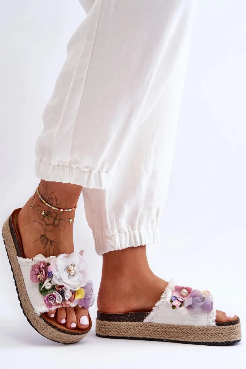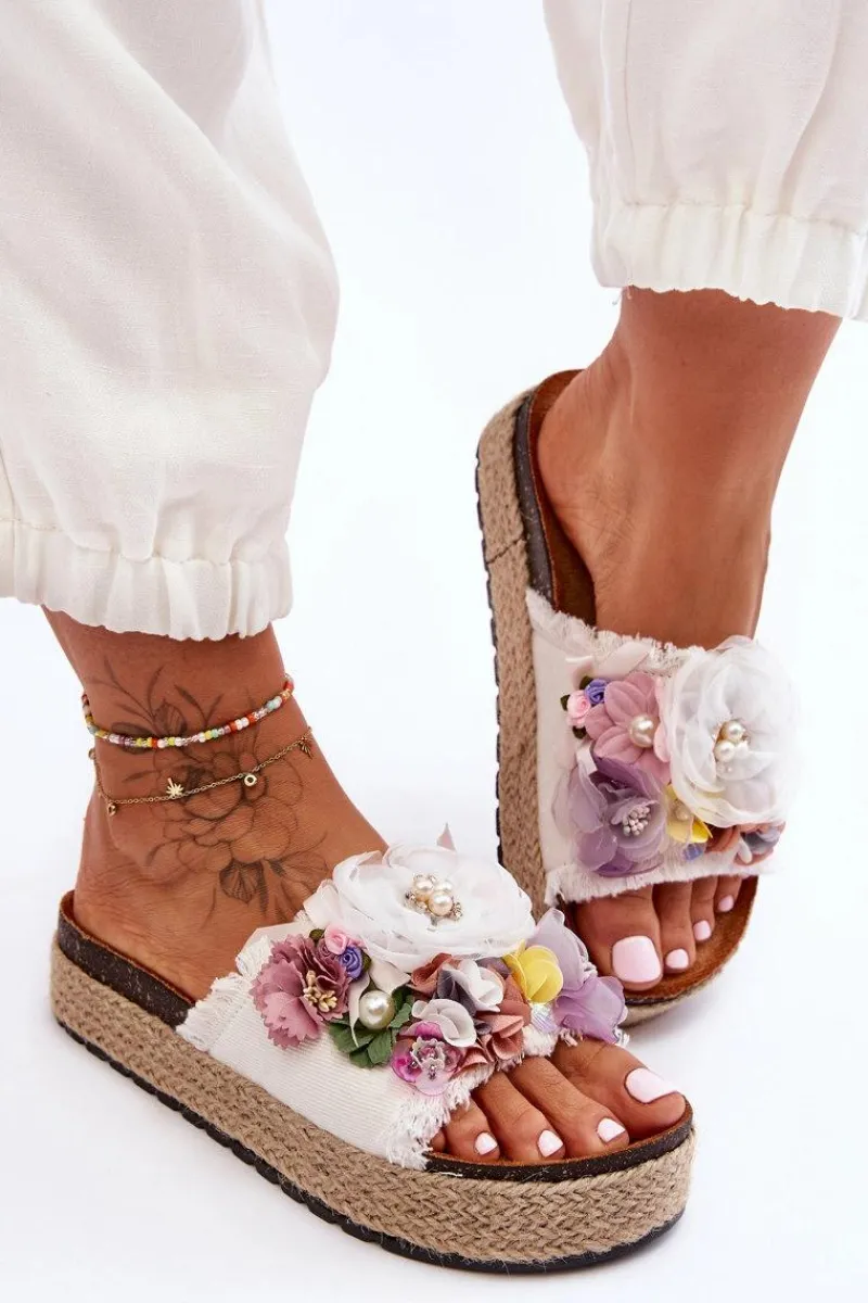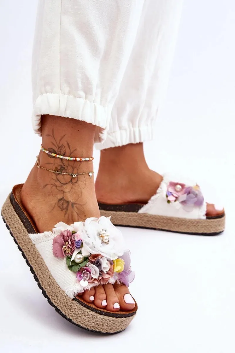 Niepowtarzalne, damskie klapki z cudnymi ozdobami w postaci materiałowych kwiatów i perełek. Osadzone na masywnej platformie ozdobionej jutową plecionką. Klapki posiadają profilowaną, eko zamszową wkładkę. Ten model z pewnością wyróżni Cię z tłumu! Przy wyborze rozmiaru prosimy sugerować się tabelą rozmiarów.