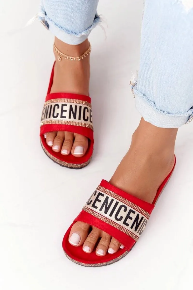 Komfortowe klapki damskie na korkowej podeszwie. Buty wykonane są z eko zamszu, posiadają delikatnie profilowaną wkładkę. Mody fason z cyrkoniami urozmaici Twoją garderobę!