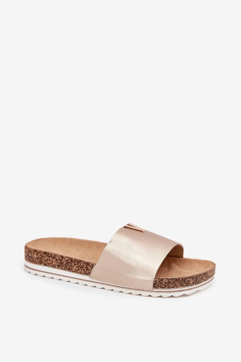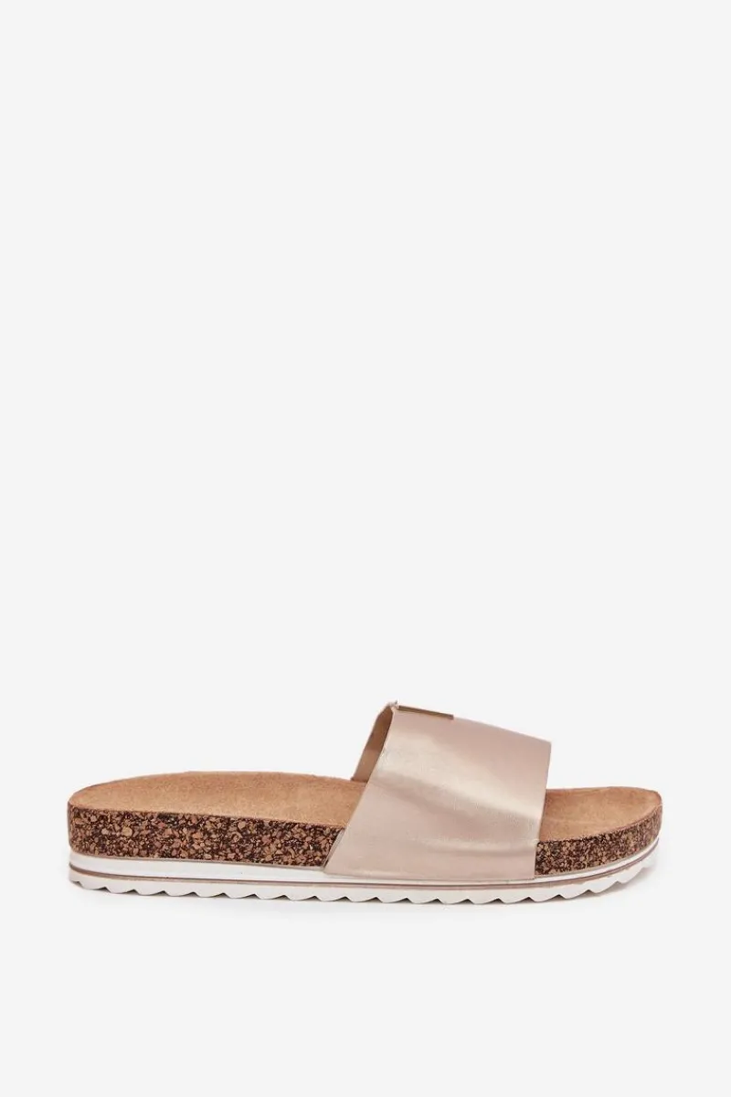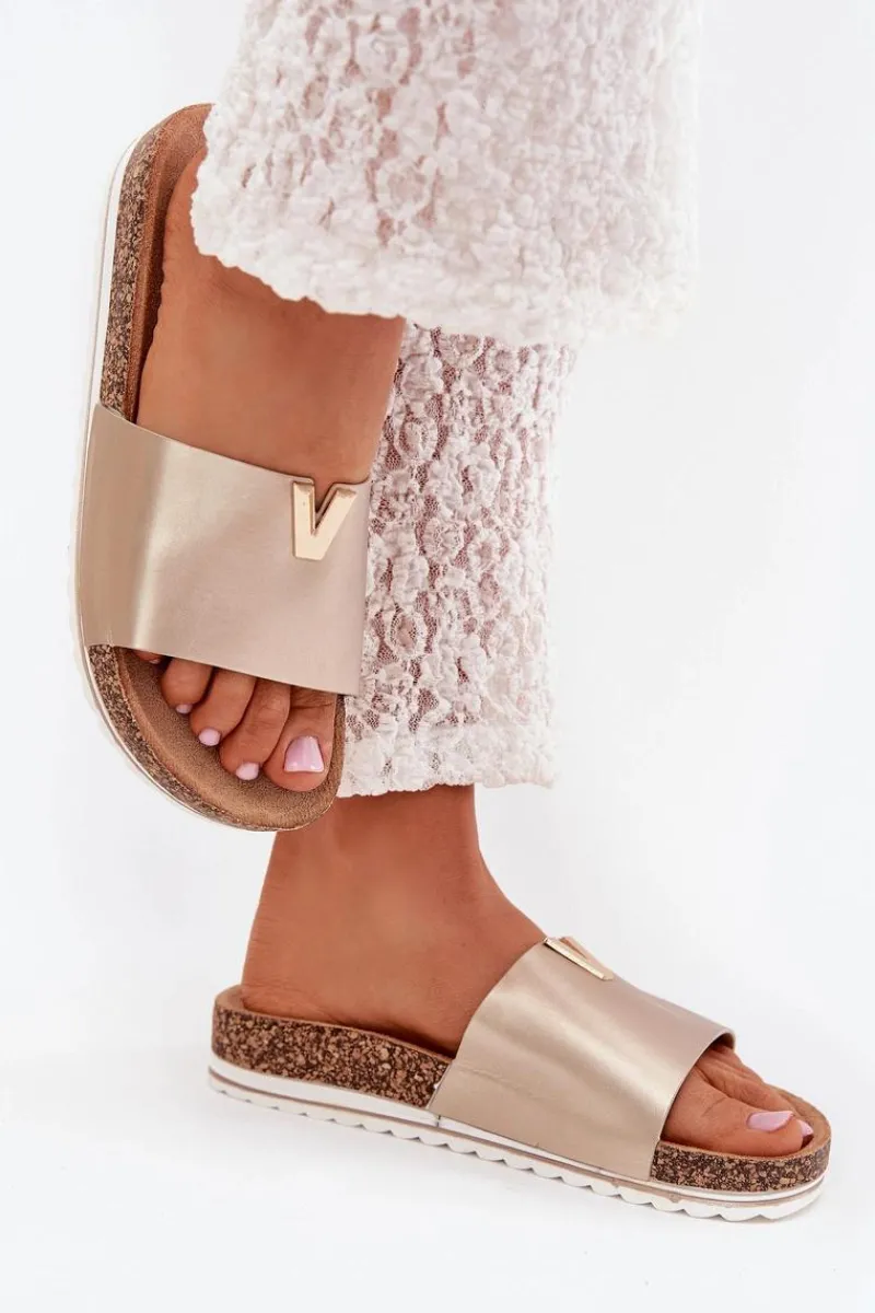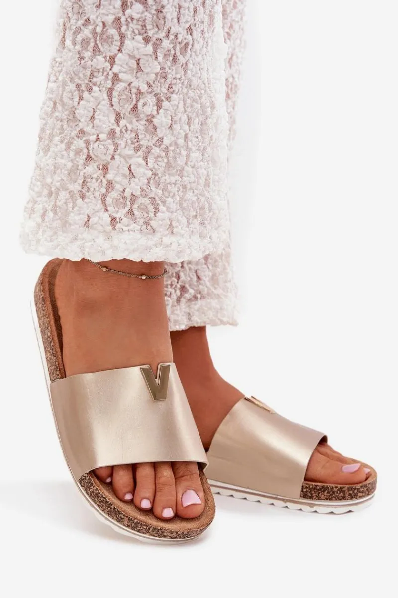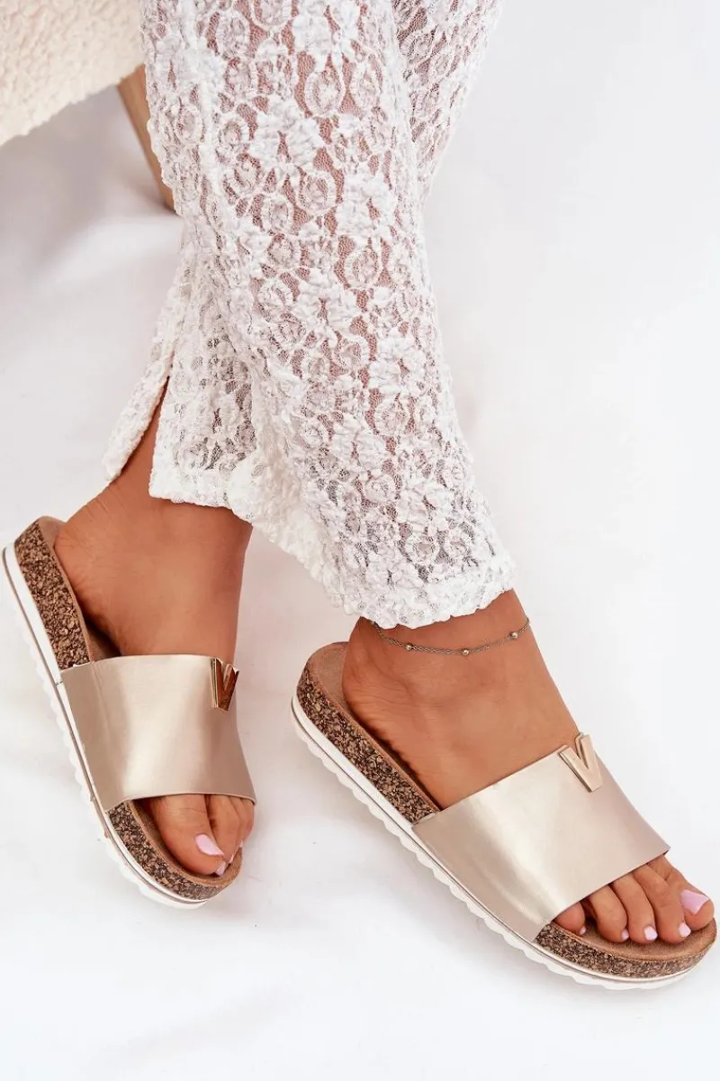 Klapki damskie z eko skóry, osadzone na korkowej platformie, to połączenie komfortu i stylu. Złoty detal w kształcie litery „V” dodaje im elegancji, a profilowana, eko zamszowa wkładka zapewnia wygodę przez cały dzień. Idealne do codziennych stylizacji, doskonale komponują się z sukienkami, spódnicami czy spodniami, łącząc funkcjonalność z modnym wyglądem. Przy wyborze rozmiaru prosimy sugerować się tabelą rozmiarów.