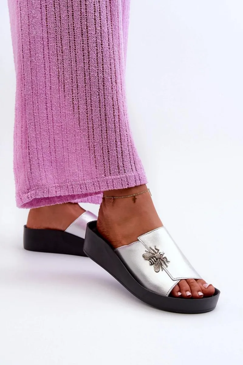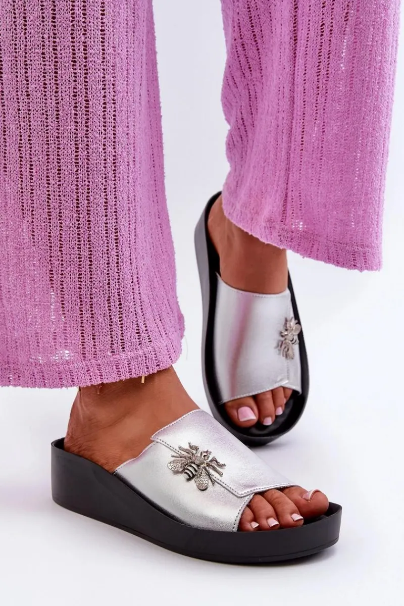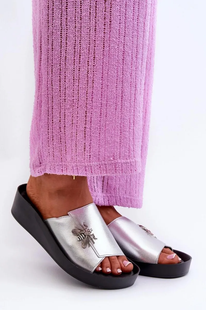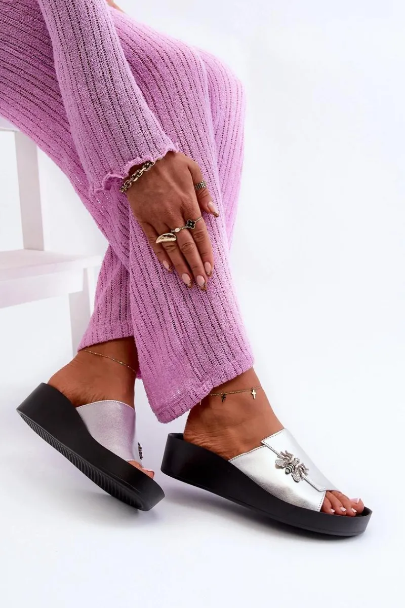 Damskie klapki wykonane z wysokiej jakości naturalnej skóry to połączenie elegancji i komfortu. Osadzone na stabilnej platformie i delikatnym koturnie. Miękka wkładka, także wykonana z naturalnej skóry, gwarantuje wygodę przez cały dzień. Urocza ozdoba umieszczona na pasku dodaje wyjątkowego uroku i stylu, czyniąc je idealnym wyborem na różne okazje, od codziennych spacerów po bardziej eleganckie wyjścia. Przy wyborze rozmiaru prosimy sugerować się tabelą rozmiarów.