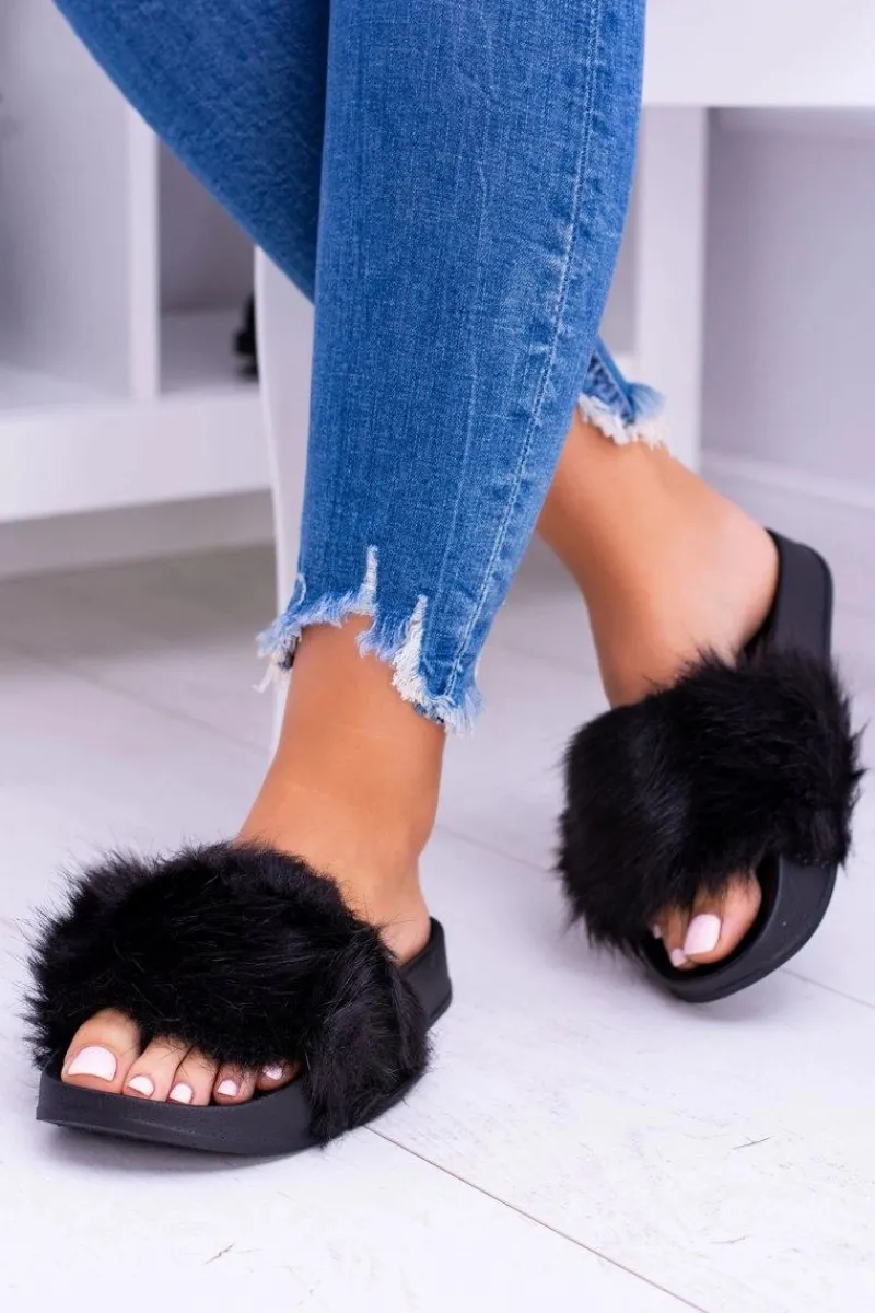 Klapki Z Futerkiem|Klapki Damskie Klasyczne>Boto Damskie Czarne Klapki Z Dużym Futerkiem Fluffy