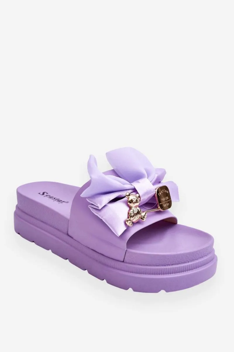 Cudowne, damskie klapki wykonane z eko skóry. Model ten posiada materiałową kokardę i imitację agrafki z misiem i blaszką z napisem. Osadzone na masywnej platformie. Wkładka została wykonana z tworzywa sztucznego. Idealne klapki na nadchodzący sezon! Koniecznie powinnaś je mieć! Przy wyborze rozmiaru prosimy sugerować się tabelą rozmiarów.