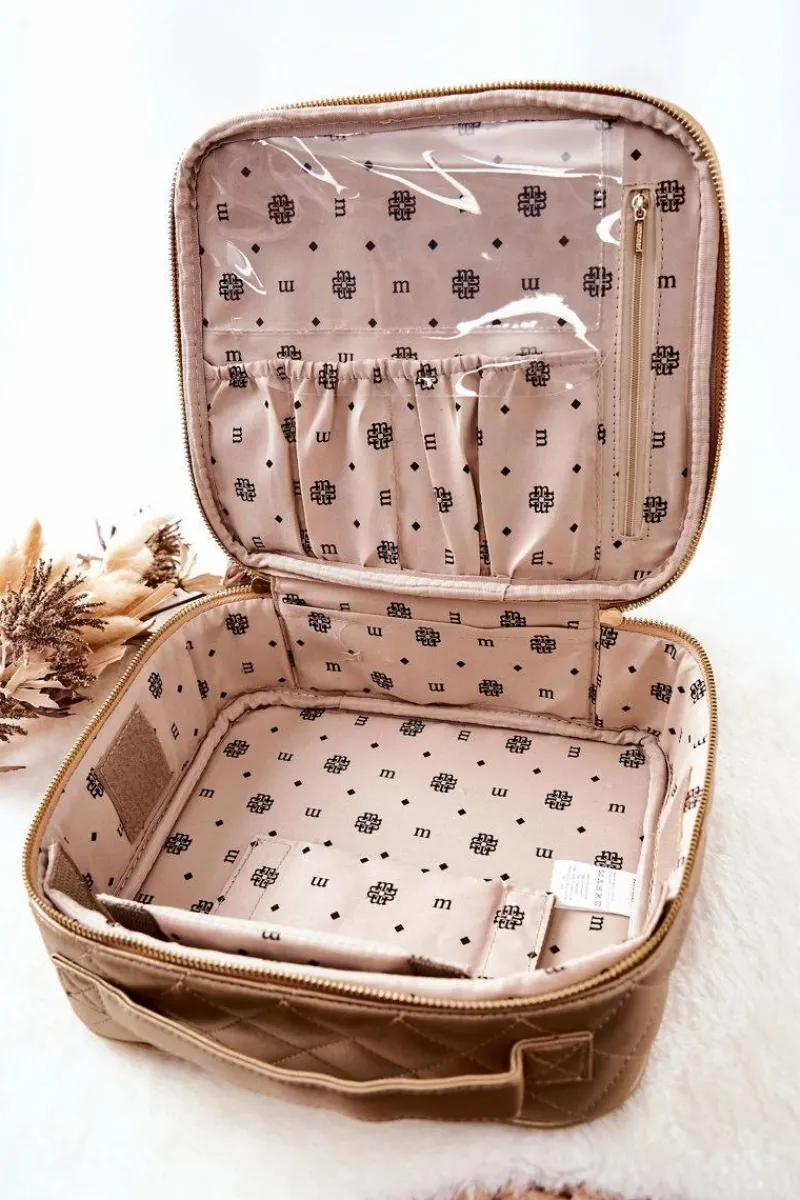 Kosmetyczka została wykonana z eko skóry. Może być również użytkowana jako podręczny kuferek-organizer. Wierzch zdobiony pikowaniem. Zapinanie na jeden suwak sprawi, że mamy wygodny dostęp do zawartości. W środku znajduje się duża ilość miejsca, która jest podzielona na kilka różnych kieszonek. Dzięki przymocowaniu przegródek na rzepy, można środek zmodyfikować pod swoje potrzeby. Znajduje się tam także kieszonka zapinana na suwak oraz kilka mniejszych kieszonek na gumki. Wnętrze kosmetyczki wypełnia jasna, logowana podszewka.