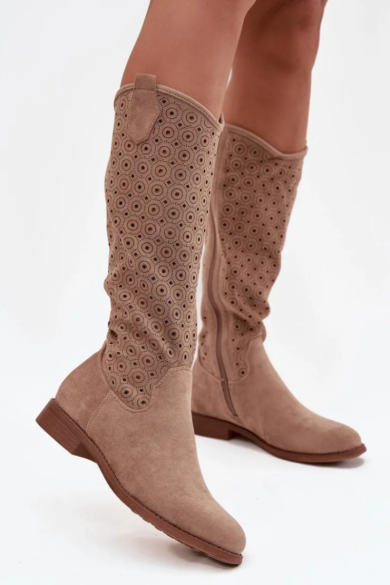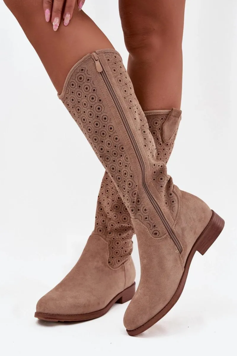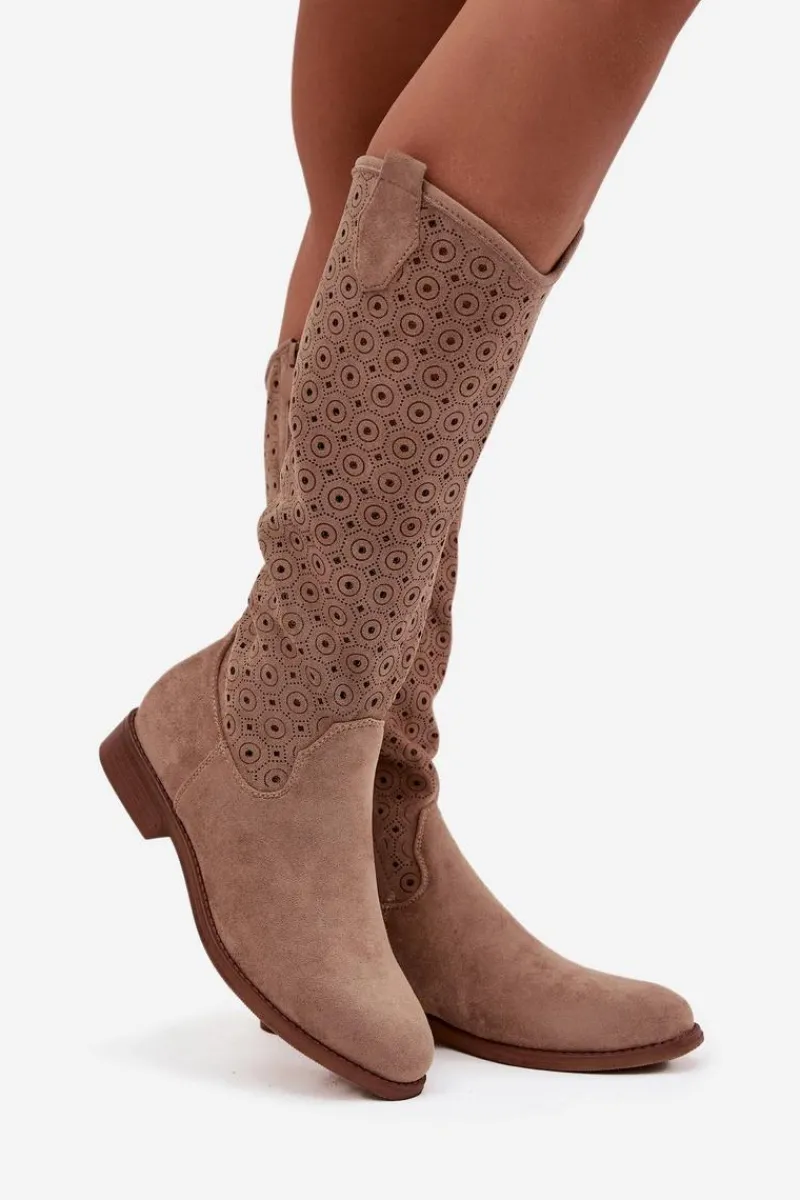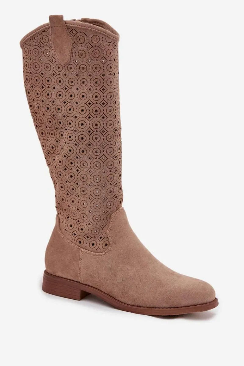 Kozaki Ażurowe|Kozaki Płaskie>Damskie buty S.Barski Kozaki Damskie Na Płaskim Obcasie Z Ażurowym Wzorem S.Barski HY52-531 Beżowe Beżowy