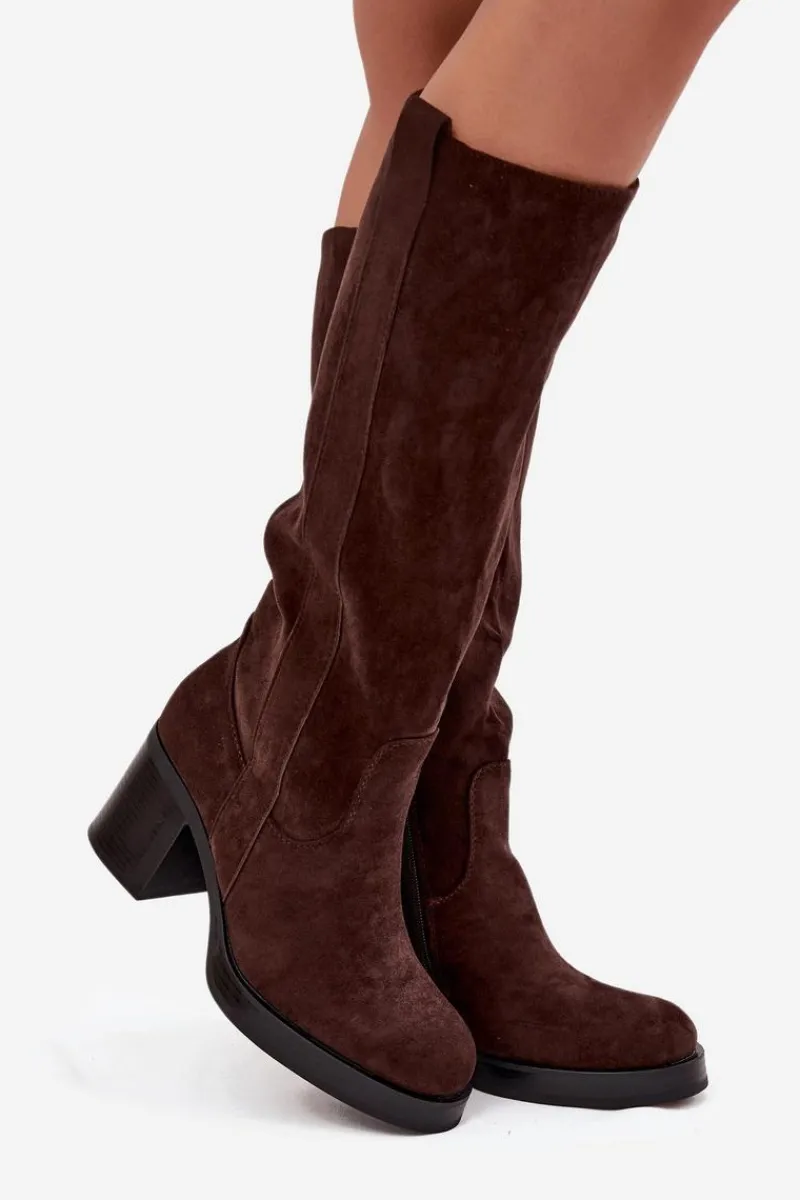 Kozaki damskie wykonane z eko zamszu to doskonała propozycja na sezon jesienno-zimowy. Model osadzony na masywnym obcasie typu słupek zapewnia stabilność oraz wygodę podczas noszenia. Zaokrąglone noski nadają całości klasycznego wyglądu, a praktyczne zapięcie na zamek ułatwia zakładanie i zdejmowanie. Wnętrze ocieplane miękkim kocem obuwniczym gwarantuje komfort termiczny w chłodniejsze dni. To uniwersalne kozaki, które świetnie sprawdzą się zarówno w codziennych, jak i bardziej eleganckich stylizacjach. Przy wyborze rozmiaru prosimy sugerować się tabelą rozmiarów.