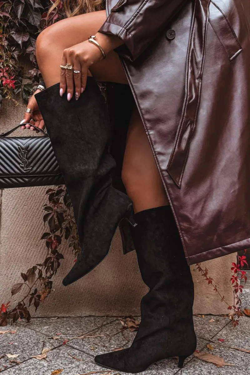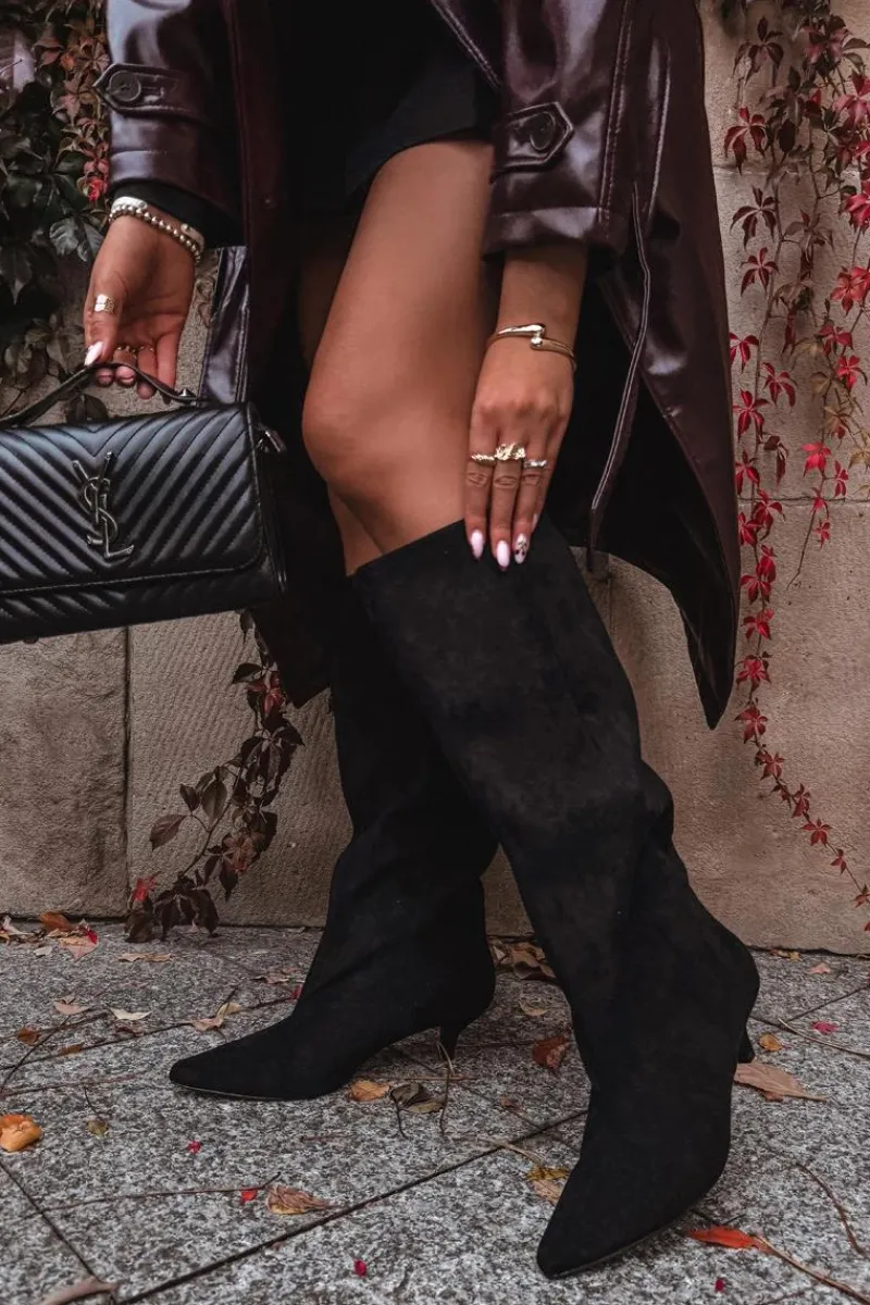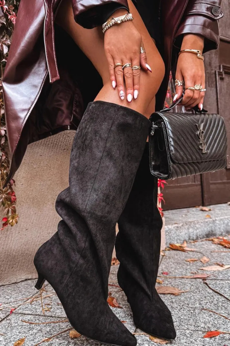 Kozaki damskie z eko zamszu to połączenie wygody i ponadczasowej elegancji. Model wsuwany, z luźną cholewką, doskonale układa się na nodze, podkreślając jej smukły kształt. Niski obcas zapewnia komfort przez cały dzień. Przeszycie biegnące wzdłuż cholewki z przodu optycznie wydłuża nogę. Idealne zarówno do sukienek, jak i dopasowanych spodni – perfekcyjny wybór na co dzień i na wyjątkowe okazje. Przy wyborze rozmiaru prosimy sugerować się tabelą rozmiarów.
