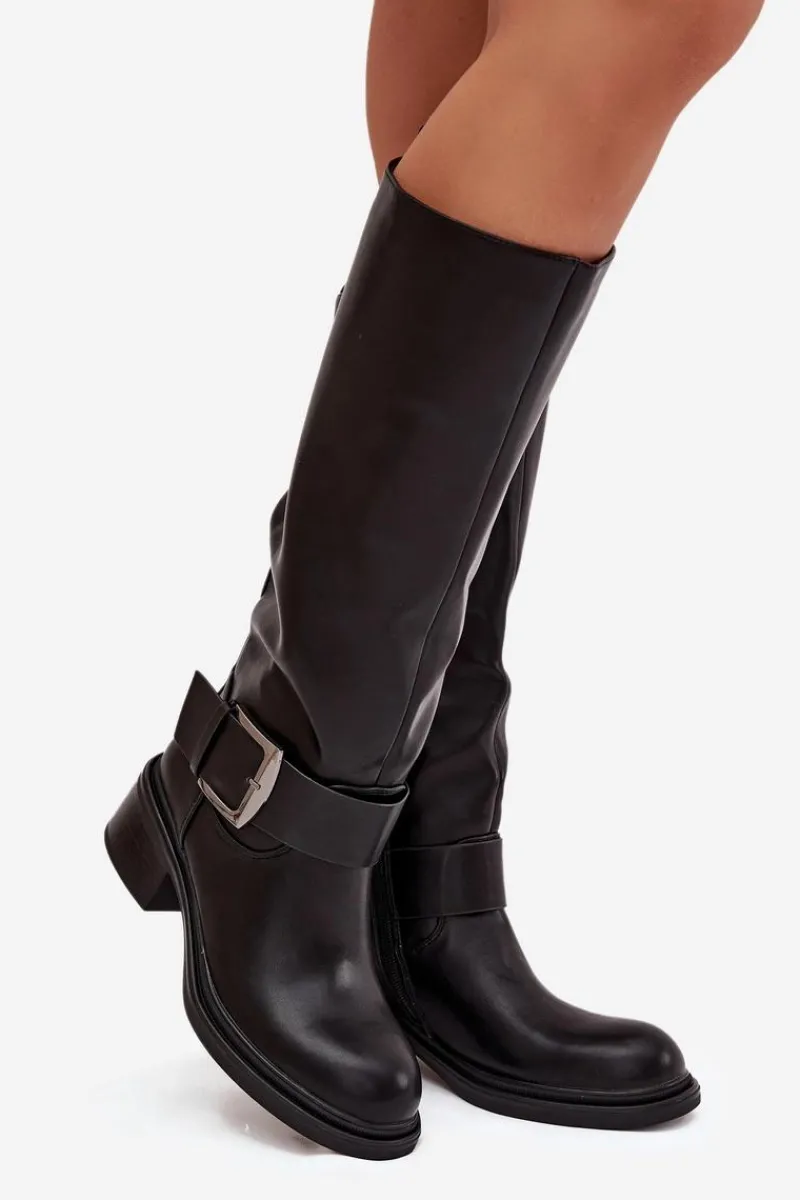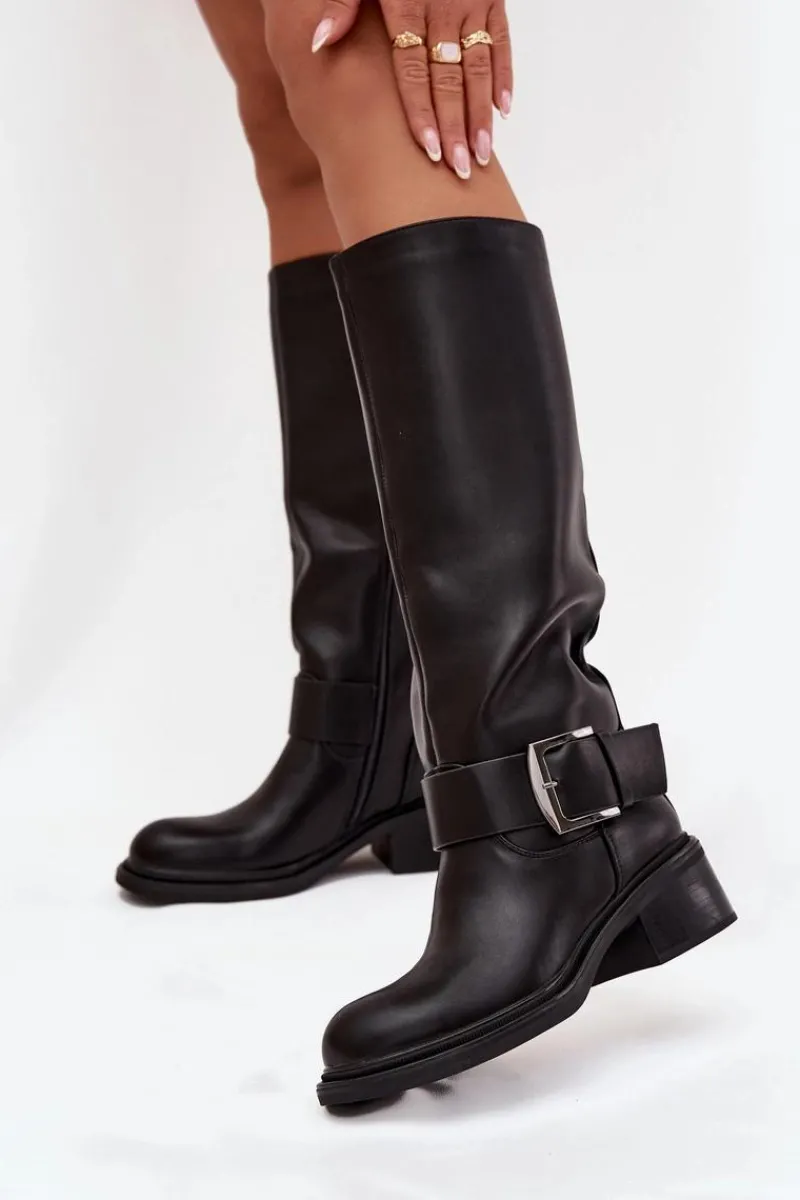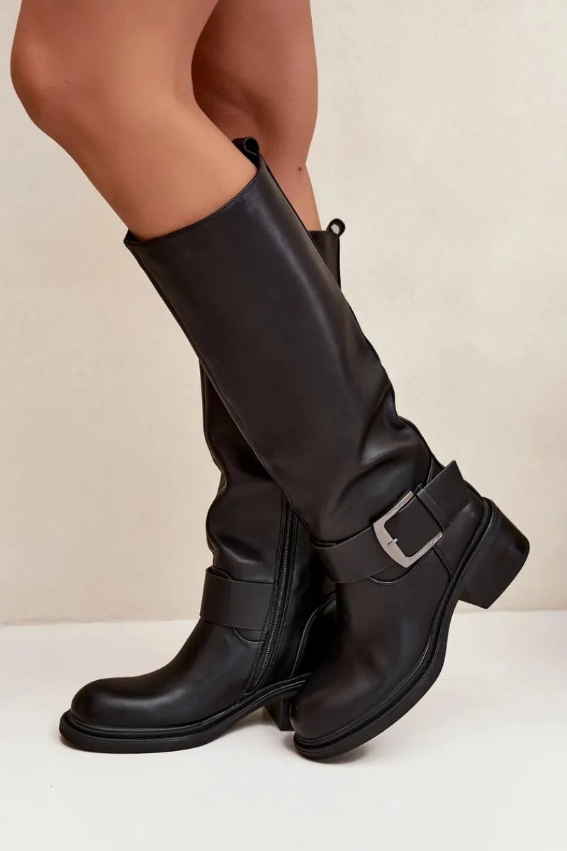 Kozaki damskie wykonane z eko skóry. Osadzone na stabilnym obcasie typu klocek zapewniają komfort noszenia i świetną stabilność, dzięki czemu sprawdzą się zarówno na co dzień, jak i podczas dłuższych wyjść. Wnętrze wykończone miękkim kocem obuwniczym gwarantuje ciepło i wygodę w chłodniejsze dni. Charakterystycznym elementem tego modelu jest dekoracyjny pasek z dużą klamrą umieszczony w dolnej części cholewki, który nadaje wyrazistego, modnego akcentu. Dzięki temu kozaki zyskują nowoczesny charakter i przyciągają uwagę, doskonale komponując się zarówno z jeansami, jak i z sukienkami czy spódnicami. To idealne obuwie dla kobiet, które chcą połączyć klasykę z nutą oryginalności. Przy wyborze rozmiaru prosimy sugerować się tabelą rozmiarów.