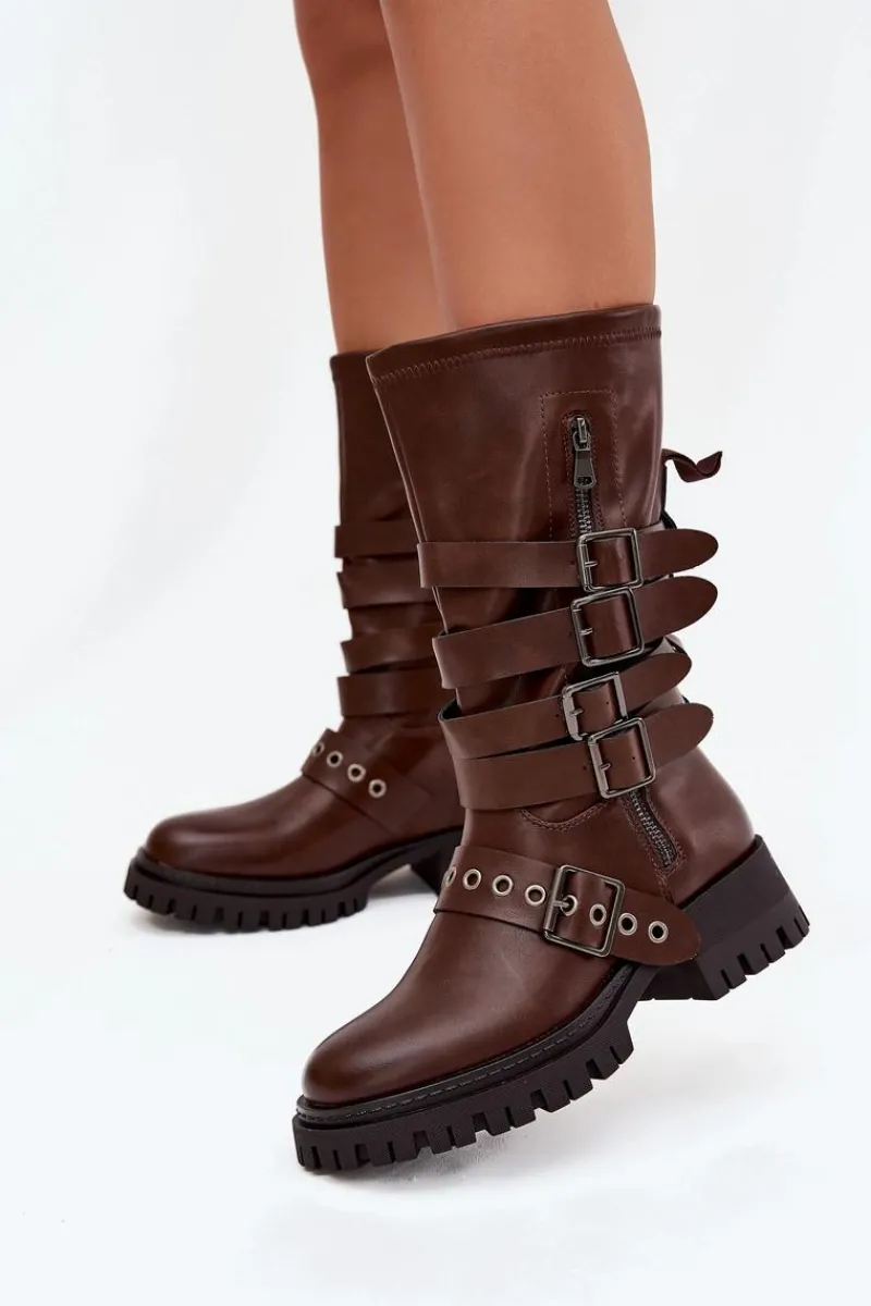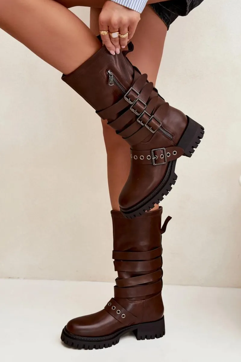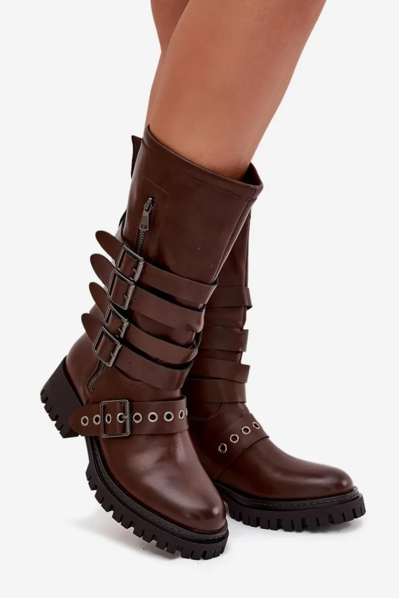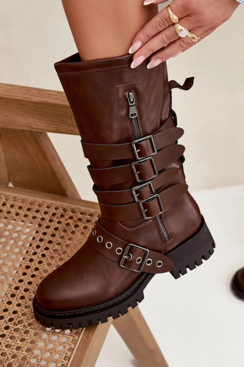 Kozaki damskie z cholewką do połowy łydki to stylowa i praktyczna propozycja na chłodniejsze dni. Model wsuwany z dodatkowym suwakiem zapewnia wygodę zakładania i dobre dopasowanie do nogi. Stabilny obcas w formie klocka gwarantuje komfort podczas chodzenia, a ozdobne paski z klamrami nadają całości charakteru i modnego, wyrazistego wyglądu. To kozaki, które doskonale sprawdzą się w codziennych stylizacjach, dodając im oryginalnego akcentu. Przy wyborze rozmiaru prosimy sugerować się tabelą rozmiarów.