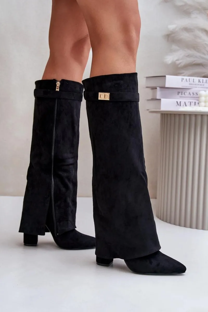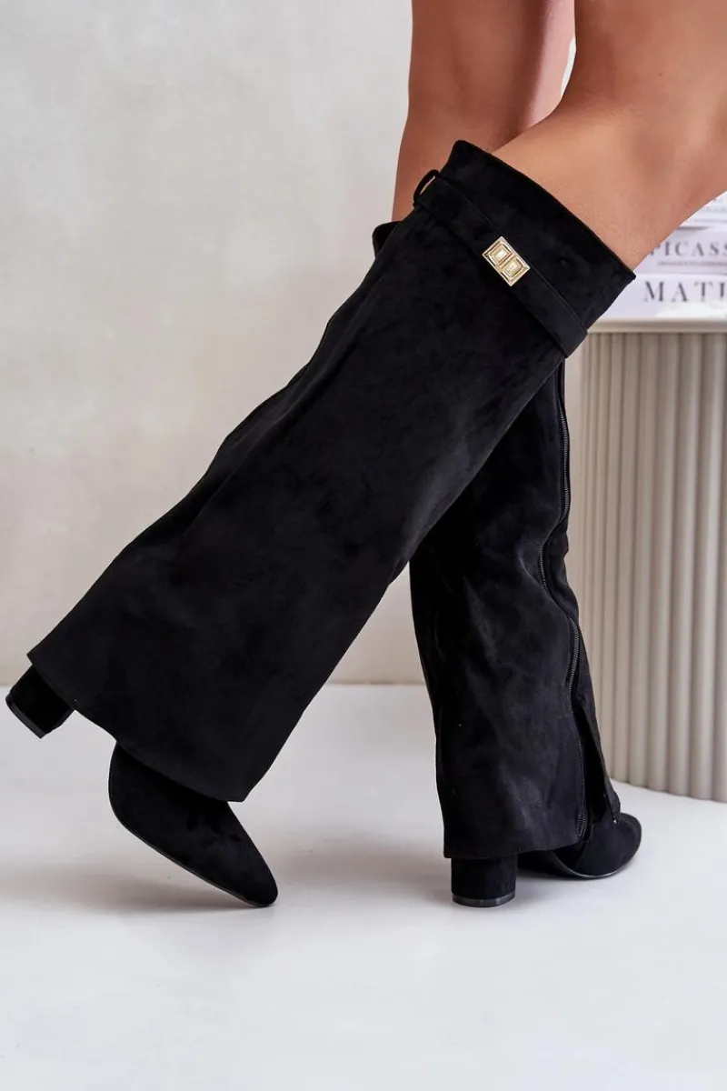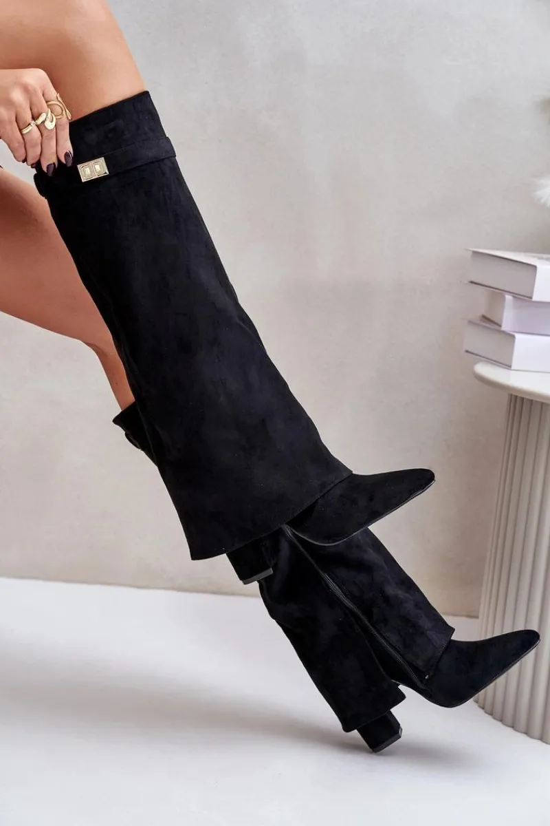 Eleganckie damskie kozaki z ekologicznego zamszu. Osadzone na obcasie w formie słupka. Noski w szpic. Wyjątkowym elementem tego modelu jest wywinięta cholewka z odpinanym paskiem na górze cholewki, która zachodzi na obcas. Zapięcie na suwak. Doskonałe do noszenia z sukienkami lub spódnicami! Przy wyborze rozmiaru prosimy sugerować się tabelą rozmiarów.