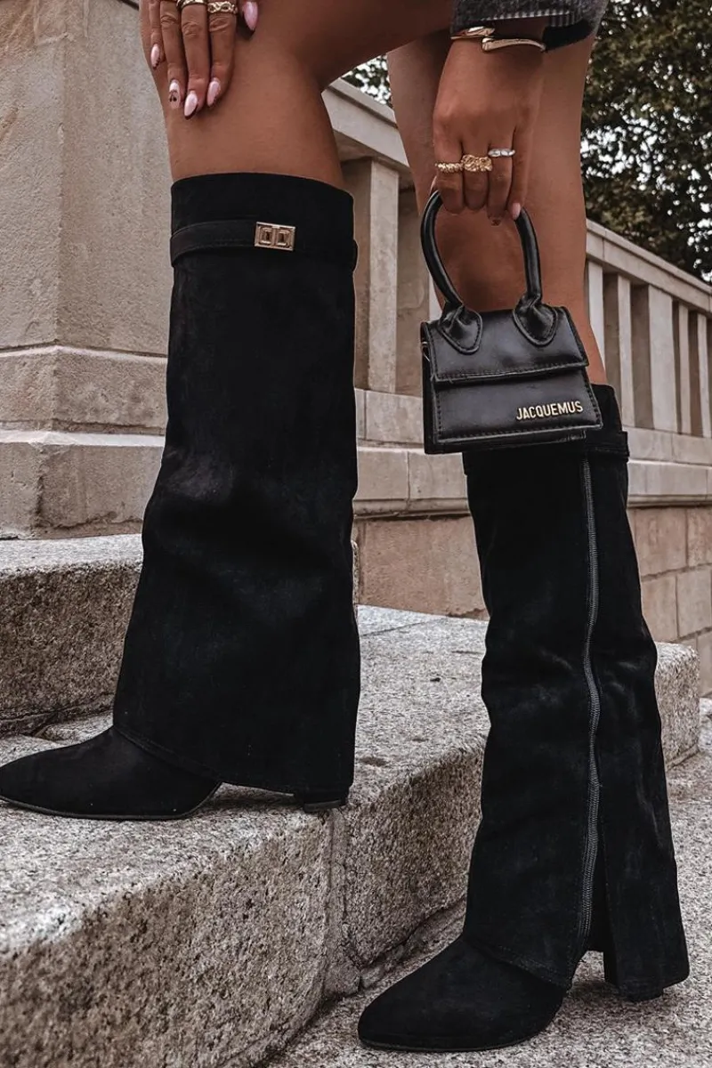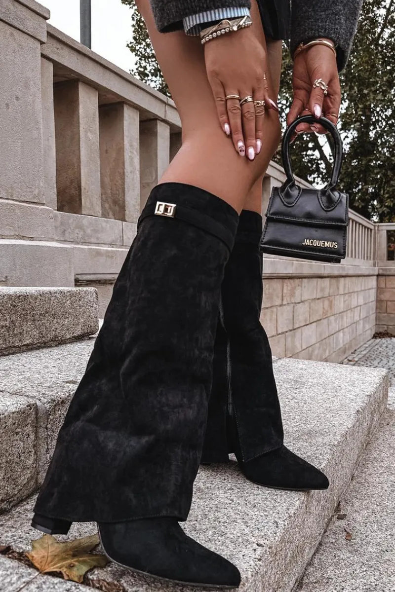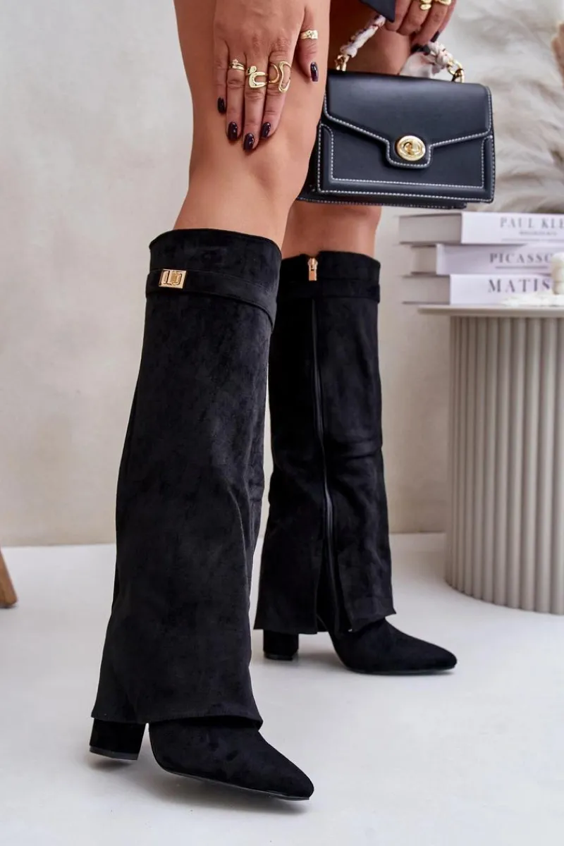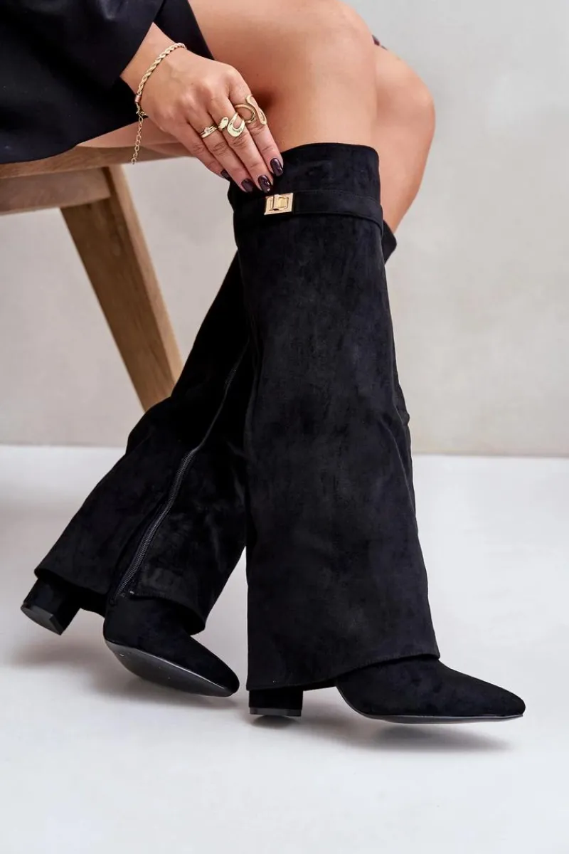Eleganckie damskie kozaki z ekologicznego zamszu. Osadzone na obcasie w formie słupka. Noski w szpic. Wyjątkowym elementem tego modelu jest wywinięta cholewka z odpinanym paskiem na górze cholewki, która zachodzi na obcas. Zapięcie na suwak. Doskonałe do noszenia z sukienkami lub spódnicami! Przy wyborze rozmiaru prosimy sugerować się tabelą rozmiarów.