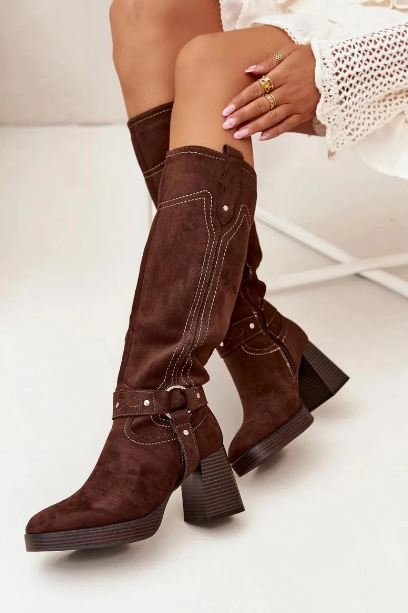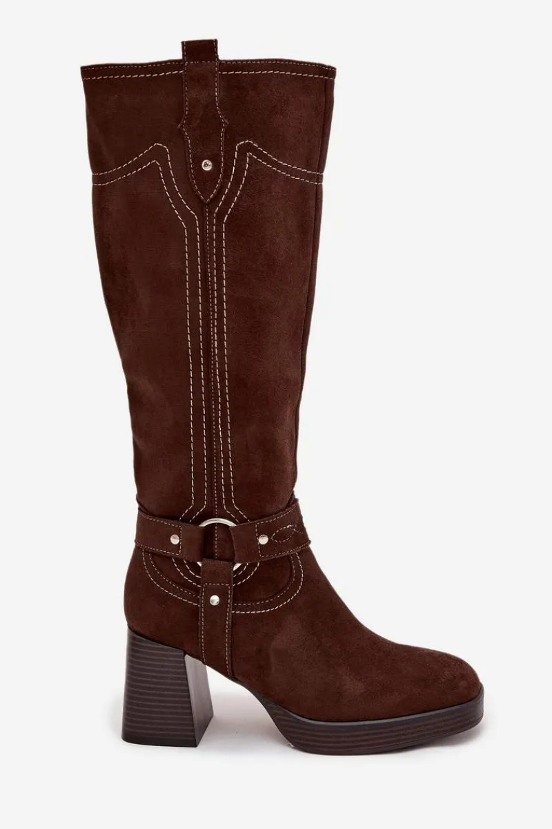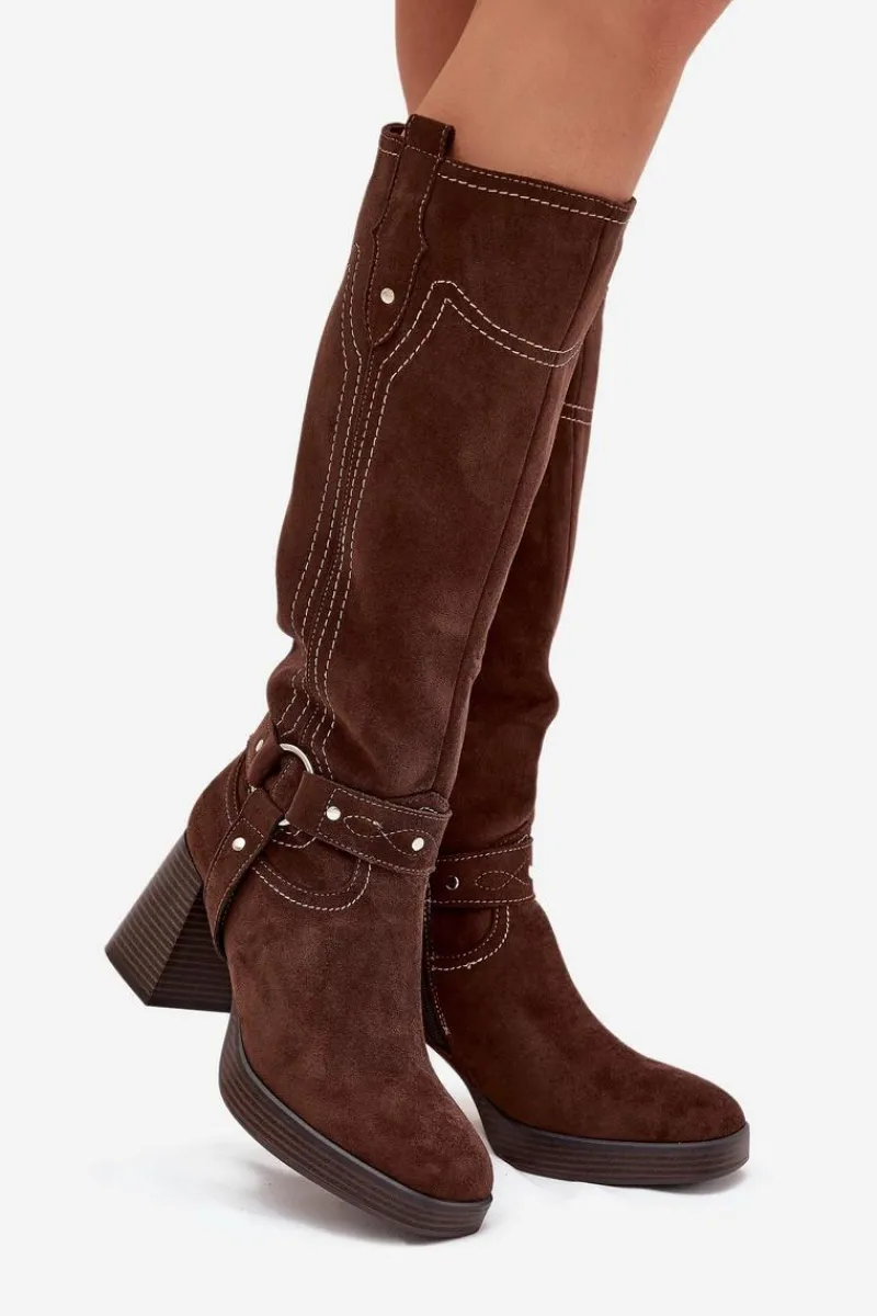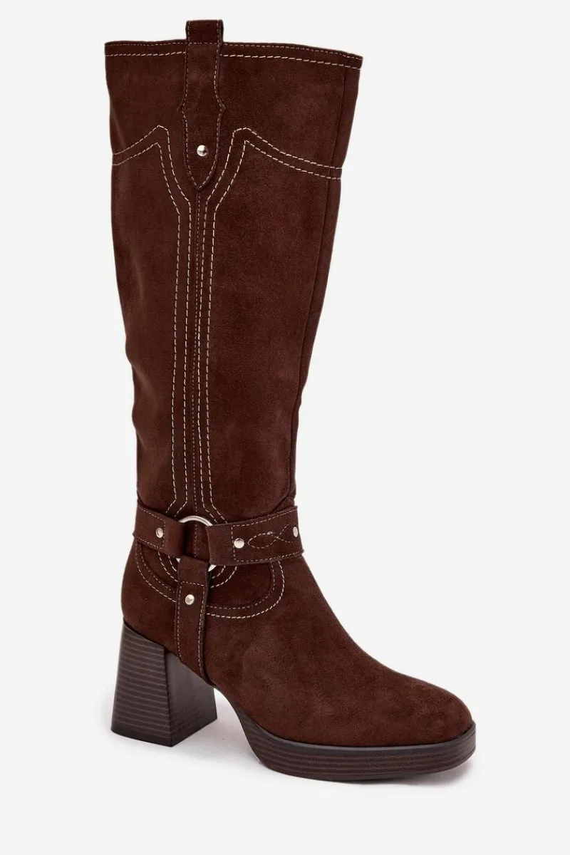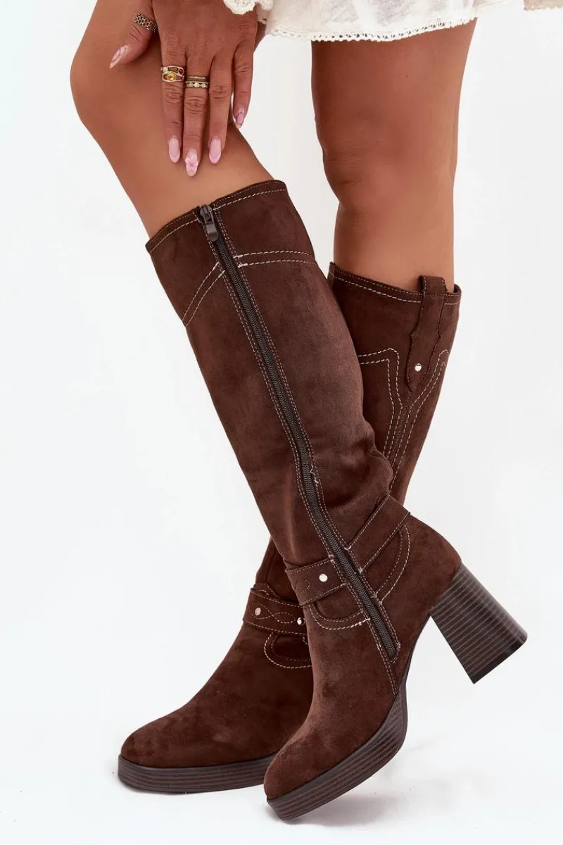 Kozaki damskie wykonane z eko zamszu. Osadzone na słupkowym obcasie. Zapinane na zamek, zapewniają łatwość zakładania, a ocieplenie kocem obuwniczym gwarantuje ciepło w chłodniejsze dni. Cholewka sięgająca do kolana ozdobiona jest subtelnym elementem z paskami oraz przeszyciami, które dodają butom charakteru. Te kozaki będą doskonałym wyborem do eleganckich i casualowych stylizacji, zapewniając komfort i modny wygląd. Przy wyborze rozmiaru prosimy sugerować się tabelą rozmiarów.