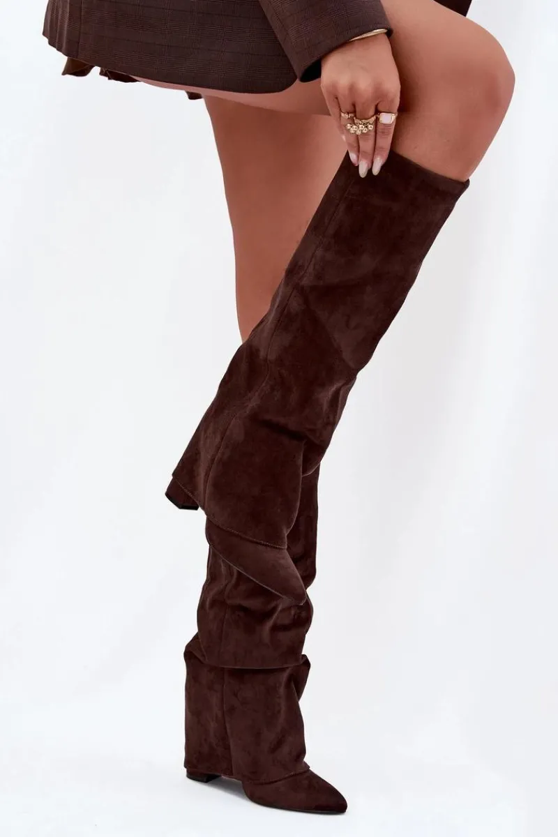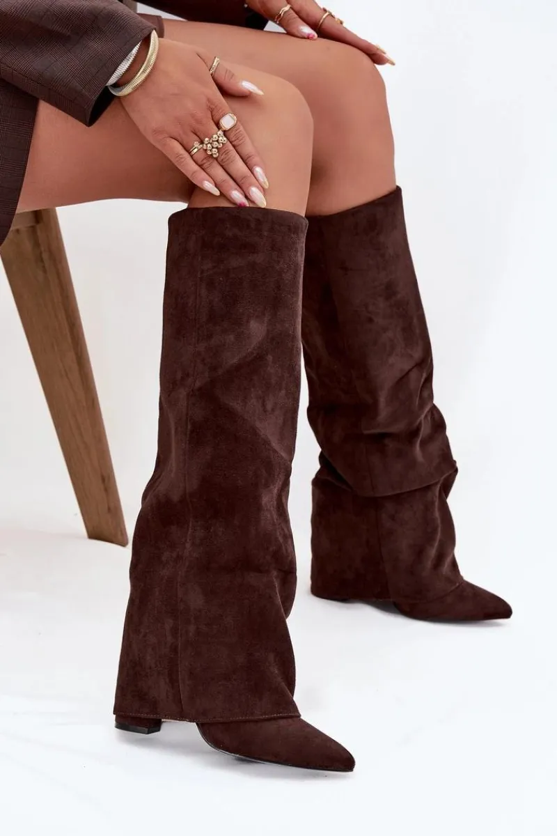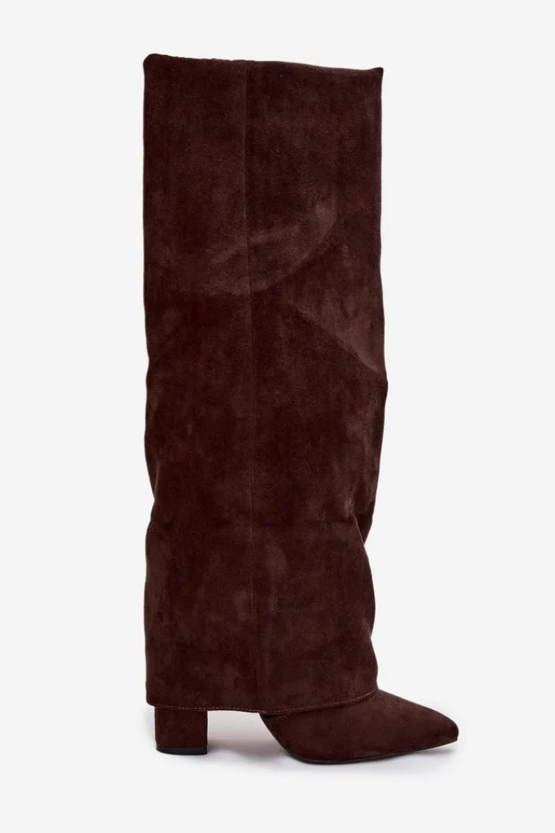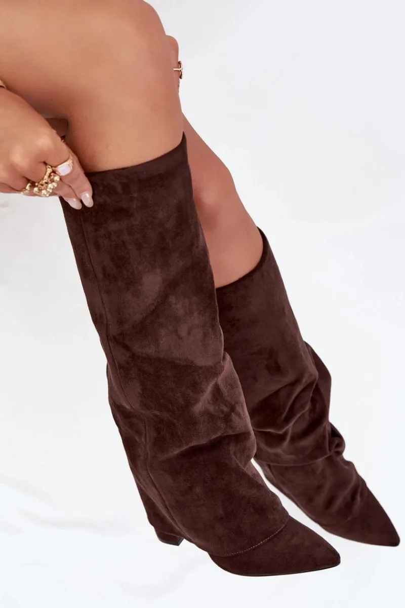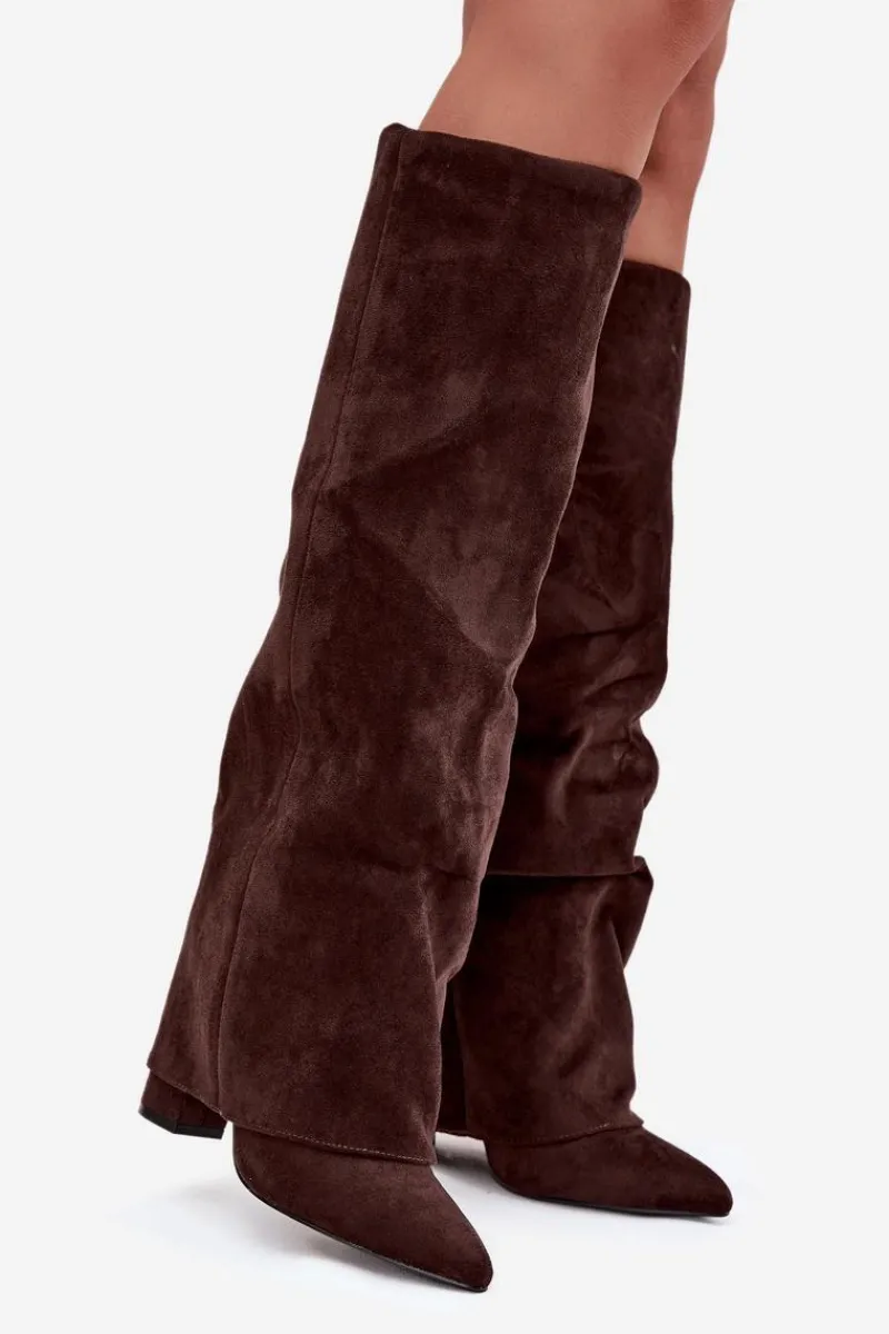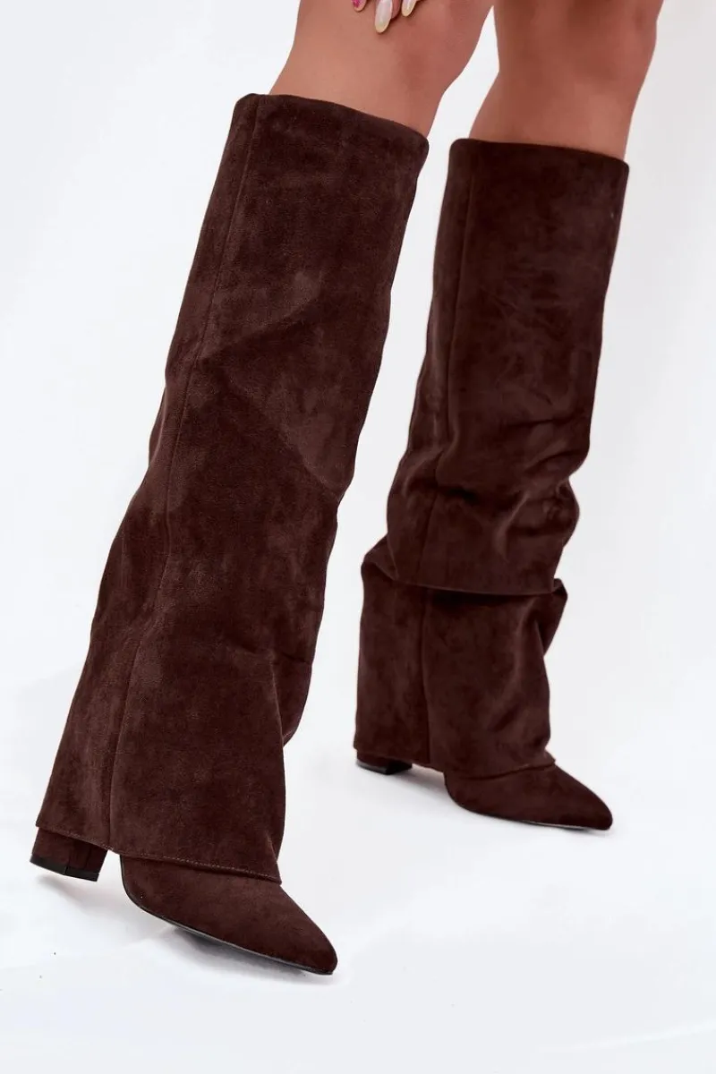 Kozaki damskie z wywiniętą cholewką to prawdziwy must-have na nadchodzący sezon jesienno-zimowy! Wsuwane i osadzone na stabilnym obcasie typu słupek, gwarantują wygodę i pewny krok. Ocieplenie zapewnia komfort w chłodniejsze dni, a wywinięta cholewka, nachodząca na obcas, dodaje im oryginalnego charakteru. Szpiczaste noski podkreślają kobiecy styl, dzięki czemu kozaki świetnie sprawdzą się w efektownych, zimowych stylizacjach. Przy wyborze rozmiaru prosimy sugerować się tabelą rozmiarów.