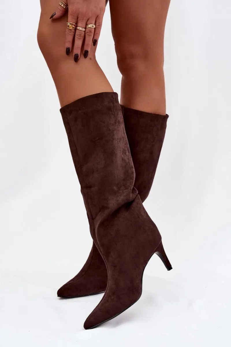 Kozaki Olivienne to kwintesencja kobiecego stylu i elegancji. Wykonane z wysokiej jakości eko zamszu w głębokim czekoladowym odcieniu, stanowią stylowy wybór na chłodniejsze dni. Ich smukła linia oraz szpiczasty nosek subtelnie wysmuklają nogi, a smukła szpilka o wysokości 7 cm dodaje sylwetce lekkości i zmysłowego wdzięku.