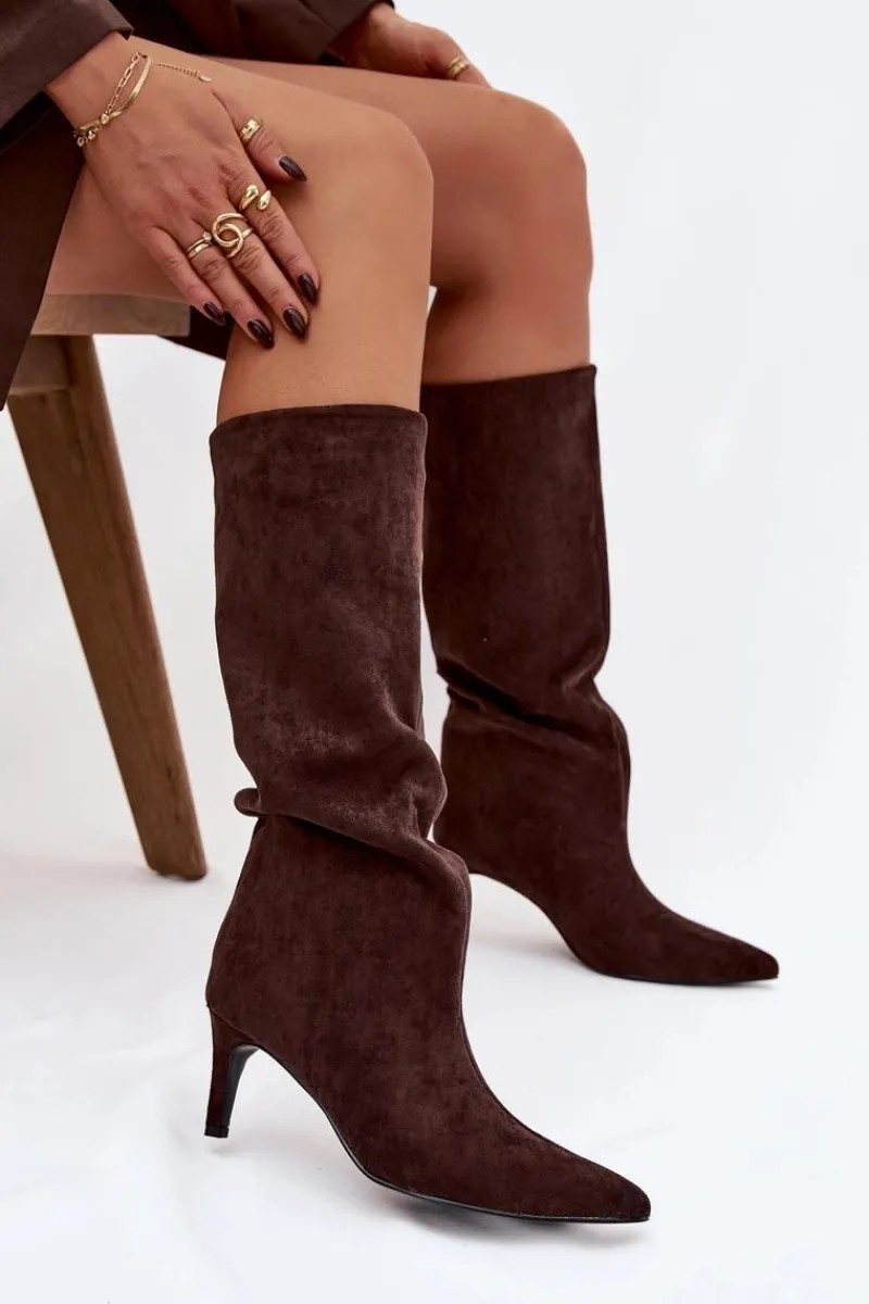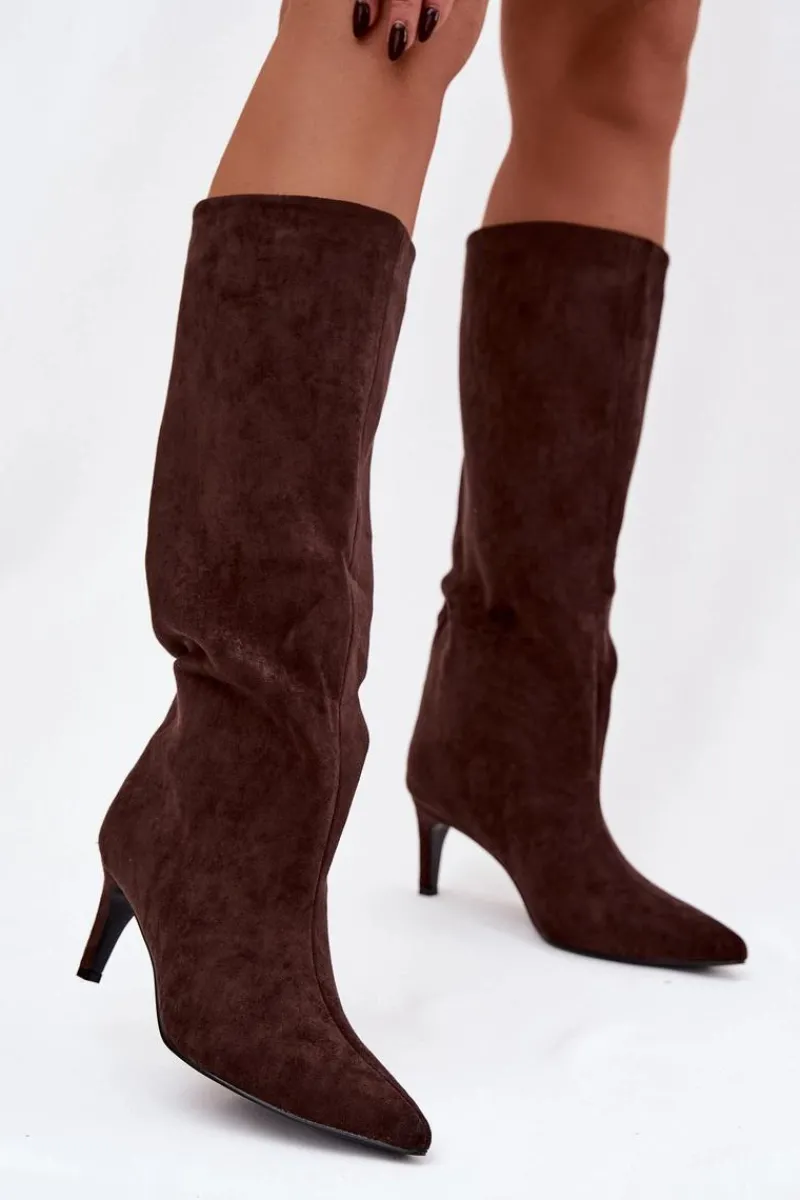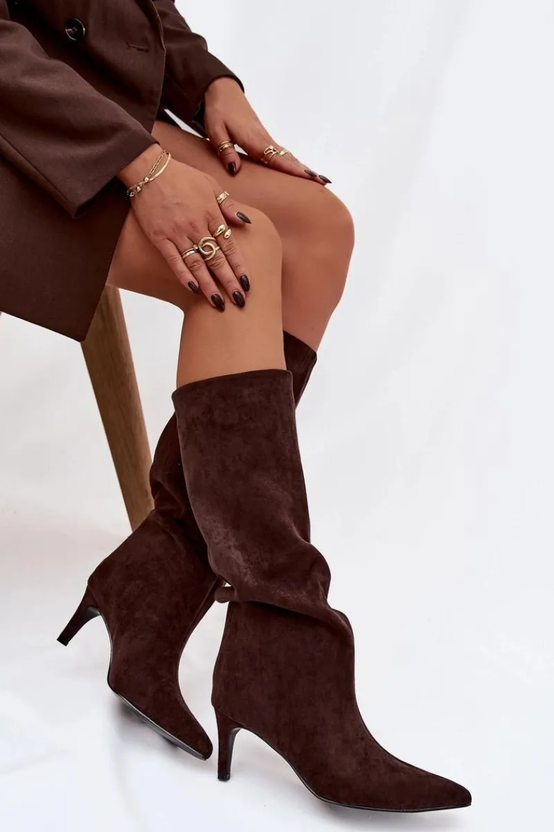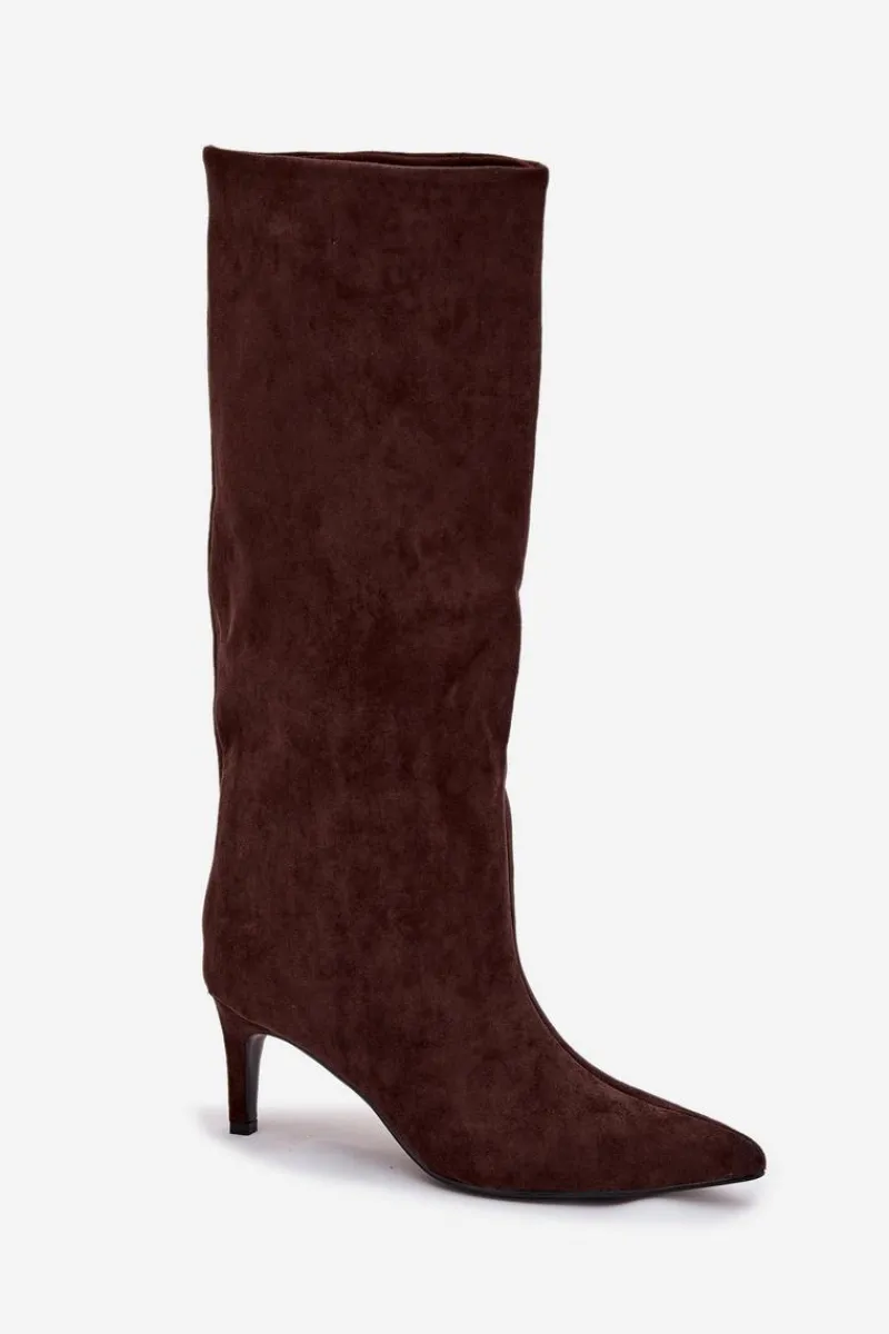 Kozaki damskie wsuwane ocieplane na szpilce czekoladowe Olivienne