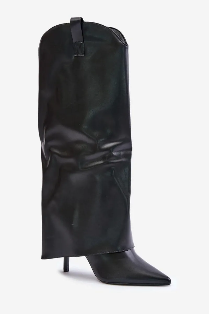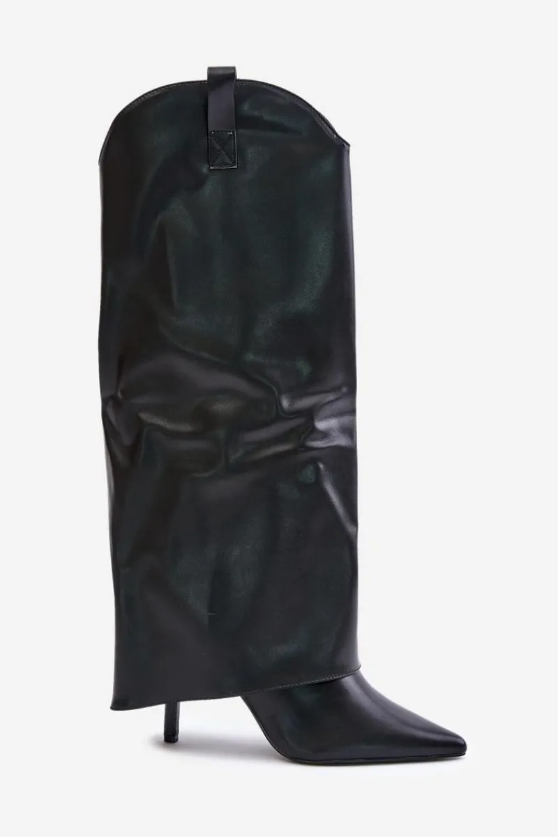 Kozaki wykonane z eko skóry, wyróżniają się wywiniętą cholewką, która efektownie zachodzi na obcas. Model posiada noski w szpic, dodające mu szyku, a zamek po boku ułatwia zakładanie i zdejmowanie butów. Osadzone na smukłej szpilce, sięgają do kolana, podkreślając kobiecą sylwetkę. Idealne do eleganckich, jesienno-zimowych stylizacji! Przy wyborze rozmiaru prosimy sugerować się tabelą rozmiarów.