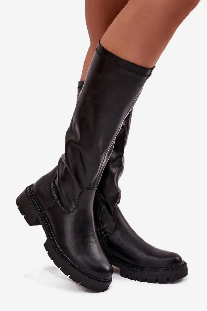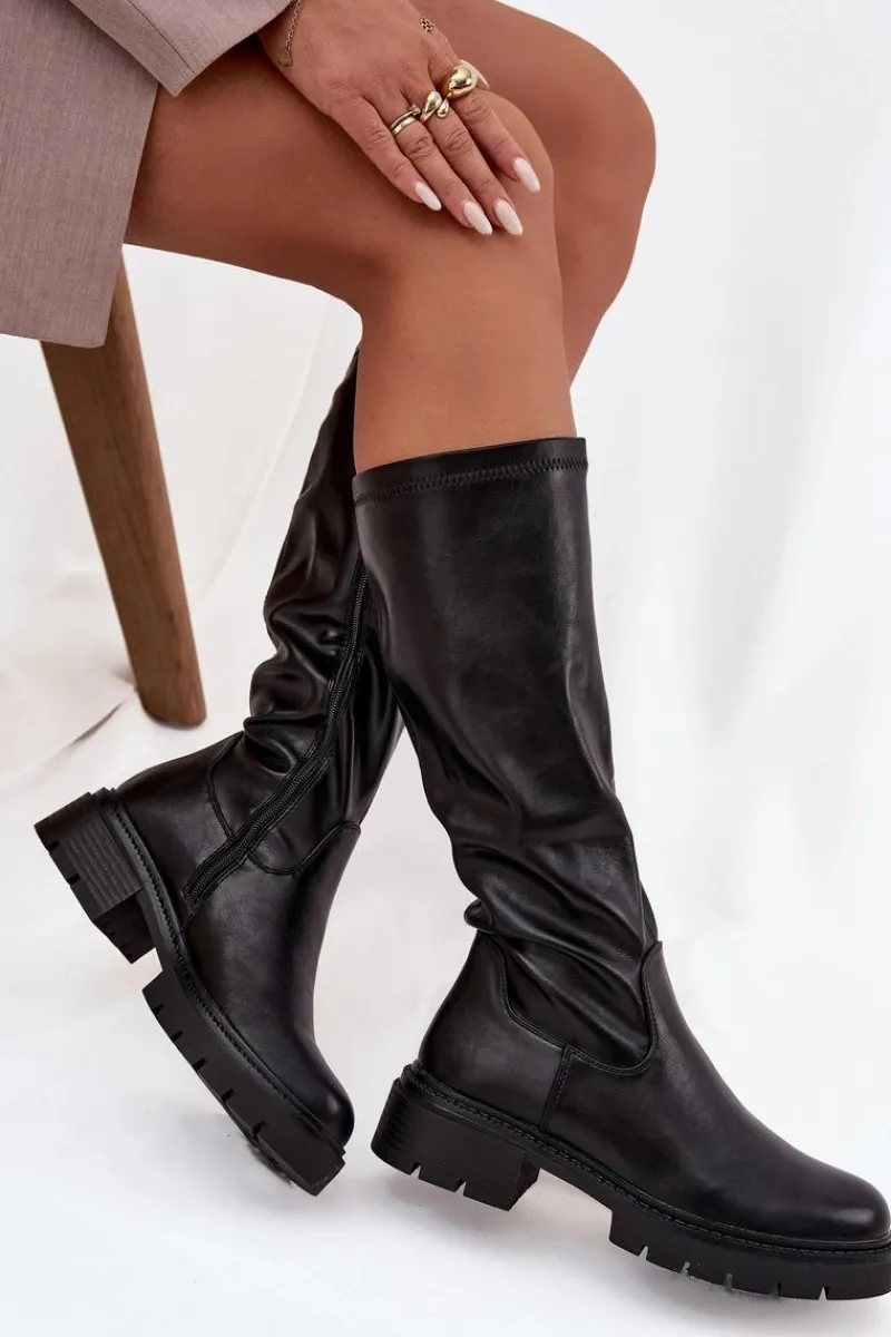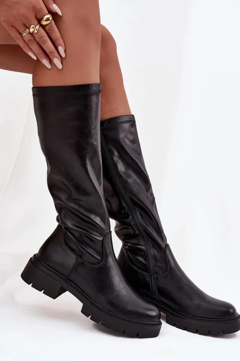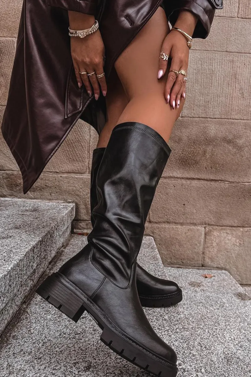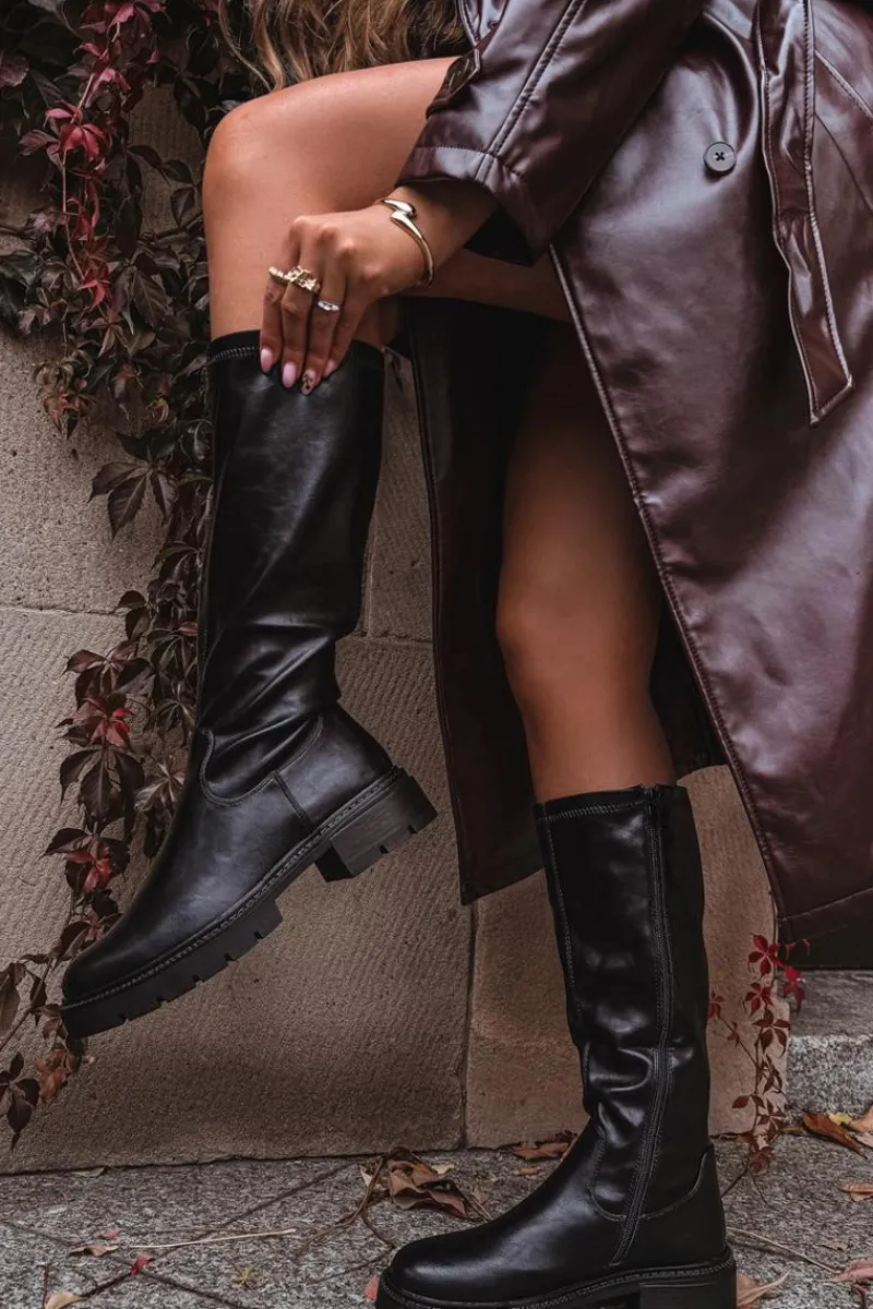 Kozaki damskie wykonane z eko skóry to klasyczna propozycja na chłodniejsze dni. Model z dopasowaną cholewką pięknie podkreśla nogę, tworząc kobiecą i smukłą sylwetkę. Wnętrze ocieplane kocem obuwniczym na wysokości stopy zapewnia komfort oraz ciepło podczas noszenia. Praktyczne zapięcie na zamek ułatwia zakładanie i zdejmowanie obuwia. To ponadczasowy fason, który doskonale komponuje się zarówno z sukienkami, jak i spódnicami, tworząc stylowe outfity. Przy wyborze rozmiaru prosimy sugerować się tabelą rozmiarów.