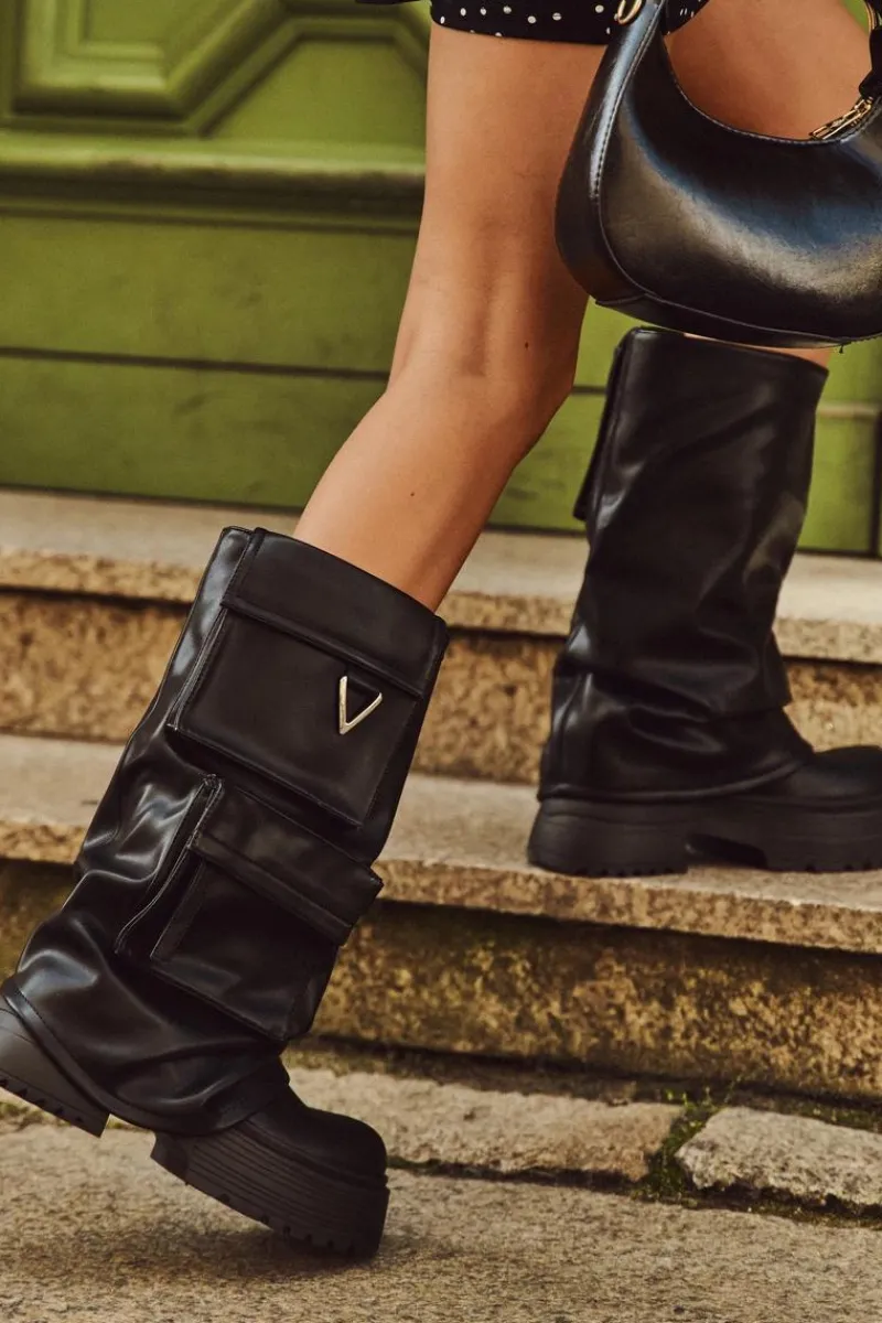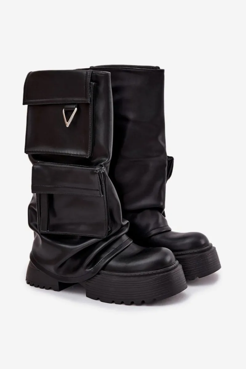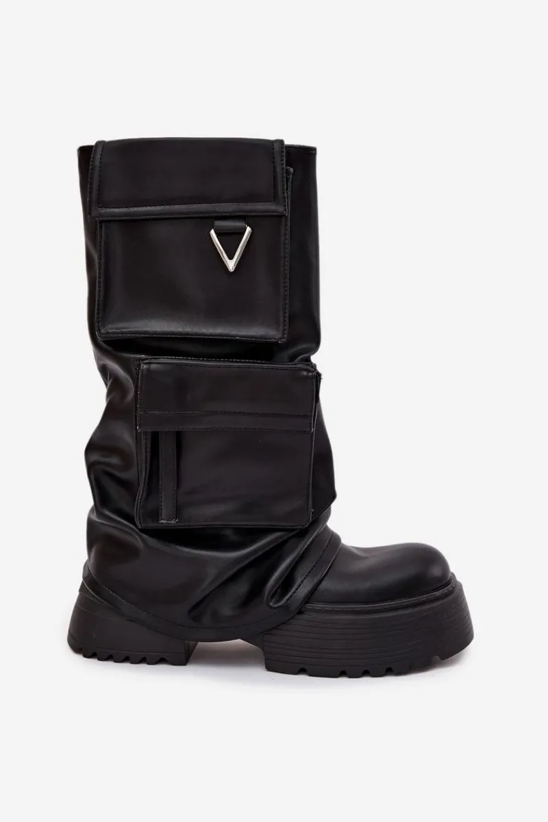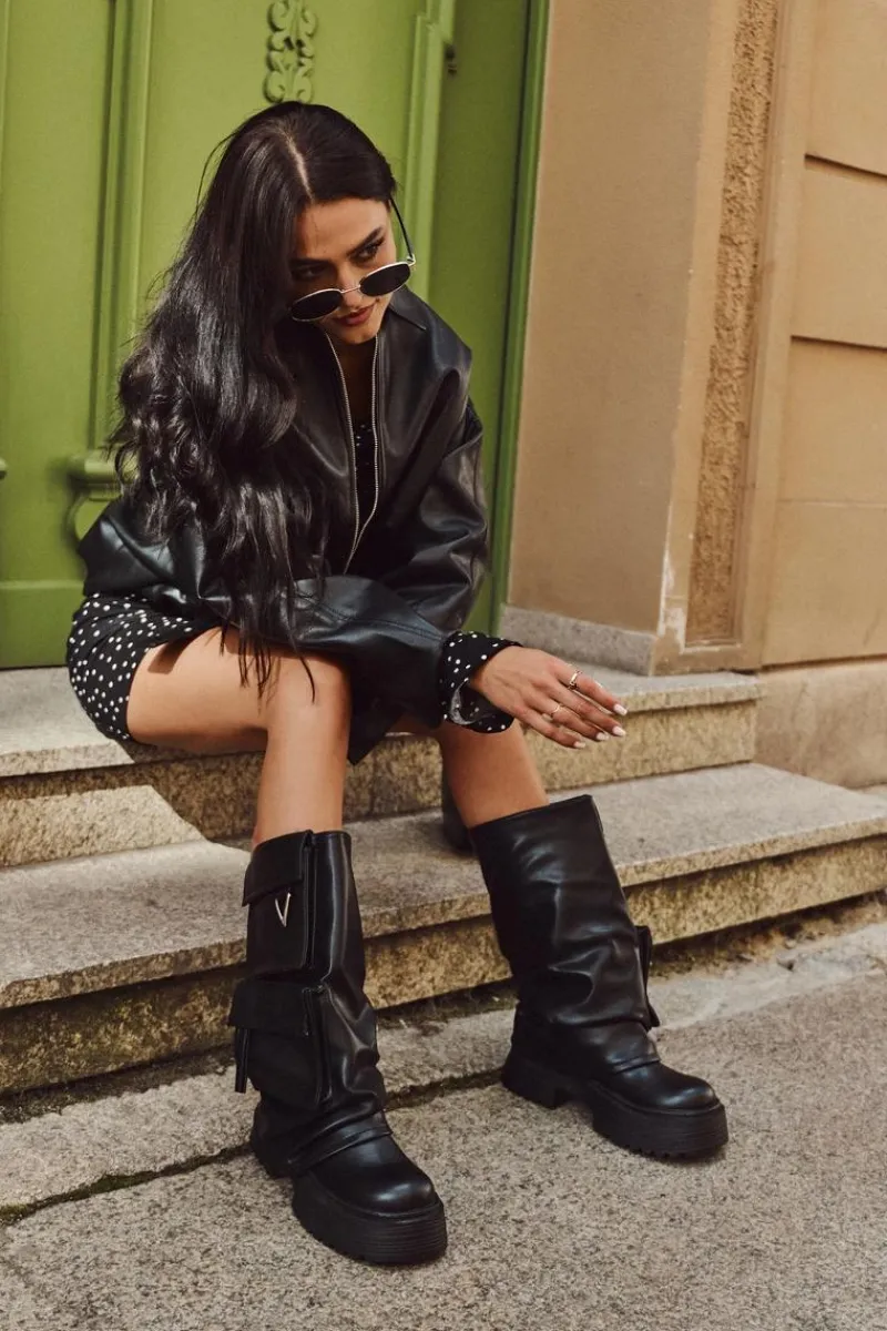 Kozaki damskie wykonane z wysokiej jakości eko skóry to idealny wybór dla kobiet, które cenią nowoczesny design i wygodę. Wsuwany fason ułatwia zakładanie i doskonale dopasowuje się do nogi, a masywna platforma gwarantuje stabilność i komfort podczas noszenia, jednocześnie dodając butom wyrazistego charakteru. Model wyróżnia się efektowną, wywiniętą cholewką oraz kieszeniami, które nadają całości oryginalnego i niebanalnego wyglądu. Stylowy fason sprawia, że kozaki te świetnie wpisują się w aktualne trendy i będą mocnym akcentem w codziennych, miejskich stylizacjach. Doskonale prezentują się zarówno w zestawieniu z dopasowanymi spodniami, jak i z krótkimi sukienkami czy spódnicami. Przy wyborze rozmiaru prosimy sugerować się tabelą rozmiarów.