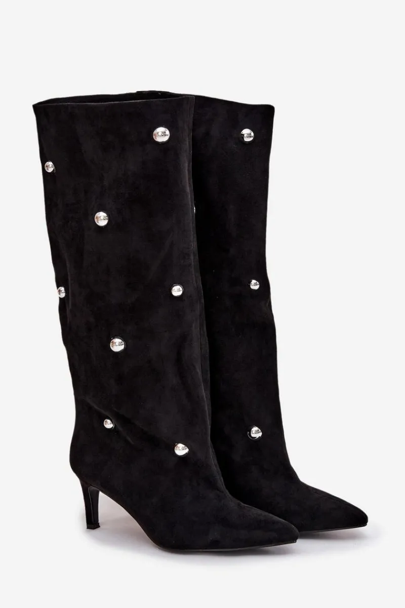 Wsuwane kozaki damskie na szpilce ze złotymi ozdobami czarne Thaliane