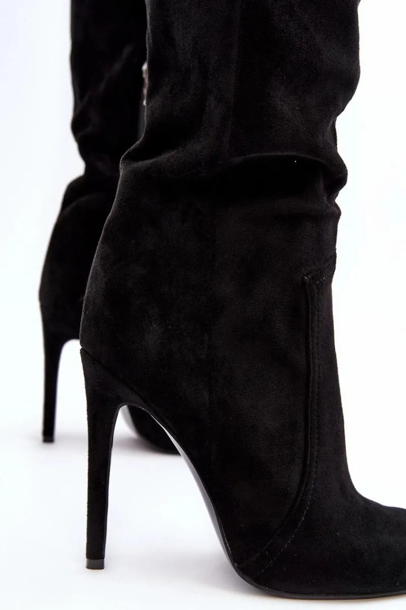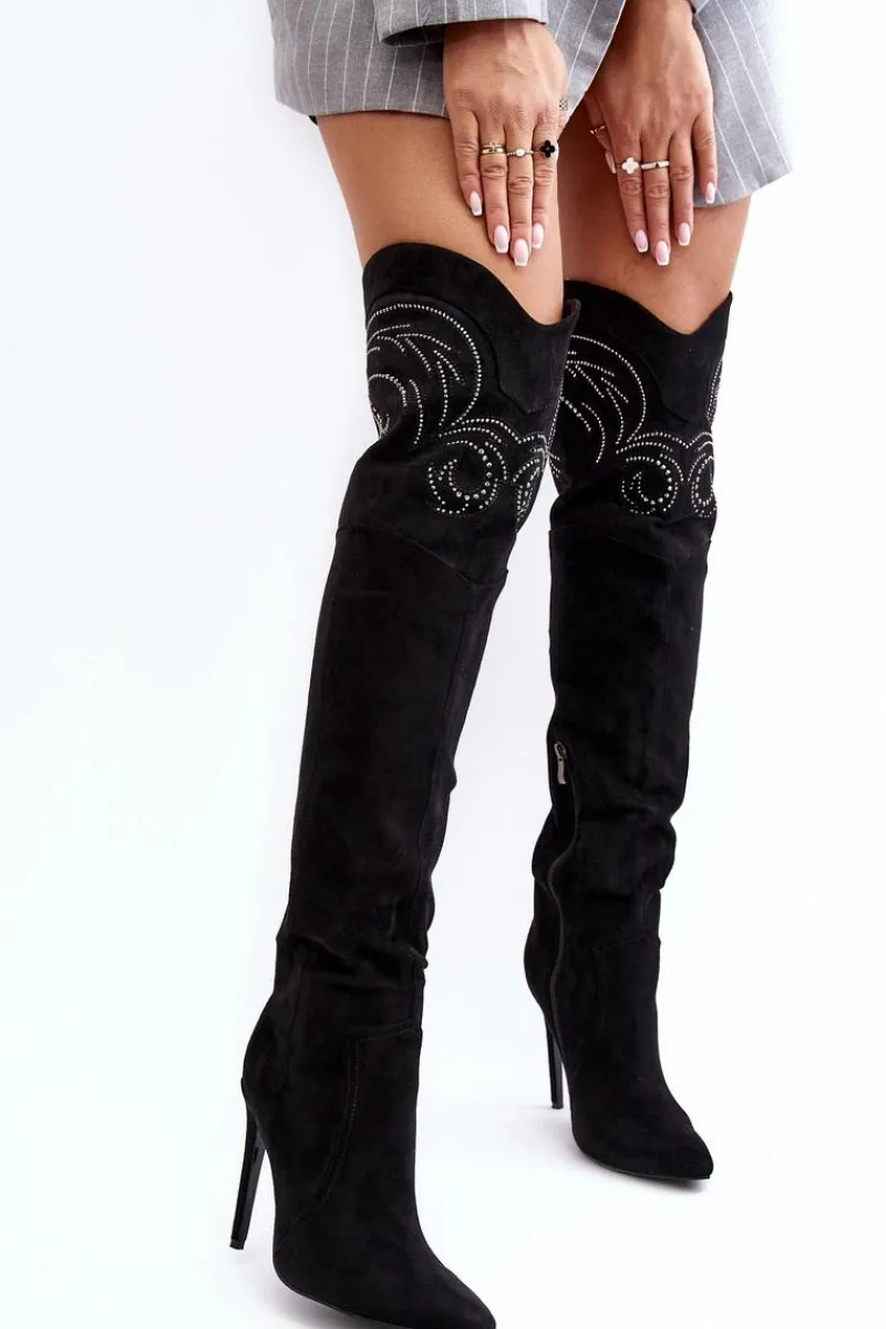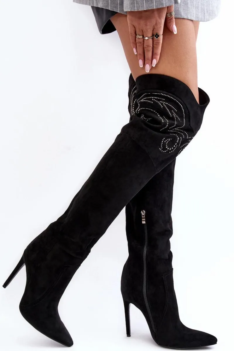 Kozaki damskie z wysoką cholewką za kolano. Osadzone na obcasie w postaci szpilki. Wykonane z eko zamszu. Model wsuwany z dodatkowym zapięciem na suwak. Noski w szpic optycznie wysmuklą nogi. Wnętrze lekko ocieplone, miłym w dotyku kocem obuwniczym. Zapiętek usztywniony. Góra cholewki ozdobiona przeszyciami i dżetami. Koniecznie musisz mieć ten model w swojej garderobie! Przy wyborze rozmiaru prosimy kierować tabelą rozmiarów.